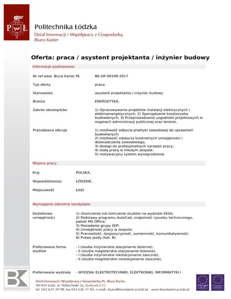 Oferta: praca / asystent projektanta / inżynier budowy Informacje podstawowe: Nr ref.wew. Biura Karier PŁ BK-OP-00199-2017 Typ oferty praca Stanowisko asystent projektanta / inżynier budowy Branża ENERGETYKA, Zakres obowiązków 1) Opracowywanie projektów instalacji elektrycznych i elektroenergetycznych; 2) Sporządzanie kosztorysów budowlanych; 3) Przeprowadzanie uzgodnień projektowych w organach administracji publicznej oraz terenie. Pracodawca oferuje 1) możliwość odbycia praktyki zawodowej do uprawnień budowlanych; 2) możliwość zdobycia konkretnych umiejętności i doświadczenia zawodowego; 3) dostęp do profesjonalnych narzędzi pracy; 4) stałą pracę w młodym zespole. 5) motywacyjny system wynagrodzenia Miejsce pracy: Kraj POLSKA, Województwo(a) ŁÓDZKIE, Miejscowość Łódź Wymaganie odnośnie kandydata: Dodatkowe umiejętności 1) Ukończenie lub kończenie studiów na wydziale EEIiA; 2) Podstawy programu AutoCad, znajomość rysunku technicznego, pakiet MS Office; 3) Posiadanie grupy SEP; 4) Umiejętność pracy w zespole; 5) Pracowitość, dyspozycyjność, sumienność, komunikatywność; 6) Prawo jazdy (kat. B). Preferowana forma studiów - Preferowane wydziały - WYDZIAŁ ELEKTROTECHNIKI, ELEKTRONIKI, INFORMATYKI I I (studia inżynierskie stacjonarne dzienne), II (studia magisterskie stacjonarne dzienne), I (studia inżynierskie niestacjonarne zaoczne), II (studia magisterskie niestacjonarne zaoczne), AUTOMATYKI, - WYDZIAŁ ORGANIZACJI I ZARZĄDZANIA, Preferowane kierunki - ELEKTROTECHNIKA, ENERGETYKA, ZARZĄDZANIE, ZARZĄDZANIE I MARKETING, Dane kontaktowe: Nazwa firmy/Pracodawcy Kraj Województwo Miasto Adres Kod pocztowy MPKG Elektroenergetyka POLSKA ŁÓDZKIE Łódź ul. Wólczańska 12 90-732 Ł&o Sposób aplikacji: CV na pocztę e-mail: [email protected], telefonicznie Data umieszczenia: Oferta ważna od 30-01-2017 do 30-03-2017 Politechnika Łódzka, jest wpisana pod numerem 2414 do rejestru podmiotów prowadzących agencje zatrudnienia.