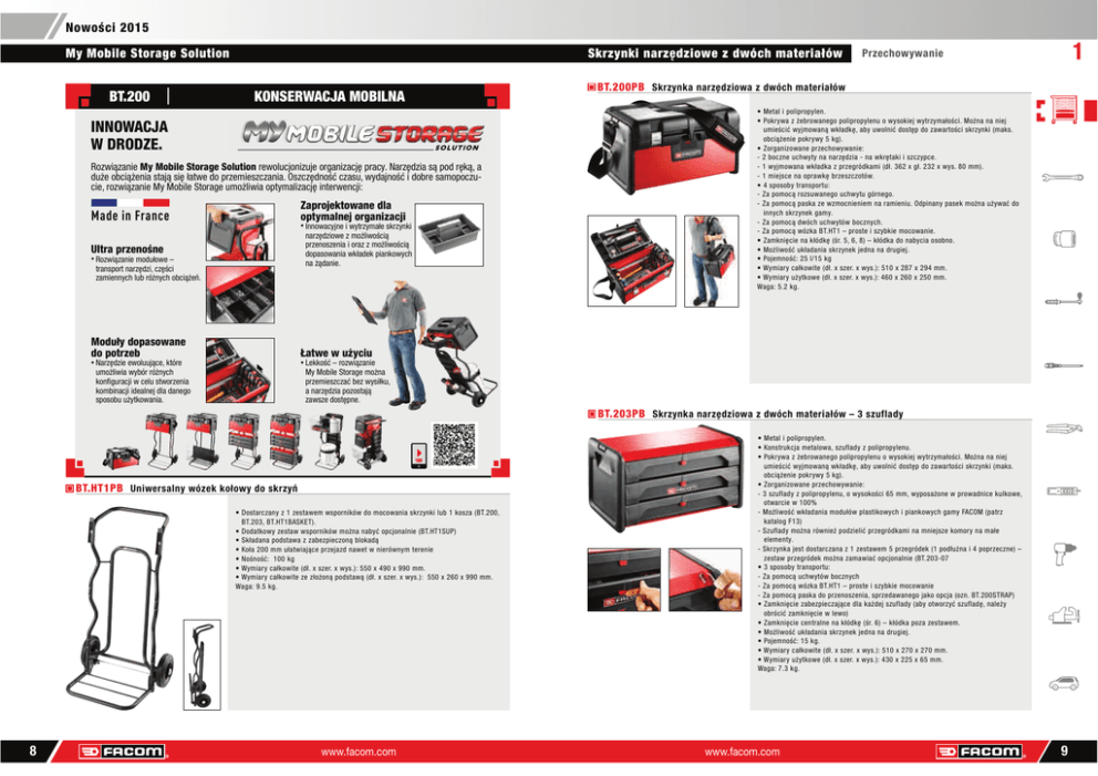 Nowości 2015 My Mobile Storage Solution BT.200 Skrzynki narzędziowe z dwóch materiałów KONSERWACJA MOBILNA INNOWACJA W DRODZE. 5R]ZLÇ]DQLHMy Mobile Storage Solution UHZROXFMRQL]XMHRUJDQL]DFMÙSUDF\1DU]ÙG]LDVÇSRGUÙNÇD GXĝHREFLÇĝHQLDVWDMÇVLÙîDWZHGRSU]HPLHV]F]DQLD2V]F]ÙGQRĂÉF]DVXZ\GDMQRĂÉLGREUHVDPRSRF]X FLHUR]ZLÇ]DQLH0\0RELOH6WRUDJHXPRĝOLZLDRSW\PDOL]DFMÙLQWHUZHQFML Zaprojektowane dla optymalnej organizacji Made in France ō,QQRZDF\MQHLZ\WU]\PDîHVNU]\QNL narzędziowe z możliwością przenoszenia i oraz z możliwością dopasowania wkładek piankowych na żądanie. Ultra przenośne ō5R]ZLÇ]DQLHPRGXîRZHŋ transport narzędzi, części ]DPLHQQ\FKOXEUöĝQ\FKREFLÇĝHð Moduły dopasowane do potrzeb 1 Przechowywanie BT.200PB Skrzynka narzędziowa z dwóch materiałów -------------------------------------------------------------------------------------------------------------------------------------------------------------------------------------------------------------------------------------------------------------------------------------------------------------------------------------------------------------------------------------------------------------------------------------------------------------------------------------------------------------------------------------------------------------------------------------------------------------------------------------------------------------------------------------------------------------------------------------------------------------------------------------------------------------------------------------------------------------------------------------------------------------------------------------------------------------------------------------------------------------------------------------- ō0HWDOLSROLSURS\OHQ ō3RNU\ZD]ĝHEURZDQHJRSROLSURS\OHQXRZ\VRNLHMZ\WU]\PDîRĂFL0RĝQDQDQLHM XPLHĂFLÉZ\MPRZDQÇZNîDGNÙDE\XZROQLÉGRVWÙSGR]DZDUWRĂFLVNU]\QNLPDNV REFLÇĝHQLHSRNU\Z\NJ ō=RUJDQL]RZDQHSU]HFKRZ\ZDQLH ERF]QHXFKZ\W\QDQDU]ÙG]LDQDZNUÙWDNLLV]F]\SFH Z\MPRZDQDZNîDGND]SU]HJUöGNDPLGî[Jî[Z\VPP PLHMVFHQDRSUDZNÙEU]HV]F]RWöZ ōVSRVRE\WUDQVSRUWX =DSRPRFÇUR]VXZDQHJRXFKZ\WXJöUQHJR =DSRPRFÇSDVND]HZ]PRFQLHQLHPQDUDPLHQLX2GSLQDQ\SDVHNPRĝQDXĝ\ZDÉGR innych skrzynek gamy. =DSRPRFÇGZöFKXFKZ\WöZERF]Q\FK =DSRPRFÇZö]ND%7+7ŋSURVWHLV]\ENLHPRFRZDQLH ō=DPNQLÙFLHQDNîöGNÙĂUŋNîöGNDGRQDE\FLDRVREQR ō0RĝOLZRĂÉXNîDGDQLDVNU]\QHNMHGQDQDGUXJLHM ō3RMHPQRĂÉONJ ō:\PLDU\FDîNRZLWHGî[V]HU[Z\V[[PP ō:\PLDU\Xĝ\WNRZHGî[V]HU[Z\V[[PP :DJDNJ Łatwe w użyciu ō1DU]ÙG]LHHZROXXMÇFHNWöUH ō/HNNRĂÉŋUR]ZLÇ]DQLH XPRĝOLZLDZ\EöUUöĝQ\FK konfiguracji w celu stworzenia NRPELQDFMLLGHDOQHMGODGDQHJR VSRVREXXĝ\WNRZDQLD 0\0RELOH6WRUDJHPRĝQD SU]HPLHV]F]DÉEH]Z\VLîNX a narzędzia pozostają zawsze dostępne. BT.203PB Skrzynka narzędziowa z dwóch materiałów – 3 szuflady -------------------------------------------------------------------------------------------------------------------------------------------------------------------------------------------------------------------------------------------------------------------------------------------------------------------------------------------------------------------------------------------------------------------------------------------------------------------------------------------------------------------------------------------------------------------------------------------------------------------------------------------------------------------------------------------------------------------------------------------------------------------------------------------------------------------------------------------------------------------------------------------------------------------------------------------------------------------------------------------------------------------------------------- BT.HT1PB Uniwersalny wózek kołowy do skrzyń -------------------------------------------------------------------------------------------------------------------------------------------------------------------------------------------------------------------------------------------------------------------------------------------------------------------------------------------------------------------------------------------------------------------------------------------------------------------------------------------------------------------------------------------------------------------------------------------------------------------------------------------------------------------------------------------------------------------------------------------------------------------------------------------------------------------------------------------------------------------------------------------------------------------------------------------------------------------------------------------------------------------------------------- ō'RVWDUF]DQ\]]HVWDZHPZVSRUQLNöZGRPRFRZDQLDVNU]\QNLOXENRV]D%7 %7%7+7%$6.(7 ō'RGDWNRZ\]HVWDZZVSRUQLNöZPRĝQDQDE\ÉRSFMRQDOQLH%7+7683 ō6NîDGDQDSRGVWDZD]]DEH]SLHF]RQÇEORNDGÇ ō.RîDPPXîDWZLDMÇFHSU]HMD]GQDZHWZQLHUöZQ\PWHUHQLH ō1RĂQRĂÉNJ ō:\PLDU\FDîNRZLWHGî[V]HU[Z\V[[PP ō:\PLDU\FDîNRZLWH]H]îRĝRQÇSRGVWDZÇGî[V]HU[Z\V[[PP :DJDNJ 8 www.facom.com ō0HWDOLSROLSURS\OHQ ō.RQVWUXNFMDPHWDORZDV]XIODG\]SROLSURS\OHQX ō3RNU\ZD]ĝHEURZDQHJRSROLSURS\OHQXRZ\VRNLHMZ\WU]\PDîRĂFL0RĝQDQDQLHM XPLHĂFLÉZ\MPRZDQÇZNîDGNÙDE\XZROQLÉGRVWÙSGR]DZDUWRĂFLVNU]\QNLPDNV REFLÇĝHQLHSRNU\Z\NJ ō=RUJDQL]RZDQHSU]HFKRZ\ZDQLH V]XIODG\]SROLSURS\OHQXRZ\VRNRĂFLPPZ\SRVDĝRQHZSURZDGQLFHNXONRZH RWZDUFLHZ 0RĝOLZRĂÉZNîDGDQLDPRGXîöZSODVWLNRZ\FKLSLDQNRZ\FKJDP\)$&20SDWU] NDWDORJ) 6]XIODG\PRĝQDUöZQLHĝSRG]LHOLÉSU]HJUöGNDPLQDPQLHMV]HNRPRU\QDPDîH elementy. 6NU]\QNDMHVWGRVWDUF]DQD]]HVWDZHPSU]HJUöGHNSRGîXĝQDLSRSU]HF]QHŋ ]HVWDZSU]HJUöGHNPRĝQD]DPDZLDÉRSFMRQDOQLH%7 ōVSRVRE\WUDQVSRUWX =DSRPRFÇXFKZ\WöZERF]Q\FK =DSRPRFÇZö]ND%7+7ŋSURVWHLV]\ENLHPRFRZDQL