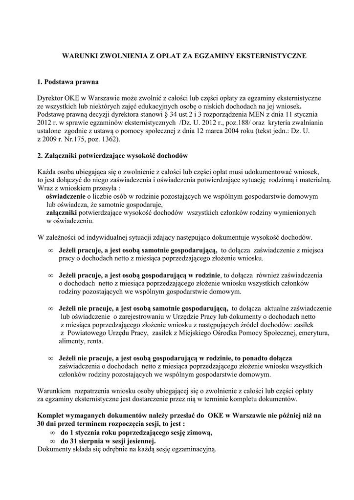 WARUNKI ZWOLNIENIA Z OPŁAT ZA EGZAMINY EKSTERNISTYCZNE 1. Podstawa prawna Dyrektor OKE w Warszawie może zwolnić z całości lub części opłaty za egzaminy eksternistyczne ze wszystkich lub niektórych zajęć edukacyjnych osobę o niskich dochodach na jej wniosek. Podstawę prawną decyzji dyrektora stanowi § 34 ust.2 i 3 rozporządzenia MEN z dnia 11 stycznia 2012 r. w sprawie egzaminów eksternistycznych /Dz. U. 2012 r., poz.188/ oraz kryteria zwalniania ustalone zgodnie z ustawą o pomocy społecznej z dnia 12 marca 2004 roku (tekst jedn.: Dz. U. z 2009 r. Nr.175, poz. 1362). 2. Załączniki potwierdzające wysokość dochodów Każda osoba ubiegająca się o zwolnienie z całości lub części opłat musi udokumentować wniosek, to jest dołączyć do niego zaświadczenia i oświadczenia potwierdzające sytuację rodzinną i materialną. Wraz z wnioskiem przesyła : oświadczenie o liczbie osób w rodzinie pozostających we wspólnym gospodarstwie domowym lub oświadcza, że samotnie gospodaruje, załączniki potwierdzające wysokość dochodów wszystkich członków rodziny wymienionych w oświadczeniu. W zależności od indywidualnej sytuacji zdający następująco dokumentuje wysokość dochodów. • Jeżeli pracuje, a jest osobą samotnie gospodarującą, to dołącza zaświadczenie z miejsca pracy o dochodach netto z miesiąca poprzedzającego złożenie wniosku. • Jeżeli pracuje, a jest osobą gospodarującą w rodzinie, to dołącza również zaświadczenia o dochodach netto z miesiąca poprzedzającego złożenie wniosku wszystkich członków rodziny pozostających we wspólnym gospodarstwie domowym. • Jeżeli nie pracuje, a jest osobą samotnie gospodarującą, to dołącza aktualne zaświadczenie lub oświadczenie o zarejestrowaniu w Urzędzie Pracy lub dokumenty o dochodach netto z miesiąca poprzedzającego złożenie wniosku z następujących źródeł dochodów: zasiłek z Powiatowego Urzędu Pracy, zasiłek z Miejskiego Ośrodka Pomocy Społecznej, emerytura, alimenty, renta. • Jeżeli nie pracuje, a jest osobą gospodarującą w rodzinie, to ponadto dołącza zaświadczenia o dochodach netto z miesiąca poprzedzającego złożenie wniosku wszystkich członków rodziny pozostających we wspólnym gospodarstwie domowym. Warunkiem rozpatrzenia wniosku osoby ubiegającej się o zwolnienie z całości lub części opłaty za egzaminy eksternistyczne jest dostarczenie przez nią w terminie kompletu dokumentów. Komplet wymaganych dokumentów należy przesłać do OKE w Warszawie nie później niż na 30 dni przed terminem rozpoczęcia sesji, to jest : • do 1 stycznia roku poprzedzającego sesję zimową, • do 31 sierpnia w sesji jesiennej. Dokumenty składa się odrębnie na każdą sesję egzaminacyjną. 3. Kryteria zwalniania W całości z opłat może zostać zwolniona: • osoba niepracująca, która do wniosku dołączy aktualne zaświadczenie / oświadczenie o zarejestrowaniu w Urzędzie Pracy lub dowód pobierania zasiłku dla bezrobotnych, • osoba samotnie gospodarująca, jeżeli potwierdzi zaświadczeniem o dochodach netto z miesiąca poprzedzającego złożenie wniosku, że jej dochód netto nie przekracza 542 zł., • osoba gospodarująca w rodzinie, jeżeli dochód netto na osobę we wspólnym gospodarstwie domowym nie przekracza 456 zł., co potwierdzi zaświadczeniami o dochodach netto od wszystkich pracujących członków rodziny i oświadczeniem o liczbie członków rodziny pozostających we wspólnym gospodarstwie. Z części opłat w wysokości 50 % może zostać zwolniona: • osoba samotnie gospodarująca, jeżeli potwierdzi zaświadczeniem o dochodach netto z miesiąca poprzedzającego złożenie wniosku, że jej dochód netto nie przekracza 1084 zł., • osoba gospodarująca w rodzinie, jeżeli dochód netto na osobę we wspólnym gospodarstwie domowym nie przekracza 912 zł., co potwierdzi zaświadczeniami o dochodach netto od wszystkich pracujących członków rodziny i oświadczeniem o liczbie członków rodziny pozostających we wspólnym gospodarstwie. Osoba ubiegająca się o zwolnienie z opłat dołącza dokumenty o dochodach netto z miesiąca poprzedzającego złożenie wniosku z następujących źródeł dochodów: praca, zasiłek z Powiatowego Urzędu Pracy, zasiłek z Miejskiego Ośrodka Pomocy Społecznej, emerytura, renta, alimenty. Wniosek o zwolnienie z opłat znajduje się na stronach internetowych OKE w formie załączników do procedur.