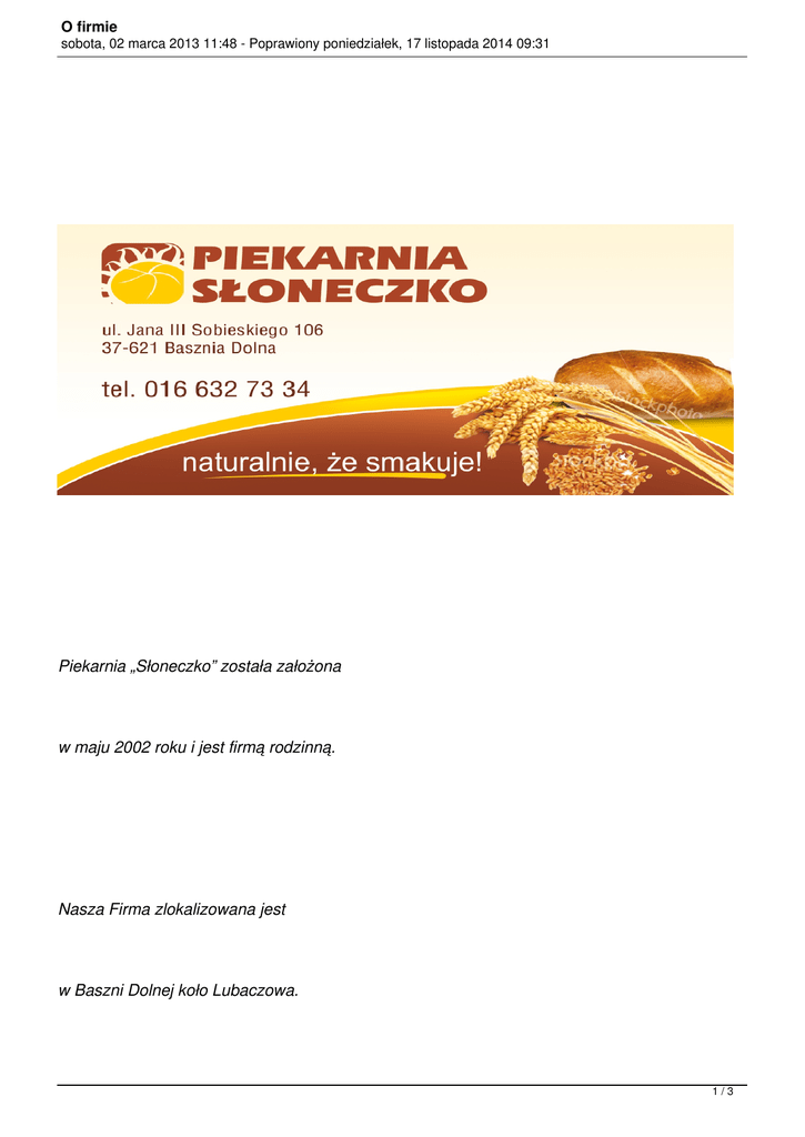O firmie sobota, 02 marca 2013 11:48 - Poprawiony poniedziałek, 17 listopada 2014 09:31 Piekarnia „Słoneczko” została założona w maju 2002 roku i jest firmą rodzinną. Nasza Firma zlokalizowana jest w Baszni Dolnej koło Lubaczowa. 1/3 O firmie sobota, 02 marca 2013 11:48 - Poprawiony poniedziałek, 17 listopada 2014 09:31 Piekarnia „Słoneczko” wyposażona jest w nowoczesne linie produkcyjne, w naszej produkcji wykorzystujemy tylko naturalne produkty (nie używamy polepszaczy do wypieku pieczywa). Ciągle się rozwijamy i zwiększamy swój asortyment, przez cały okres działalności inwestujemy w nowe maszyny i nowe technologie nie zapominając o tradycyjnych recepturach. Nasza działalności nie ogranicza się do wypieku pieczywa, rozszerzyliśmy ja również o wyroby cukiernicze. Można u nas zamówić torty, ciasta i ciasteczka. Jesteśmy jedną z najszybciej rozwijających się piekarni w województwie podkarpackim. 2/3 O firmie sobota, 02 marca 2013 11:48 - Poprawiony poniedziałek, 17 listopada 2014 09:31 3/3