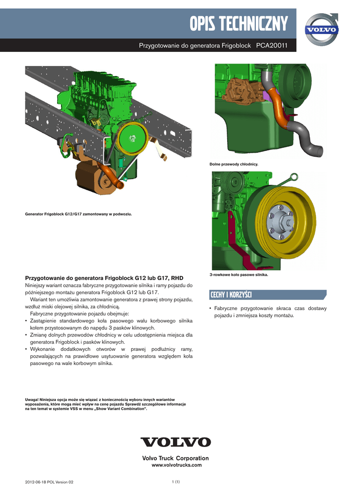 Opis techniczny Przygotowanie do generatora Frigoblock PCA20011 Dolne przewody chłodnicy. Generator Frigoblock G12/G17 zamontowany w podwoziu. Przygotowanie do generatora Frigoblock G12 lub G17, RHD Niniejszy wariant oznacza fabryczne przygotowanie silnika i ramy pojazdu do późniejszego montażu generatora Frigoblock G12 lub G17. Wariant ten umożliwia zamontowanie generatora z prawej strony pojazdu, wzdłuż miski olejowej silnika, za chłodnicą. Fabryczne przygotowanie pojazdu obejmuje: • Zastąpienie standardowego koła pasowego wału korbowego silnika kołem przystosowanym do napędu 3 pasków klinowych. • Zmianę dolnych przewodów chłodnicy w celu udostępnienia miejsca dla generatora Frigoblock i pasków klinowych. • Wykonanie dodatkowych otworów w prawej podłużnicy ramy, pozwalających na prawidłowe usytuowanie generatora względem koła pasowego na wale korbowym silnika. Uwaga! Niniejsza opcja może się wiązać z koniecznością wyboru innych wariantów wyposażenia, które mogą mieć wpływ na cenę pojazdu Sprawdź szczegółowe informacje na ten temat w systemie VSS w menu „Show Variant Combination”. 2012-06-18 POL Version 02 1 (1) 3-rowkowe koło pasowe silnika. Cechy i korzyści • Fabryczne przygotowanie skraca czas dostawy pojazdu i zmniejsza koszty montażu.