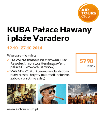 KUBA Pałace Hawany i plaże Varadero 19.10 - 27.10.2014 W programie m.in.: HAWANA (kolonialna starówka, Plac Rewolucji, mohito z Hemingway'em, pałace Cukrowych Baronów) VARADERO (turkusowa woda, drobny biały piasek, bogaty pakiet all inclusive, zabawa w rytmie salsy) www.airtoursclub.pl 5790 PLN/os