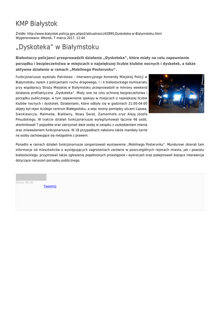 KMP Białystok Źródło: http://www.bialystok.policja.gov.pl/po2/aktualnosci/42895,Dyskoteka-w-Bialymstoku.html Wygenerowano: Wtorek, 7 marca 2017, 12:44 „Dyskoteka” w Białymstoku Białostoccy policjanci przeprowadzili działania „Dyskoteka”, które miały na celu zapewnienie porządku i bezpieczeństwa w miejscach o największej liczbie klubów nocnych i dyskotek, a także aktywne działanie w ramach „Mobilnego Posterunku”. Funkcjonariusze wydziału Patrolowo - Interwencyjnego Komendy Miejskiej Policji w Białymstoku razem z policjantami ruchu drogowego, I i II białostockiego komisariatu przy współpracy Straży Miejskiej w Białymstoku przeprowadzili w miniony weekend działania profilaktyczne „Dyskoteka”. Miały one na celu ochronę bezpieczeństwa i porządku publicznego, w tym zapewnienie spokoju w miejscach o największej liczbie klubów nocnych i dyskotek. Działaniami, które odbyły się w godzinach 21:00-04:00 objęty był rejon ścisłego centrum Białegostoku, a więc tereny pomiędzy ulicami Lipowa, Sienkiewicza, Malmeda, Białówny, Nowy Świat, Zamenhofa oraz Aleją Józefa Piłsudskiego. W trakcie działań funkcjonariusze wylegitymowali łącznie 46 osób, skontrolowali 7 pojazdów oraz zatrzymali dwie osoby w związku z uszkodzeniem mienia oraz znieważeniem funkcjonariusza. W 18 przypadkach nałożono także mandaty karne na osoby zachowujące się niezgodnie z prawem. Ponadto w ramach działań funkcjonariusze zorganizowali wystawienie „Mobilnego Posterunku”. Mundurowi zbierali tam informacje od mieszkańców o występujących zagrożeniach zarówno w poszczególnych rejonach miasta, jak i powiatu białostockiego, przyjmowali także zgłoszenia popełnionych przestępstw i wykroczeń oraz podejmowali bieżące interwencje dotyczące naruszeń porządku publicznego. Ocena: 0/5 (0) Tweetnij
