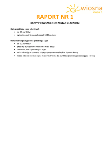 RAPORT NR 1 KAŻDY PIERWSZAK CHCE ZOSTAD SIŁACZKIEM Opis przebiegu zajęd lekcyjnych do 50 punktów opis nie powinien przekraczad 1800 znaków Dokumentacja zdjęciowa przebiegu zajęd do 50 punktów prosimy o przysłanie maksymalnie 5 zdjęd oceniane jest 5 pierwszych zdjęd za każde zdjęcie powyżej piątego przyznawany będzie 1 punkt karny każde zdjęcie oceniane jest maksymalnie na 10 punktów (liczy się jakośd zdjęcia i treśd) RAPORT NR 2 PIRAMIDA ZDROWIA PIERWSZOKLASISTY Opis przebiegu zajęd lekcyjnych do 50 punktów opis nie powinien przekraczad 1800 znaków Dokumentacja zdjęciowa przebiegu zajęd do 50 punktów prosimy o przysłanie maksymalnie 5 zdjęd oceniane jest 5 pierwszych zdjęd za każde zdjęcie powyżej piątego przyznawany będzie 1 punkt karny każde zdjęcie oceniane jest maksymalnie na 10 punktów (liczy się jakośd zdjęcia i treśd) RAPORT NR 3 KONKURS: ZAŁOŻENIE I PROWADZENIE UPRAWY ZIÓŁ W KLASOWYM OGRÓDKU ZIOŁOWYM Opis promocji upraw w szkole do 25 punktów opis nie powinien przekraczad 1800 znaków dobrze byłoby udokumentowad działania promocyjne zdjęciami prosimy o przysłanie maksymalnie 5 zdjęd oceniane jest 5 pierwszych zdjęd za każde zdjęcie powyżej piątego przyznawany będzie 1 punkt karny Zdjęcia przedstawiające zakładanie ogródka oraz etap koocowy upraw do zdobycia 50 punktów prosimy o przysłanie maksymalnie 10 zdjęd oceniane jest 10 pierwszych zdjęd za każde zdjęcie powyżej dziesiątego przyznawany będzie 1 punkt karny każde zdjęcie oceniane jest maksymalnie na 5 punktów (liczy się jakośd zdjęcia i treśd) Zdjęcia lub skany dziennika obserwacji do 25 punktów ocenie podlegad będzie sposób prowadzenia dziennika prosimy o przysłanie maksymalnie 5 zdjęd oceniane jest 5 pierwszych zdjęd za każde zdjęcie powyżej piątego przyznawany będzie 1 punkt karny każde zdjęcie oceniane jest maksymalnie na 5 punktów (liczy się jakośd zdjęcia i treśd) RAPORT NR 4 KONKURS: ZDOBYWAMY ODZNAKĘ SUPER KUCHARZYKA ZA NAJLEPSZY RYSUNEK POTRAWY Z DODATKIEM ZIÓŁ Opis promocji „Książki Ziołowych Potraw” do 50 punktów opis nie powinien przekraczad 1800 znaków dobrze byłoby udokumentowad działania promocyjne zdjęciami prosimy o przysłanie maksymalnie 5 zdjęd oceniane jest 5 pierwszych zdjęd za każde zdjęcie powyżej piątego przyznawany będzie 1 punkt karny Zdjęcie zwycięskiego rysunku do 25 punktów ocenie podlegad będzie propozycja potrawy i szata graficzna prosimy o przysłanie maksymalnie 5 zdjęd oceniane jest 5 pierwszych zdjęd za każde zdjęcie powyżej piątego przyznawany będzie 1 punkt karny Zdjęcia pozostałych stron Książki Śniadaniowej do 25 punktów prosimy o przysłanie maksymalnie 5 zdjęd oceniane jest 5 pierwszych zdjęd za każde zdjęcie powyżej piątego przyznawany będzie 1 punkt karny każde zdjęcie oceniane jest maksymalnie na 5 punktów (liczy się jakośd zdjęcia i treśd) RAPORT NR 5 KONKURS: NAJCIEKAWSZA PRACA PRZEDSTAWIAJĄCA PIRAMIDĘ ZDROWIA Z HASŁEM PROMUJĄCYM PRAWIDŁOWE ODŻYWIANIE I PROPAGUJĄCYM AKTYWNY TRYB ŻYCIA Opis promocji plakatów z Piramidą w szkole do 50 punktów opis nie powinien przekraczad 1800 znaków dobrze byłoby udokumentowad działania promocyjne zdjęciami prosimy o przysłanie maksymalnie 5 zdjęd oceniane jest 5 pierwszych zdjęd za każde zdjęcie powyżej piątego przyznawany będzie 1 punkt karny Zdjęcie zwycięskiej Piramidy do 25 punktów ocenie podlegad będzie treśd plakatu oraz szata graficzna prosimy o przysłanie maksymalnie 5 zdjęd oceniane jest 5 pierwszych zdjęd za każde zdjęcie powyżej piątego przyznawany będzie 1 punkt karny Zdjęcia pozostałych Piramid do 25 punktów prosimy o przysłanie maksymalnie 5 zdjęd oceniane jest 5 pierwszych zdjęd za każde zdjęcie powyżej piątego przyznawany będzie 1 punkt karny każde zdjęcie oceniane jest maksymalnie na 5 punktów (liczy się jakośd zdjęcia i treśd) RAPORT NR 6 FORUM ZDROWIA DLA RODZICÓW: AKTYWNOŚD RUCHOWA – WAŻNY ELEMENT ZDROWIA I ROZWOJU DZIECKA Przekazanie rodzicom ulotek do 30 punktów opis nie powinien przekraczad 1800 znaków Opis przeprowadzonej prelekcji do 70 punktów opis nie powinien przekraczad 1800 znaków RAPORT NR 7 FORUM ZDROWIA DLA RODZICÓW: JAK POMÓC DZIECKU BYD ZDROWYM? Przekazanie rodzicom ulotek do 30 punktów opis nie powinien przekraczad 1800 znaków Opis przeprowadzonej prelekcji do 70 punktów opis nie powinien przekraczad 1800 znaków