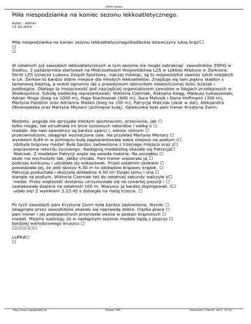 ZSPiG Siedlec Miła niespodzianka na koniec sezonu lekkoatletycznego. Autor: Admin 13.10.2014. Miła niespodzianka na koniec sezonu lekkoatletycznegoSiedleckie dziewczyny lubią brąz! W ostatnich już zawodach lekkoatletycznych w tym sezonie nie mogło zabraknąć zawodników ZSPiG w Siedlcu. 2 października startowali na Mistrzostwach Województwa LZS w Lekkiej Atletyce w Żerkowie. Skrót LZS oznacza Ludowy Zespół Sportowy, inaczej mówiąc, są to wojewódzkie zawody szkół wiejskich w LA. Żerków to bardzo dobre miejsce dla młodych lekkoatletów. Znajduje się tam piękny stadion z tartanową bieżnią, a wokół ogromny las z prawdziwym labiryntem nieskończonej ilości ścieżek i podbiegów. Dlatego ta miejscowość jest najczęściej organizatorem zawodów w biegach przełajowych w Wielkopolsce. Szkołę siedlecką reprezentowali: Wiktoria Czerniak, Roksana Ksiąg, Mateusz Łukaszewski, Adrian Woga (bieg na 1000 m), Maja Stachowiak (600 m), Sara Matysik i Daria Hoffmann (300 m), Martyna Paździor oraz Adrianna Waśko (bieg na 100 m), Patrycja Walczak (skok w dal), Aleksandra Obrempalska oraz Martyna Młynarz (pchnięcie kulą). Opiekunką była pani trener Krystyna Zwirn. Niestety, pogoda nie sprzyjała młodym sportowcom, przeciwnie, jak tylko mogła, tak utrudniała im bicie życiowych rekordów i walkę o medale. Ale nasi zawodnicy są bardzo uparci i, wbrew różnym przeciwnościom, osiągnęli wyznaczone cele. Na przykład Martyna Młynarz wynikiem 8,84 m w pchnięciu kulą zagwarantowała sobie miejsce na podium i zdobyła brązowy medal! Była bardzo zadowolona z trzeciego miejsca oraz z poprawienia rekordu życiowego. Następną medalistką okazała się Patrycja Walczak. Z medalem Patrycji wiąże się wesoła historia. Na początku skoki nie wychodziły tak, jakby chciała. Pani trener wspierała ją podczas konkursu i udzielała jej wskazówek. Przed ostatnim skokiem powiedziała jej, że jeśli skoczy 4.50 m to zdobędzie brązowy krążek. Patrycja posłuchała i skoczyła dokładnie 4.50 m! Dzięki temu i ona stanęła na podium. Wiktoria Czerniak też do ostatniej sekundy walczyła o medal. Przez większość dystansu utrzymywała się na czwartej pozycji i zaatakowała dopiero na ostatnich 100 m. Wszyscy ją bardzo dopingowali. I udało się! Z wynikiem 3.23.45 s dobiegła na metę trzecia. Po tych zawodach pani Krystyna Zwirn była bardzo zadowolona. Wyniki osiągnięte przez zawodników okazały się naprawdę dobre. Ciężka praca pani trener i jej podopiecznych przyniosła owoce w postaci brązowych medali. Miejmy nadzieję, że w następnym sezonie medale będą z jeszcze bardziej wartościowego kruszcu. LUPKA http://www.zspigsiedlec.pl Kreator PDF Utworzono 7 March, 2017, 12:52