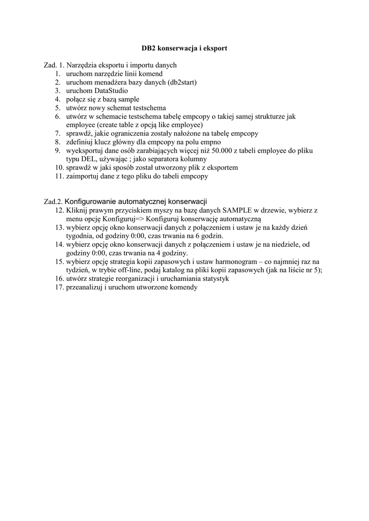 DB2 konserwacja i eksport Zad. 1. Narzędzia eksportu i importu danych 1. uruchom narzędzie linii komend 2. uruchom menadżera bazy danych (db2start) 3. uruchom DataStudio 4. połącz się z bazą sample 5. utwórz nowy schemat testschema 6. utwórz w schemacie testschema tabelę empcopy o takiej samej strukturze jak employee (create table z opcją like employee) 7. sprawdź, jakie ograniczenia zostały nałożone na tabelę empcopy 8. zdefiniuj klucz główny dla empcopy na polu empno 9. wyeksportuj dane osób zarabiających więcej niż 50.000 z tabeli employee do pliku typu DEL, używając ; jako separatora kolumny 10. sprawdź w jaki sposób został utworzony plik z eksportem 11. zaimportuj dane z tego pliku do tabeli empcopy Zad.2. Konfigurowanie automatycznej konserwacji 12. Kliknij prawym przyciskiem myszy na bazę danych SAMPLE w drzewie, wybierz z menu opcję Konfiguruj=> Konfiguruj konserwację automatyczną 13. wybierz opcję okno konserwacji danych z połączeniem i ustaw je na każdy dzień tygodnia, od godziny 0:00, czas trwania na 6 godzin. 14. wybierz opcję okno konserwacji danych z połączeniem i ustaw je na niedziele, od godziny 0:00, czas trwania na 4 godziny. 15. wybierz opcję strategia kopii zapasowych i ustaw harmonogram – co najmniej raz na tydzień, w trybie off-line, podaj katalog na pliki kopii zapasowych (jak na liście nr 5); 16. utwórz strategie reorganizacji i uruchamiania statystyk 17. przeanalizuj i uruchom utworzone komendy