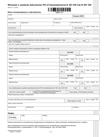 Wniosek o wydanie dokumentu PD U1/zaświadczenia E 301 DK lub N 301 DK EOG 4.4 - 01-2011 Dane wnioskodawcy o zatrudnieniu EØS 4.4 Imiona Nr pers. CPR Nazwisko Kod pocztowy Adres w Danii Miejscowość Adres elektroniczny Nr telefonu dzień miesiąc rok dzień miesiąc rok dzień miesiąc rok dzień miesiąc rok Data urodzenia Obywatelstwo Czy wnioskodawca jest lub był członkiem kasy ubezpieczenia od bezrobocia (a-kasse) w Danii? Tak Nie Tak Nie Jeśli Tak to jakiej/jakich? Czy wnioskodawca prowadził działalność w Danii jako samodzielny przedsiębiorca 1 maja 2010 r. i od tej daty? Jeśli Tak, w ypełnić także stronę 2 Okres i miejsce zatrudnienia w Danii w przeciągu ostatnich 5 lat Nazwa/nazwisko pracodawcy(1) Nr CVR Adres Kod pocztowy Miejsce pracy Od Nazwa/nazwisko pracodawcy(2) dzień Miejscowość miesiąc rok Nr CVR Kod pocztowy Adres dzień Miejsce pracy Miejscowość miesiąc rok Od Nazwa/nazwisko pracodawcy(3) Do Nr CVR Miejscowość Kod pocztowy Adres dzień Miejsce pracy miesiąc rok Od Czy wnioskodawca uzyskał wcześniej dokument PD U1/zaświadczenie E 301 lub N 301 DK? Urząd Pracy (Arbejdsdirektoratet)/Urząd ds. Emerytur i Rent(Pensionsstyrelsen) Jeśli Tak, to kto je wydał? Do Tak Do Nie Kasa ubezp. od bezrobocia (a-kasse) Podaj nazwę kasy ubezp. od bezrobocia W którym kraju EOG ma być użyte zaświadczenie? Data wyjazdu z Danii dzień Adres w danym kraju EOG Kod pocztowy Miejscowość Nr telefonu Podpis Data Podpis Pamiętaj Przes łać formularz do duńskiej kasy ubezpieczenia od bezrobocia, której członkiem wnioskodawca był ostatnio. Jeśli wnioskodawca nie był członkiem kasy ubezpieczenia od bezrobocia, przesłać formularz do: Pensionsstyrelsen, Landemærket 11, DK 1119 Kopenhaga K. Fax +45 3391 5654 Arbejdsmarkedsstyrelsen EOG 4.4 - 01-2011 1/2 miesiąc rok Osoby, które prowadziły samodzielną działalność gospodarczą w Danii wypełniają niniejszą stronę, chyba że zaświadczenie E 301 ma być użyte w jednym z następujących 4 krajów: Norwegia, Islandia, Lichtenstein lub Szwajcaria. Informacje wnioskodawcy o samodzielnej działalności gospodarczej Imiona Nr pers. CPR Nazwisko Kod pocztowy Adres w Danii Miejscowość Adres elektroniczny Nr telefonu Obywatelstwo Data urodzenia Czy wnioskodawca jest lub był członkiem kasy ubezpieczenia od bezrobocia (a-kasse) w Danii? Tak dzień miesiąc rok Nie Jeśli tak to jakiej/jakich? Okresy, w jakich była prowadzona samodzielna działalność gospodarcza w Danii Nazwa przedsiębiorstwa (1) Nr CVR Kod pocztowy Adres przedsiębiorstwa Branża Miejscowość dzień miesiąc rok Od Nazwa przedsiębiorstwa (2) Do dzień miesiąc rok Nr CVR Kod pocztowy Adres przedsiębiorstwa Branża Miejscowość dzień miesiąc rok dzień miesiąc rok Od Do Nazwa przedsiębiorstwa (3) Nr CVR Adres przedsiębiorstwa Kod pocztowy Branża Miejscowość dzień miesiąc rok dzień miesiąc rok Do Od Czy zaprzestanie samodzielnej działalności w Danii jest ostateczne? Tak Nie Jeśli tak, podać powód zaprzestania działalności W którym kraju EOG ma służyć zaświadczenie Data wyjazdu z Danii Adres w danym kraju EOG Kod pocztowy Miejscowość Nr telefonu Podpis Data Podpis Pamiętaj Przesłać formularz do duńskiej kasy ubezpieczenia od bezrobocia, której członkiem wnioskodawca był ostatnio. Jeśli wnioskodawca nie był członkiem kasy ubezpieczenia od bezrobocia, przesłać formularz do: Pensionsstyrelsen, Landemærket 11, DK 1119 Kopenhaga K. Fax +45 3391 5654 Arbejdsmarkedsstyrelsen EOG 4.4 - 01-2011 2/2 dzień miesiąc rok