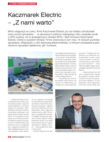 Z ŻYCIA I POGRANICZA BRANŻY Kaczmarek Electric – „Z nami warto” Mimo stagnacji na rynku, firma Kaczmarek Electric po raz kolejny odnotowała duży wzrost sprzedaży − w pierwszym półroczu bieżącego roku uzyskała wynik o 22% wyższy, niż w analogicznym okresie 2015 r. Sieć hurtowni Kaczmarek Electric rośnie w szybkim tempie. Firma otworzyła w tym roku 14 nowych punktów sprzedaży. Większość z nich stanowią elektromarkety, w których prowadzona jest zarówno sprzedaż detaliczna, jak i hurtowa. zuje projekt pozyskiwania partnerów biznesowych pod hasłem „Z nami warto”. Kaczmarek Electric kieruje swoją ofertę współpracy zarówno do osób posiadających doświadczenie w branży, które dopiero myślą o własnym biznesie, jak też do tych, które już prowadzą lokalne hurtownie, ale chcą wejść na wyższy poziom i dalej rozwijać się u boku silnego partnera. − „Wcześniej przez sześć lat prowadziłem własny biznes i nie ukrywam, że miałem obawy, czy odnajdę się w takiej organizacji jako ajent. Z drugiej strony wiedziałem już, że małej firmie trudno konkurować na rynku, a praca z dużym partnerem, ze znaną renomowaną firmą, otwiera zupełnie nowe możliwości” – mówi Michał Jarzębski, agent szczecińskiego oddziału Kaczmarek Electric. − „Najważniejsze były dla mnie: nieograniczony dostęp do produktów i towarów w konkurencyjnych cenach oraz przejrzyste warunki współpracy. To mnie przekonało, a także rozpoznawalność marki i renoma spółki. Jako Fot. 1. Centrum Logistyczne Kaczmarek Electric w Powodowie − „Rośnie konkurencja w branży elektrotechnicznej, klienci są coraz bardziej świadomi, mają coraz wyższe oczekiwania, a my chcemy sprostać tym potrzebom. Wprowadziliśmy własną formułę elektromarketów, podnosząc w ten sposób poziom obsługi i komfort klienta. W tradycyjnej hurtowni zazwyczaj nie widzi się towarów, bo dostęp do magazynu jest ograniczony. W elektromarkecie cały asortyment mamy na wyciągnięcie ręki, z wyjątkiem oczywiście artykułów wielkogabarytowych i zamówień specjalnych, które dowożo66 Elektroinstalator 6/2016 ne są z magazynu centralnego lub od producenta bezpośrednio do odbiorców. Taka formuła sprzedaży jest atrakcyjna i wygodna zarówno dla detalistów, jak i profesjonalistów, którzy mogą sami wybierać towary „z półki” lub czekając na przygotowanie zamówienia, oglądać i porównywać oferowane artykuły, obejrzeć z bliska produktowe nowości i przy dobrej kawie wymienić opinie z naszymi sprzedawcami i kolegami z branży” – mówi prezes firmy Cezary Kaczmarek. Od kilku miesięcy firma reali- Fot. 2. Cezary Kaczmarek – Prezes Kaczmarek Electric S.A. że potencjalni partnerzy zgłaszają się do na za późno, gdy lokalizacja, w której chcieli otworzyć swój oddział, jest zajęta przez kogoś, kto zgłosił się wcześniej. Jeśli więc ktoś myśli o dołączeniu do nas, nie powinien zwlekać, ale jak najszybciej nawiązywać z nami kontakt” – mówi Joanna Bąk, Dyrektor Działu Rozwoju KE S.A. Nowe oddziały Kaczmarek Electric pojawiły się w Szczecinie przy ul. Leszczynowej 22, 13, a drugi na Os. Bohaterów Września 2. − „Coraz więcej handlowców chce z nami współpracować, bo naprawdę „Z nami warto”. Zależy nam na sukcesie partnera i pomagamy mu w osiągnięciu tego celu. Sami też czerpiemy z tego korzyści, ale zawsze na partnerskich zasadach. Dajemy wyjątkowe zaplecze i wsparcie – logistyczne, marketingowe, eksperckie, tak aby nasi handlowcy mogli skupić się wyłącznie na sprzedaży i zadowo- Fot. 3. Kaczmarek Electric – Oddział Szczecin Prezes zapowiada, że jeszcze w tym roku powstaną kolejne elektromarkety Kaczmarek Electric. Firma rozpoczęła w tym roku także nowe duże inwestycje – rozbudowuje swoje centrum logistyczne w Powodowie. właściciel małej firmy nie mogłem marzyć o dostępie do takich warunków handlowych, jakie mam tutaj” – dodaje Michał Jarzębski. − „Odzew na nasze zaproszenie do współpracy w ramach projektu „Z nami warto” jest naprawdę duży. Chociaż projekt aktywnego pozyskiwania partnerów biznesowych realizujemy właściwie dopiero od ok. dziesięciu miesięcy, coraz częściej zdarza się, Fot. 4. Obsługa klientów w Oddziale Szczecin Fot. 5. Zaplecze magazynowe w Oddziale Szczecin w Olecku w Centrum Handlowym Impuls, w Kościelisku koło Zakopanego przy ul. Nędzy Kubińca 264, w Warszawie przy ul. Sobieskiego 74/78, w Garwolinie w Centrum Handlowym przy ul. Kościuszki 49J, w Słupcy przy ul. Makuszyńskiego 15, w Kępnie przy ul. Kwiatowej 25, w Koninie przy ul. Karola Kurpińskiego 6/11, w Warce przy ul. F. Nowakowskiego 2/8, w Tarnowie Podgórnym przy ul. Poznańskiej 40F/2, w Gdańsku przy ul. Piaskowej 8 oraz w Rzeszowie przy ul. Wspólnej 4. W Krakowie powstały dwa nowe elektomarkety − jeden na Os. Złotej Jesieni lić najbardziej wymagającego klienta. Dla nas liczą się ludzie, jesteśmy normalni, życzliwi i pełni pasji, mamy opinię przyjaznego partnera i to przyciąga do nas ludzi” – mówi Cezary Kaczmarek. Prezes zapowiada, że jeszcze w tym roku powstaną kolejne elektromarkety Kaczmarek Electric. Firma rozpoczęła w tym roku także nowe duże inwestycje – rozbudowuje swoje centrum logistyczne w Powodowie i wprowadza nowe rozwiązania, które mają jeszcze usprawnić obsługę oddziałów i samych klientów. ■ www.elektroinstalator.com.pl (KE) 67