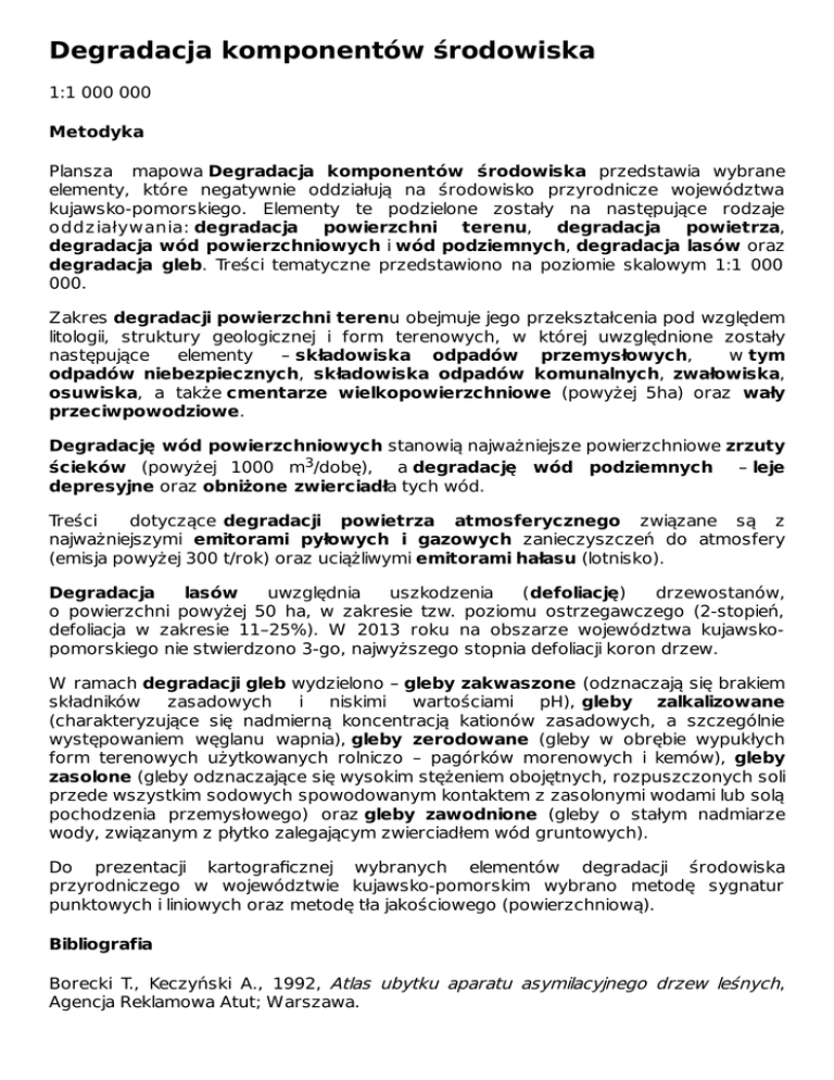 Degradacja komponentów środowiska 1:1 000 000 Metodyka Plansza mapowa Degradacja komponentów środowiska przedstawia wybrane elementy, które negatywnie oddziałują na środowisko przyrodnicze województwa kujawsko-pomorskiego. Elementy te podzielone zostały na następujące rodzaje oddz iaływania: degradacja powierzchni terenu, degradacja powietrza, degradacja wód powierzchniowych i wód podziemnych, degradacja lasów oraz degradacja gleb. Treści tematyczne przedstawiono na poziomie skalowym 1:1 000 000. Zakres degradacji powierzchni terenu obejmuje jego przekształcenia pod względem litologii, struktury geologicznej i form terenowych, w której uwzględnione zostały następujące elementy – składowiska odpadów przemysłowych, w tym odpadów niebezpiecznych, składowiska odpadów komunalnych, zwałowiska, osuwiska, a także cmentarze wielkopowierzchniowe (powyżej 5ha) oraz wały przeciwpowodziowe. Degradację wód powierzchniowych stanowią najważniejsze powierzchniowe zrzuty ścieków (powyżej 1000 m3/dobę), a degradację wód podziemnych – leje depresyjne oraz obniżone zwierciadła tych wód. Treści dotyczące degradacji powietrza atmosferycznego związane są z najważniejszymi emitorami pyłowych i gazowych zanieczyszczeń do atmosfery (emisja powyżej 300 t/rok) oraz uciążliwymi emitorami hałasu (lotnisko). Degradacja lasów uwzględnia uszkodzenia (defoliację) drzewostanów, o powierzchni powyżej 50 ha, w zakresie tzw. poziomu ostrzegawczego (2-stopień, defoliacja w zakresie 11–25%). W 2013 roku na obszarze województwa kujawskopomorskiego nie stwierdzono 3-go, najwyższego stopnia defoliacji koron drzew. W ramach degradacji gleb wydzielono – gleby zakwaszone (odznaczają się brakiem składników zasadowych i niskimi wartościami pH), gleby zalkalizowane (charakteryzujące się nadmierną koncentracją kationów zasadowych, a szczególnie występowaniem węglanu wapnia), gleby zerodowane (gleby w obrębie wypukłych form terenowych użytkowanych rolniczo – pagórków morenowych i kemów), gleby zasolone (gleby odznaczające się wysokim stężeniem obojętnych, rozpuszczonych soli przede wszystkim sodowych spowodowanym kontaktem z zasolonymi wodami lub solą pochodzenia przemysłowego) oraz gleby zawodnione (gleby o stałym nadmiarze wody, związanym z płytko zalegającym zwierciadłem wód gruntowych). Do prezentacji kartograficznej wybranych elementów degradacji środowiska przyrodniczego w województwie kujawsko-pomorskim wybrano metodę sygnatur punktowych i liniowych oraz metodę tła jakościowego (powierzchniową). Bibliografia Borecki T., Keczyński A., 1992, Atlas ubytku aparatu asymilacyjnego drzew leśnych, Agencja Reklamowa Atut; Warszawa. Dąbkowska-Naskręt H., Jaworska H., Malczyk P., 2011, Zmiany stanu środowiska glebowego w warunkach oddziaływania przemysłu cementowo-wapienniczego w latach 1991–2011 w gminie Barcin, [W:] Jankowski M. (red.), Wybrane problemy genezy, systematyki, użytkowania i ochrony gleb regionu kujawsko-pomorskiego , PTSH Wrocław, PTGleb., Warszawa, s. 159–174. Stan uszkodzenia lasów w Polsce w 2013 roku na podstawie badań monitoringowych , 2014, Raport, IBL, Sękocin Stary, Jankowski M., 2011, Warunki występowania i właściwości gleb ochrowych na stanowisku Jordan w Kotlinie Toruńskiej, [W:] Jankowski M. (red.), Wybrane problemy genezy, systematyki, użytkowania i ochrony gleb regionu kujawsko-pomorskiego , PTSH Wrocław, PTGleb, Warszawa, s. 213–226. Jankowski M., 2014, Bielicowanie jako wtórny proces w glebach rdzawych Brodnickiego Parku Krajobrazowego, [W:] Świtoniak M., Jankowski M., Bednarek R. (red.), Antropogeniczne przekształcenia pokrywy glebowej Brodnickiego Parku Krajobrazowego, Wydawnictwo Naukowe UMK, Toruń, s. 9–24. Mapa sozologiczna województwa kujawsko-pomorskiego w skali 1:50 000 , 2007–2015, GUGiK, Warszawa. Mendyk Ł., Markiewicz M., Jankowski M., Derdzikowski P., 2014, Przekształcenia pokrywy glebowej wskutek odwodnienia, [W:] Świtoniak M., Jankowski M., Bednarek R. ( r ed . ) , Antropogeniczne przekształcenia pokrywy glebowej Brodnickiego Parku Krajobrazowego, Wydawnictwo Naukowe UMK, Toruń, s. 87–111. PTG, 2011, Systematyka gleb Polski, wyd. 5, Rocz. Glebozn., 62, 3. Raport o stanie środowiska województwa kujawsko-pomorskiego w 2013 roku , 2014, Biblioteka Monitoringu Środowiska, Bydgoszcz. Raport o stanie środowiska województwa kujawsko-pomorskiego w 2012 roku , 2013, Biblioteka Monitoringu Środowiska, Bydgoszcz. Stan zabezpieczeń przeciwpowodziowych w województwie kujawsko-pomorskim, 2011, Materiały VI Sesji Sejmiku Województwa, KPZMiUW we Włocławku, Włocławek. Świtoniak M., 2014, Use of soil profile truncation to estimate influence of accelerated erosion on soil cover transformation in young morainic landscapes, North-Eastern Poland, Catena, 116, s. 173–184. Świtoniak M., Bednarek R., 2014. Denudacja antropogeniczna, [W:] Świtoniak M., Jankowski M., Bednarek R. (red.), Antropogeniczne przekształcenia pokrywy glebowej Brodnickiego Parku Krajobrazowego, Wydawnictwo Naukowe UMK, Toruń, s. 57–84. Wytyczne techniczne GIS-4, Mapa sozologiczna Polski, skala 1:50 000 w formie analogowej i numerycznej, 2005, GUGiK, Warszawa. Źródła internetowe: http://geoportal.pgi.gov.pl/css/sopo/mapy/woj_kuj-pomorskie.jpg http://www.kzgw.gov.pl/files/file/Materialy_i_Informacje/WORP/Woj_Kuj/1.jpg http://www.wios.bydgoszcz.pl/ Autorzy Mieczysław Kunz, Rafał Kot, Arkadiusz Krawiec, Marcin Świtoniak, Miłosz Deptuła 17°30' 18°00' J . Karasińskie 18°30' Czarna Woda Br da J . Charzykowskie pomorskie Liwa Czersk J . Dzierzgoń Chojnice Kwidzyn J . J eziorak Nowe J . Żurskie O Wąbrzeźno sła Br da W el W Mrocza J abłonowo Pomorskie Chełmno Koronowo i Nakło nad Notecią J . Chełmżyńskie Chełmża Szamocin 53° 00' Kowalewo Pomorskie Górzno a ęc rw Rypin Golub Dobrzyń TORUŃ Solec Kujawski Szubin Kcynia Lidzbark Brodnica BYDGOSZCZ ć Note 