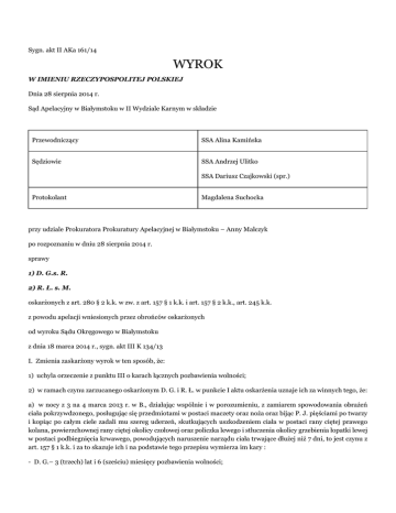Sygn. akt II AKa 161/14 WYROK W IMIENIU RZECZYPOSPOLITEJ POLSKIEJ Dnia 28 sierpnia 2014 r. Sąd Apelacyjny w Białymstoku w II Wydziale Karnym w składzie Przewodniczący SSA Alina Kamińska Sędziowie SSA Andrzej Ulitko SSA Dariusz Czajkowski (spr.) Protokolant Magdalena Suchocka przy udziale Prokuratora Prokuratury Apelacyjnej w Białymstoku – Anny Malczyk po rozpoznaniu w dniu 28 sierpnia 2014 r. sprawy 1) D. G.s. R. 2) R. Ł. s. M. oskarżonych z art. 280 § 2 k.k. w zw. z art. 157 § 1 k.k. i art. 157 § 2 k.k., art. 245 k.k. z powodu apelacji wniesionych przez obrońców oskarżonych od wyroku Sądu Okręgowego w Białymstoku z dnia 18 marca 2014 r., sygn. akt III K 134/13 I. Zmienia zaskarżony wyrok w ten sposób, że: 1) uchyla orzeczenie z punktu III o karach łącznych pozbawienia wolności; 2) w ramach czynu zarzucanego oskarżonym D. G. i R. Ł. w punkcie I aktu oskarżenia uznaje ich za winnych tego, że: a) w nocy z 3 na 4 marca 2013 r. w B., działając wspólnie i w porozumieniu, z zamiarem spowodowania obrażeń ciała pokrzywdzonego, posługując się przedmiotami w postaci maczety oraz noża oraz bijąc P. J. pięściami po twarzy i kopiąc po całym ciele zadali mu szereg uderzeń, skutkujących uszkodzeniem ciała w postaci rany ciętej prawego kolana, powierzchownej rany ciętej okolicy czołowej oraz policzka lewego i stłuczenia okolicy grzebienia łopatki lewej w postaci podbiegnięcia krwawego, powodujących naruszenie narządu ciała trwające dłużej niż 7 dni, to jest czynu z art. 157 § 1 k.k. i za to skazuje ich i na podstawie tego przepisu wymierza im kary : - D. G.– 3 (trzech) lat i 6 (sześciu) miesięcy pozbawienia wolności; - R. Ł. – 3 (trzech) lat pozbawienia wolności; b) w nocy z 3 na 4 marca 2013 r. działając wspólnie i w porozumieniu i z zamiarem spowodowania obrażeń ciała pokrzywdzonego, posługując się przedmiotami w postaci maczety oraz noża oraz bijąc K. J. pięściami po twarzy i kopiąc po całym ciele zadali mu szereg uderzeń, skutkujących uszkodzeniem ciała w postaci licznych ran rąbanych głowy oraz ran ciętych w okolicy barku i ramienia prawego, powodujących naruszenie narządu ciała trwające nie dłużej niż 7 dni, to jest czynu z art. 157 § 2 k.k. i za to skazuje ich i na podstawie tego przepisu wymierza im kary: - D. G.– 1 (jednego) roku i 6 (sześciu) miesięcy pozbawienia wolności; - R. Ł.– 1 (jednego) roku pozbawienia wolności; c) w nocy z 3 na 4 marca w B., działając wspólnie i w porozumieniu: - dokonali przywłaszczenia telefonu komórkowego (...)na szkodę P. J., o wartości nie większej niż 389 zł, która to wartość nie przekraczała ¼ minimalnego wynagrodzenia, to jest wykroczenia z art. 119 § 1 k.w.; - dokonali kradzieży dwóch foteli o nieustalonej wartości, nie przekraczającej jednak ¼ minimalnego wynagrodzenia, stanowiących wyposażenie mieszkania P. J. i K. J., działając w ten sposób na szkodę wyżej wymienionych to jest wykroczenia z art. 119 § 1 k.w.; i za to skazuje ich i na podstawie art. 119 § 1 k.w. w zw. z art. 9 § 2 k.w. wymierza im kary po 30 (trzydzieści) dni aresztu; II. W pozostałej części zaskarżony wyrok utrzymuje w mocy; III. Na podstawie art. 85 k.k. i art. 86 § 1 k.k. orzeczone w pkt II zaskarżonego wyroku Sądu Okręgowego w Białymstoku oraz w pkt I ppkt 2 lit. a i b niniejszego wyroku kary pozbawienia wolności łączy i wymierza wobec oskarżonych kary łączne: - oskarżonemu D. G. – 3 (trzech) lat i 6 (sześciu) miesięcy pozbawienia wolności; - oskarżonemu R. Ł. 3 (trzech) lat pozbawienia wolności; IV. Zasądza od Skarbu Państwa na rzecz Kancelarii Adwokackich adw. S. K. oraz adw. A. O. kwoty po 738 zł, w tym 23% należnego podatku VAT, tytułem wynagrodzenia za obronę oskarżonych z urzędu w postępowaniu odwoławczym; V. Zwalnia oskarżonych od kosztów sądowych postępowania odwoławczego. UZASADNIENIE D. G. i R. Ł. zostali oskarżeni o to , że: I. w dniu 3 marca 2013r. w B. przy ul. (...) działając wspólnie i w porozumieniu ze sobą oraz ustaloną osobą nieletnią dokonali rozboju na osobie P. J. i K. J. w ten sposób, iż R. Ł.wielokrotnie uderzając ostrzem maczety pokrzywdzonego K. J. w głowę, spowodował rany rąbane głowy oraz uderzając ostrzem maczety w okolice fałdu pachowego prawego przedniego spowodował ranę ciętą natomiast pokrzywdzonego P. J. uderzając ostrzem maczety w głowę oraz w prawy staw kolanowy, zaś D. G. posługując się nożem uderzył K. J. w okolicę tylną prawego barku, natomiast pokrzywdzonego P. J. uderzając ostrzem noża w głowę oraz prawy staw kolanowy powodowali rany cięte u w/w/ pokrzywdzonego doprowadzając tym samym pokrzywdzonych do stanu bezbronności, a następnie dokonali zaboru w celu przywłaszczenia telefonu komórkowego (...) o wartości nie większej niż 389 zł oraz stanowiące wyposażenie mieszkania dwa fotele o nieustalonej wartości, w wyniku zdarzenia K. J. doznał obrażeń ciała w postaci licznych ran o charakterze rąbanym na głowie oraz ran ciętych w okolicy barku i ramienia prawego, które to spowodowały naruszenie czynności narządu ciała trwające nie dłużej niż 7 dni, zaś P. J. doznał obrażeń ciała w postaci rany ciętej prawego kolana, rany ciętej okolicy czołowej oraz policzka lewego i stłuczenia okolicy grzebienia łopatki lewej w postaci podbiegnięcia krwawego, które to spowodowały naruszenie czynności narządu ciała trwające dłużej niż 7 dni, tj. o czyn z art. 280 § 2 k.k. w zw. z art. 157 § 1 k.k. i art. 157 § 2 k.k., II. w dniu 3 marca 2013r. w B. przy ul. (...) działając wspólnie i w porozumieniu ze sobą i ustaloną osobą nieletnią wpływał na świadków K. J. i P. J., w ten sposób, że grożąc im zabójstwem zmuszali ich do nie składania obciążających zeznań w prowadzonym postępowaniu przygotowawczym, tj., o czyn z art. 245 k.k. Wyrokiem z dnia 18 marca 2014r., sygn. akt III K 134/13 S