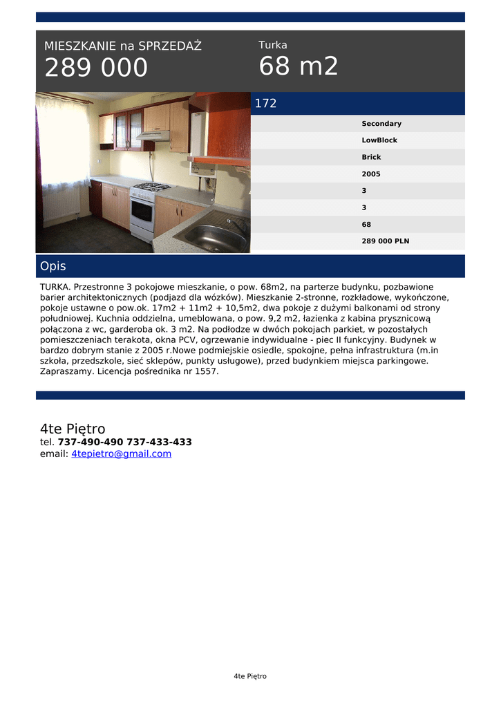 MIESZKANIE na SPRZEDAŻ 289 000 Turka 68 m2 172 Secondary LowBlock Brick 2005 3 3 68 289 000 PLN Opis TURKA. Przestronne 3 pokojowe mieszkanie, o pow. 68m2, na parterze budynku, pozbawione barier architektonicznych (podjazd dla wózków). Mieszkanie 2-stronne, rozkładowe, wykończone, pokoje ustawne o pow.ok. 17m2 + 11m2 + 10,5m2, dwa pokoje z dużymi balkonami od strony południowej. Kuchnia oddzielna, umeblowana, o pow. 9,2 m2, łazienka z kabina prysznicową połączona z wc, garderoba ok. 3 m2. Na podłodze w dwóch pokojach parkiet, w pozostałych pomieszczeniach terakota, okna PCV, ogrzewanie indywidualne - piec II funkcyjny. Budynek w bardzo dobrym stanie z 2005 r.Nowe podmiejskie osiedle, spokojne, pełna infrastruktura (m.in szkoła, przedszkole, sieć sklepów, punkty usługowe), przed budynkiem miejsca parkingowe. Zapraszamy. Licencja pośrednika nr 1557. 4te Piętro tel. 737-490-490 737-433-433 email: [email protected] 4te Piętro Powered by TCPDF (www.tcpdf.org)