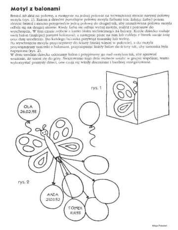 Motyl z balonami Bristol AO zł<>ż n a polowę, a n;1sl.ępn ie na jed nej po!mvic na wcwnc;:trzncj strm: ic nmysuj połowę motyla (rys. 1). Razem z dzleó11i po nrn.lnjcie pol·owę mmyla farbami (nic żałuj<jc farby) potem :r.l'c°i:i.cic bristol i mocno prz.ygnieó:ie jedm! polowę do drugiej m k, aby namalowana połowa motyla odb ib sic;: na drugiej stronie. Kied y l"arba ~ ie odbije ~vytnij motyla, rozl6ż i pozosrnw do wyschnięcia. \\' tym czasi.e ~.róbcie ~. kan ki b loku te chnicznego A4 balon y. Ka żde dziecko maluje swój balon ( najlepiej jasnymi ko!orami), a nastc;:pnic pisze na nim lub 1:akk:j;1 7 lit.erek ~woje in1ię oraz datę urodzcn K Do k;1:i.dego h:<: oni ka przywiąż tasiemkę lub welcę. Po v.yschni~ciu motyla przyc%.e piamy d o .~elany (mniej więcej w połowie}, :,1 do motyla pr~.ywiązujcmy tasiemki z balornu 11L pr-z.yczcpiając każdy b;1lon do .~kiany lak, a by msiemka była naprę:i.ona (rys. 2). W dniu umdzi.n dziec.:k,1 odcinamy balon i przypin;rn1y go nad nroty!e in tak, aby sprawi~1ł wrażenie, że unosi się do góry. Świecowanie tego dnl<r. 1110;).e<:ie us1alk ,,,,.. gru;)ie wsp6lnic, wmto wykor:qstać pomysły dz.i.e c i, one czuj'l ~i<; v-rtcd.y docenione i bard:z.iej i'.:ianga?.owane. rys. 1 rys. 2 Misja Pokoleń