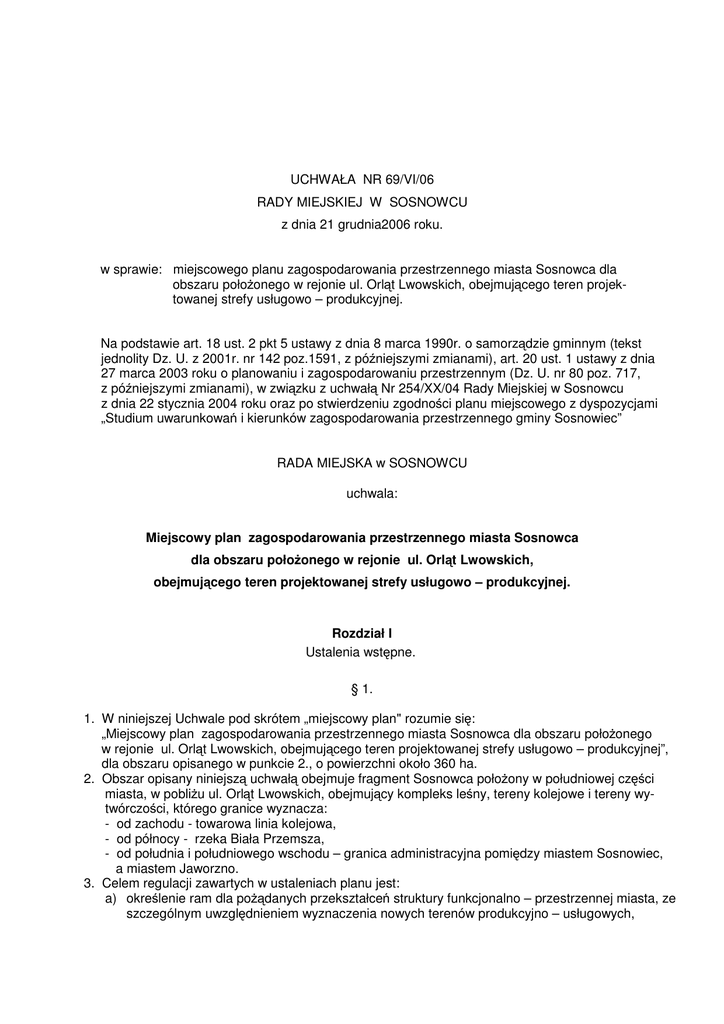 UCHWAŁA NR 69/VI/06 RADY MIEJSKIEJ W SOSNOWCU z dnia 21 grudnia2006 roku. w sprawie: miejscowego planu zagospodarowania przestrzennego miasta Sosnowca dla obszaru połoŜonego w rejonie ul. Orląt Lwowskich, obejmującego teren projektowanej strefy usługowo – produkcyjnej. Na podstawie art. 18 ust. 2 pkt 5 ustawy z dnia 8 marca 1990r. o samorządzie gminnym (tekst jednolity Dz. U. z 2001r. nr 142 poz.1591, z późniejszymi zmianami), art. 20 ust. 1 ustawy z dnia 27 marca 2003 roku o planowaniu i zagospodarowaniu przestrzennym (Dz. U. nr 80 poz. 717, z późniejszymi zmianami), w związku z uchwałą Nr 254/XX/04 Rady Miejskiej w Sosnowcu z dnia 22 stycznia 2004 roku oraz po stwierdzeniu zgodności planu miejscowego z dyspozycjami „Studium uwarunkowań i kierunków zagospodarowania przestrzennego gminy Sosnowiec” RADA MIEJSKA w SOSNOWCU uchwala: Miejscowy plan zagospodarowania przestrzennego miasta Sosnowca dla obszaru połoŜonego w rejonie ul. Orląt Lwowskich, obejmującego teren projektowanej strefy usługowo – produkcyjnej. Rozdział I Ustalenia wstępne. § 1. 1. W niniejszej Uchwale pod skrótem „miejscowy plan" rozumie się: „Miejscowy plan zagospodarowania przestrzennego miasta Sosnowca dla obszaru połoŜonego w rejonie ul. Orląt Lwowskich, obejmującego teren projektowanej strefy usługowo – produkcyjnej”, dla obszaru opisanego w punkcie 2., o powierzchni około 360 ha. 2. Obszar opisany niniejszą uchwałą obejmuje fragment Sosnowca połoŜony w południowej części miasta, w pobliŜu ul. Orląt Lwowskich, obejmujący kompleks leśny, tereny kolejowe i tereny wytwórczości, którego granice wyznacza: - od zachodu - towarowa linia kolejowa, - od północy - rzeka Biała Przemsza, - od południa i południowego wschodu – granica administracyjna pomiędzy miastem Sosnowiec, a miastem Jaworzno. 3. Celem regulacji zawartych w ustaleniach planu jest: a) określenie ram dla poŜądanych przekształceń struktury funkcjonalno – przestrzennej miasta, ze szczególnym uwzględnieniem wyznaczenia nowych terenów produkcyjno – usługowych, b) zapewnienie trwałości procesów przyrodniczych w obrębie korytarzy ekologicznych doliny rzeki Białej Przemszy i terenów leśnych, c) ochrona interesu publicznego w zakresie: - wyznaczenia terenów umoŜliwiających rozwój przestrzenny i ekonomiczny miasta, - rozbudowy układu komunikacyjnego. § 2. 1. Integralnymi częściami miejscowego planu są: a) część tekstowa planu, b) załącznik nr 1, który stanowi Rysunek planu opracowany w skali 1 : 2 000, c) załącznik nr 2, który stanowi Rozstrzygnięcia Rady Miejskiej w Sosnowcu dotyczące sposobu rozpatrzenia uwag i wniosków wniesionych do projektu niniejszego planu w trakcie wyłoŜenia do publicznego wglądu; d) załącznik nr 3, który stanowi Rozstrzygnięcia Rady Miejskiej w Sosnowcu dotyczące sposobu realizacji zapisanych w planie inwestycji z zakresu infrastruktury technicznej, które naleŜą do zadań własnych gminy oraz zasad ich finansowania, zgodnie z przepisami o finansach publicznych. 2. Rysunek planu sporządzono z wykorzystaniem urzędowej kopii mapy zasadniczej i ewidencyjnej w skali 1 : 1000 Powiatowego Zasobu Geodezyjnego i Kartograficznego w Sosnowcu, zawierającej obszar objęty planem wraz z jego niezbędnym otoczeniem, po wykonaniu skanowania tych map (mapa sytuacyjno - wysokościowa i nakładka sieci uzbrojenia technicznego) w celu wykorzystania dla opracowania miejscowego planu zagospodarowania przestrzennego dla terenu połoŜonego w rejonie ul. Orląt Lwowskich w skali 1 : 2000. 3. Po opublikowaniu w Dzienniku Urzędowym Województwa Śląskiego plan (tekst i rysunek planu) zostaje zapisany na nośniku informatycznym w sposób uniemoŜliwiający jakiekolwiek jego zmiany. Zapis ten posiada przymiot oryginału. § 3. Rysunek planu. 1. Rysunek planu w skali 1 : 2 000 obowiązuje w zakresie określonym niniejszą uchwałą. 2. Linie ciągłe rozdzielające tereny o róŜnym przeznaczeniu są obligatoryjne. 3. Podstawę uściślania przebiegu linii rozgraniczających tereny o róŜnym przeznaczeniu stanowi zapis numeryczny rysunku planu, uwzględniający w treści mapę ewidencji gruntów. 4. Obowiązującymi w niniejszym planie są następujące oznaczenia graficzne występujące na rysunku planu: • granica administracyjna miasta, • granice opracowania miejscowego planu zagospodarowania przestrzennego, • linie rozgraniczające tereny o róŜnym przeznaczeniu lub róŜnych zasadach zagospodarowania, • granice terenu górniczego, • granice terenu zamkniętego, • oznaczenia poszczególnych funkcji, • nieprzekraczalne linie zabudowy. 5. Pozostałe oznaczenia graficzne mają charakter informacyjny: - granice własności i numery geodezyjne działek, - obiekty kubaturowe wyburzone lub przeznaczone do wyburzenia, - orientacyjne przebiegi głównych sieci uzbrojenia technicznego (istniejących i projektowanych), - granice zasięgu stref sanitarnych i technicznych (od istniejącej infrastruktury technicznej), 2 6. 7. 8. 9. - zasięg występowania płytkiej eksploatacji węgla kamiennego (do głębokości 50m od powierzchni terenu), - zasięg eksploatacji odkrywkowej węgla kamiennego, - strefa techniczna wylotów wyrobisk górniczych i szybu – teren wyłączony spod zabudowy, - strefa zagroŜenia powodziowego, - strefa ochrony wałów Białej Przemszy, - granice obszaru wymagającego rekultywacji. Obowiązującymi w niniejszym planie są następujące przeznaczenia terenów z odpowiadającymi im oznaczeniami literowymi zastosowanymi w rysunku i tekście planu: PU – teren obiektów produkcyjnych, składów i magazynów oraz usług – w tym tereny logistyczne P(S) – teren obiektów produkcyjnych, składów i magazynów – składowanie MN - tereny zabudowy mieszkaniowej jednorodzinnej ZN – teren zieleni nieurządzonej – do objęcia ochroną prawną ZI – teren zieleni izolacyjnej ZL – lasy Z - tereny zieleni (zadrzewienia