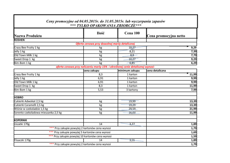 Ceny promocyjne od 04.05.2015r. do 31.05.2015r. lub wyczerpania zapasów *** TYLKO OPAKOWANIA ZBIORCZE*** Ilość Nazwa Produktu Cena 100 Cena promocyjna netto ROSHEN Crazy Bee Frutty 1 kg Jelly 1 kg Old Town Milk 1 kg Sweet Drop 1 kg Bim-Bom 1 kg Crazy Bee Frutty 1 kg Jelly 1 kg Old Town Milk 1 kg Sweet Drop 1 kg Bim-Bom 1 kg Oferta cenowa przy dowolnej marży detalicznej kg 10,27 kg 8,21 kg 8,9 kg 10,27 kg 6,85 oferta cenowa przy naliczeniu marży 15% i określonej cenie detalicznej wynosi: cena zakupu minimum zakupu cena detaliczna 8,3 1 karton 6,91 1 karton 6,91 1 karton 8,3 1 karton 5,53 3 kartony VOBRO Cukierki Adwokat 2,5 kg Cukierki Caramelli 2,5 kg Wiśnie w czekoladzie 1,5 kg Sorento czekoladowa mieszanka 2,5 kg KOPERNIK Uszatki 170g Flisaczki 170g kg kg kg kg 14 *** Przy zakupie powyżej 2 kartonów cena wynosi *** Przy zakupie powyżej 5 kartonów cena wynosi *** Przy zakupie powyżej 10 kartonów cena wynosi 14 *** Przy zakupie powyżej 2 kartonów cena wynosi 9,29 7,39 7,79 9,29 6,29 11,99 9,99 9,99 11,99 7,99 19,99 19,29 29,59 16,03 13,39 13,39 21,99 11,99 3,27 1,89 1,79 1,69 1,59 1,89 1,79 3,55 Całuski 170g *** Przy zakupie powyżej 5 kartonów cena wynosi 14 *** Przy zakupie powyżej 2 kartonów cena wynosi *** Przy zakupie powyżej 5 kartonów cena wynosi 3,65 Nuty Porzeczkowe 160g/22, Morelowe 145g/22 22 ***Przy zakupie 2 kartonów+1 karton gratis cena przeliczeniowa wynosi GOOD SNACK Oferta pakietowa -za zakup 10 różnych opakowań produktów firmy GOOD SNACK KUPIEC Owsianka mix smaków 50g Ryż 4x100 g Ryż paraboliczny 4x100g Ryz brazowy 4x100g Płatki owsiane błyskawiczne 400g Płatki jęczxmienne błyskawiczne 400g Płatki owsiane górskie 400g Płatki owsiane zwykłe 400g 4,81 1,69 1,89 1,79 1,69 3,49 2,32 1 KARTON GRATIS 14 12 12 12 16 16 16 16 1,25 0,89 1,79 2,19 2,19 1,89 1,89 1,89 1,89 2,75 1,75 ***Przy zakupie 1 palety ryżu (1152 sztuki) cena 1,79 oraz faktura marketingowa 100 zł netto Wafle ryżowe *** Przy zakupie 1 palety w mix(672szt) faktura marketingowa 140 zł netto CENOS Kasza mazurska 4x100g Kasza peczak 4x100g Kasza perłowa 4x100g Kasza wiejska 4x100g 12 1,84 1,52 12 1,84 1,52 12 1,84 1,52 12 1,84 1,52 *** przy zakupie 10 zgrzewek powyższego asortymentu -1 zgrzewka gratis Ryż 4x100g 12 2,6 1,79 *** przy zakupie 10 zgrzewek +1 zgrzewka gratis cena przeliczeniowa wynosi tylko 1,63*** przy zakupie 10 zgrzewek +1 zgrzewka gratis cena przeliczeniowa wynosi tylko 1,63 Płatki śniadaniowe mix smaków180g 15 2,39 ***do 10 kartonów w mix 1 karton gratis cena przeliczeniowa wynosi tylko POSTI Herbata rodzinna 3,04 ** *do 10 zgrzewek +1 zgrzewka gratis cena przeliczeniowa wynosi** *do 10 zgrzewek +1 zgrzewka gratis cena przeliczeniowa wynosi 20 2,19 Herbaty ziołowe(pokrzywa,melisa,mieta,rumianek) *** do 6 zgrzewek + 1 zgrzewka gratis cena przeliczeniowa wynosi*** do 6 zgrzewek + 1 zgrzewka gratis cena przeliczeniowa wynosi 20 1,96 Herbaty ex.czarna z cytryną Herbaty ex.czarna z maliną 20 1,96 *** do zakupu 6 zgrzewek +1 zgrzewka gratis cena przeliczeniowa wynosi tylko FOODCARE Cukier puder 400 g ***przy zakupie 10 opakowań +1 zgrzewka gratis cena przeliczeniowa wynosi 12 1,84 1,67 2,19 1,83 1,82 1,59 1,75 1,75 1,5 1,59 1,44 Cappucino La Matine *** przy zakupie 10 opakowań w mix 100g,2w1,3w1 +1 opakowanie kawy 100 g gratis STOVIT Do zakupu 5 zgrzewek marmolady 320 g(truskawka,wieloowocowa) 8 2,51 ***1 zgrzewka gratis cena przeliczeniowa wynosi 30 1,05 Rogaliki kakao,karmwl,wanilia 55g ***zakup 5 kartonów w mix 1,05 *** zakup 10 kartonów w mix 1,05 2,09 1,74 0,89 0,79 0,69 PAMAPOL RUSIECKI OFERTA WAŻNA od 09.05-14.05 Golonka 300g 4 6,54 Kiełbasa podwawelska 280g 4 6,54 Kiełbasa żywiecka 280g 4 6,54 Mięsiwo w sosie własnym 300g 4 6,54 Mieso z szynki 300g 4 6,54 Specjał dworski 300g 4 6,54 4 6,54 Świezonka 300g ***za zakup 12 zgrzewki w mix + 1 zgrzewka Miesa z szynki po 0,01 zł cena przeliczeniowa wynosi 4,99 4,99 4,99 4,99 4,99 4,99 4,99 4,61 KWIDZYN Groszek konserwowy 400g ***przy zakupie 20 zgrzewek cena Kukurydza konserwowa 400g ***przy zakupie 20 zgrzewek cena 10 1,99 10 2,19 1,59 1,25 1,69 1,49 PROVITUS KROS Ryż 4x100g ***przy zakupie powyżej 10 zgrzewek cena Ryż 1 kg ***przy zakupie powyżej 50 kg cena 1,67 3,02 PROFI ZAKUP w mix 10 zgrzewek pasztetów 131g w tym nowośc 4xpo 1 zgrzewce (drobiowy z błonnikiem; z chrzanem;z czarnuszką,oliwkai kapary)+1 zgrzewka gratis cena przeliczeniowa KRAKUS Zakup konserw 300g(golonka,gulasz,mielonk,wieprzowina )w mix paleta (1764 sztuki)cena DROSED OFERTA PAKIETOWA: ***do zakupu 5 zgrzewek pasztetu 155 g plus 5zgrzewek pasztetu 50 g gratis 1 zgrzewka pasztetu 155g cena pasztetu 155g tylko 1,39 1,29 2,39 2,29 1,25 3,99 1,45 0,59 1,21