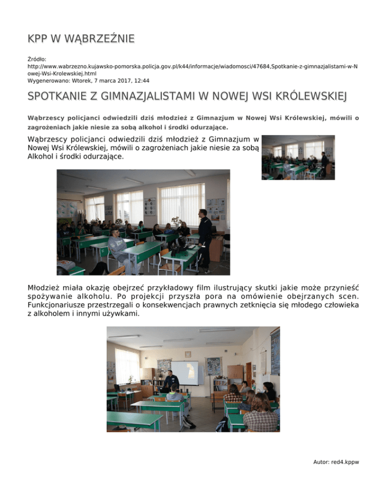 KPP W WĄBRZEŹNIE Źródło: http://www.wabrzezno.kujawsko-pomorska.policja.gov.pl/k44/informacje/wiadomosci/47684,Spotkanie-z-gimnazjalistami-w-N owej-Wsi-Krolewskiej.html Wygenerowano: Wtorek, 7 marca 2017, 12:44 SPOTKANIE Z GIMNAZJALISTAMI W NOWEJ WSI KRÓLEWSKIEJ Wąbrzescy policjanci odwiedzili dziś młodzież z Gimnazjum w Nowej Wsi Królewskiej, mówili o zagrożeniach jakie niesie za sobą alkohol i środki odurzające. Wąbrzescy policjanci odwiedzili dziś młodzież z Gimnazjum w Nowej Wsi Królewskiej, mówili o zagrożeniach jakie niesie za sobą Alkohol i środki odurzające. Młodzież miała okazję obejrzeć przykładowy film ilustrujący skutki jakie może przynieść spożywanie alkoholu. Po projekcji przyszła pora na omówienie obejrzanych scen. Funkcjonariusze przestrzegali o konsekwencjach prawnych zetknięcia się młodego człowieka z alkoholem i innymi używkami. Autor: red4.kppw Publikacja: red4.kppw Ocena: 0/5 (0) Tweetnij
