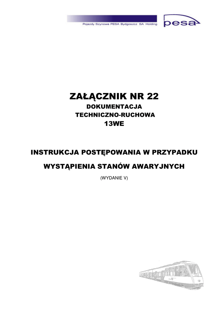 ZAŁĄCZNIK NR 22 DOKUMENTACJA TECHNICZNO-RUCHOWA 13WE INSTRUKCJA POSTĘPOWANIA W PRZYPADKU WYSTĄPIENIA STANÓW AWARYJNYCH (WYDANIE V) INSTRUKCJA POSTĘPOWANIA W PRZYPADKU WYSTĄPIENIA STANÓW AWARYJNYCH ELEKTRYCZNY ZESPÓŁ TRAKCYJNY TYPU 13 WE BYDGOSZCZ 2006 WYDANIE V Najczęściej spotykane awarie elektrycznego zespołu trakcyjnego 13 WE i sposoby ich usuwania. Lp. Usterka Przyczyna Przeciwdziałanie 1 Brak moŜliwości napełnienia 1.Nieprawidłowo załączony pulpit. 2.Uszkodzony obwód elektryczny. powietrzem przewodu głównego 3.Uszkodzony obwód pneumatyczny. 1.Zgodnie z załącznikiem nr 1 sprawdzić wszystkie dźwignie na pulpicie. 2.Sprawdzić w szafie SE przekaźniki: KR-36, KR-38, powinny być załączone, KR-46 powinien być wyłączony. 2 Brak moŜliwości powietrzem zasilającego 1.Sprawdzić na ekranie maszynisty poprawność działania przetwornic zgodnie z załącznikiem nr 2, JeŜeli pracują poprawnie sprawdzić bezpieczniki FA56 w szafie elektrycznej SN. 2.NaleŜy sprawdzić czy wszystkie zawory ręczne od hamulca są ustawione w prawidłowej pozycji. JeŜeli sprawdzono wszystkie ustawienia i w dalszym ciągu nie ma moŜliwości napełnienia przewodu zasilającego. napełnienia 1.Brak pracy dwóch spręŜarek pneumatycznych. przewodu 2.Uszkodzony obwód elektryczny. 3.Uszkodzony obwód pneumatyczny. 4.Brak napięcia 3x400VAC. NALEśY POJAZD HOLOWAĆ WG PKT 21. 3 Pracują tylko niektóre wózki 1.Uszkodzony obwód elektryczny. podczas hamowania hamulcem 2.Uszkodzony obwód pneumatyczny. zespolonym pomimo zadania 3.Uszkodzony główny zawór SW-4. pozycji hamowania lub luzowania np. BP, R lub J JeŜeli pojazd hamuje tylko dwoma wózkami albo tylko trzema naleŜy wyłączyć zawór SW-4 na członie, na którym jest awaria oraz wyluzować cięgłem uszkodzony zawór. Jazda awaryjna powinna odbywać się z uŜyciem hamulca pomocniczego. Przed jazdą naleŜy napełnić przewód główny i zasilający. W przeciwnym wypadku wystąpi jazda zabroniona! Strona 2 Najczęściej spotykane awarie elektrycznego zespołu trakcyjnego 13 WE i sposoby ich usuwania. Lp. Usterka Przyczyna 4 Brak hamowania wszystkich 1.Uszkodzony obwód elektryczny. wózków lub pracują tylko niektóre 2.Uszkodzony obwód pneumatyczny. wózki – podczas hamowania hamulcem dodatkowym – jazda awaryjna 5 Brak moŜliwości pojazdu ustawione dźwignie wyluzowania 1.Nieprawidłowo pulpitach maszynisty. 2.Uszkodzony obwód elektryczny. 3.Uszkodzony obwód pneumatyczny. Przeciwdziałanie W przypadku uszkodzenia hamulca dodatkowego nie będzie moŜna wyluzować uszkodzonego członu. W takim przypadku naleŜy wyłączyć hamulec dodatkowy w szafie pneumatycznej oraz odciąć powietrze od układu sterowania pneumatycznego ręcznie przez zawór. Lokalizacja przełącznika oraz zaworu zgodnie z załącznikiem nr 3. UWAGA! Nie moŜna tylko elektrycznie wyłączyć hamulca dodatkowego. Wyłączenie bezpiecznika FA8 spowoduje zahamowanie pojazdu i brak moŜliwości jego wyluzowania nawet przez hamulec zespolony. na 1.Zgodnie z załącznikiem nr 1 sprawdzić wszystkie dŜwignie na pulpicie. 2.Sprawdzić w szafie SE przekaźniki: KR-36, KR-38 powinny być załączone, KR-46 powinien być wyłączony. JeŜeli ustawienia na pulpicie członu nadrzędnego i członu podrzędnego są prawidłowe, a ponadto przekaźniki KR-36, KR38, KR-46 są w prawidłowym stanie naleŜy wyłączyć zawory SW-4 na dwóch członach wyluzować pojazd za pomocą cięgieł zaworów, jeŜeli pojazd dalej jest w stanie zahamowanym naleŜy wyłączyć hamulec dodatkowy (bezpośredni) na dwóch członach jak w pkt. 4. POJAZD HOLOWAĆ WG PKT 21. Strona 3 Najczęściej spotykane awarie elektrycznego zespołu trakcyjnego 13 WE i sposoby ich usuwania. Lp. Usterka Przyczyna Przeciwdziałanie 6 Wyłączenie ręczne systemu 1.Uszkodzony system bezpieczeństwa CA lub SHP. bezpieczeństwa – jazda awaryjna 2.Uszkodzony obwód pneumatyczny systemu bezpieczeństwa. 3.Uszkodzono jedno z urządzeń bezpieczeństwa. Jazda awaryjna z uszkodzonym system bezpieczeństwa moŜe odbywać się poprzez odcięcie mechanicznie odłącznika SQ43. Zawory upustowe czuwaka CA umieszczone są po prawej stronie obu pulpitów maszynisty Zamknięcie zaworu odłącza elektronikę systemu bezpieczeństwa. UWAGA! Z powodu tego, Ŝe elektrozawór systemu bezpieczeństwa YV89 musi być w normalnej pracy pod napięciem wyłączenie tylko bezpiecznika FA22 systemu bezpieczeństwa nie pozwoli na jazdę awaryjną. 7 Brak moŜliwości podniesienia 1.Uszkodzona spręŜarka pomocnicza członu nadrzędnego. pantografu członu nadrzędnego 2.Uszkodzony czujnik ciśnienia zbiornika pomocniczego. 3.Zbyt niskie napięcie akumulatorów. 4.Uszkodzony pantograf. 5.Uszkodzony ODŁĄCZNIK USZYNIAJĄCY. 6.Niewłaściwe ustawienie przełącznika SA-9 (awaryjne wyłączenie pantografu). Sprawdzić stan zabezpieczenia FA4. NaleŜy opuścić pantografy i ponownie załączyć cały system zasilania w energię elektryczną. W przypadku pojawienia się nieprawidłowego stanu, jazda awaryjna moŜe odbywać się poprzez wyłączenie łącznikiem na pulpicie członu NADRZĘDNEGO pantografu (wyłączenie elektrozaworu YV91) oraz wyłączenie poprzez łączniki w szafie członu NADRZĘDNEGO silników 1 i 2. Jazda awaryjna odbywać się będzie na dwóch silnikach trakcyjnych członu PODRZĘDNEGO. UWAGA! Nie naleŜy wyłączać zabezpieczeń od sterowania falownikami: FA20, FA21. Strona 4 Najczęściej spotykane awarie elektrycznego zespołu trakcyjnego 13 WE i sposoby ich usuwania. Lp. Usterka Przyczyna Przeciwdziałanie 8 Brak moŜliwości podniesienia 1.Brak pracy w systemie wielokrotnym. 2.Uszkodzona spręŜarka pomocnicza. pantografu członu podrzędnego 3.Uszkodzony czujnik ciśnienia zbiornika pomocniczego SP7. 4.Nieprawidłowe ustawienie łącznika sterowania wielokrotnego. 5.Zbyt niskie napięcie akumulatorów. 6.Uszkodzony pantograf. 7.Uszkodzony ODŁĄCZNIK USZYNIAJĄCY. 8.Niewłaściwe ustawienie prze