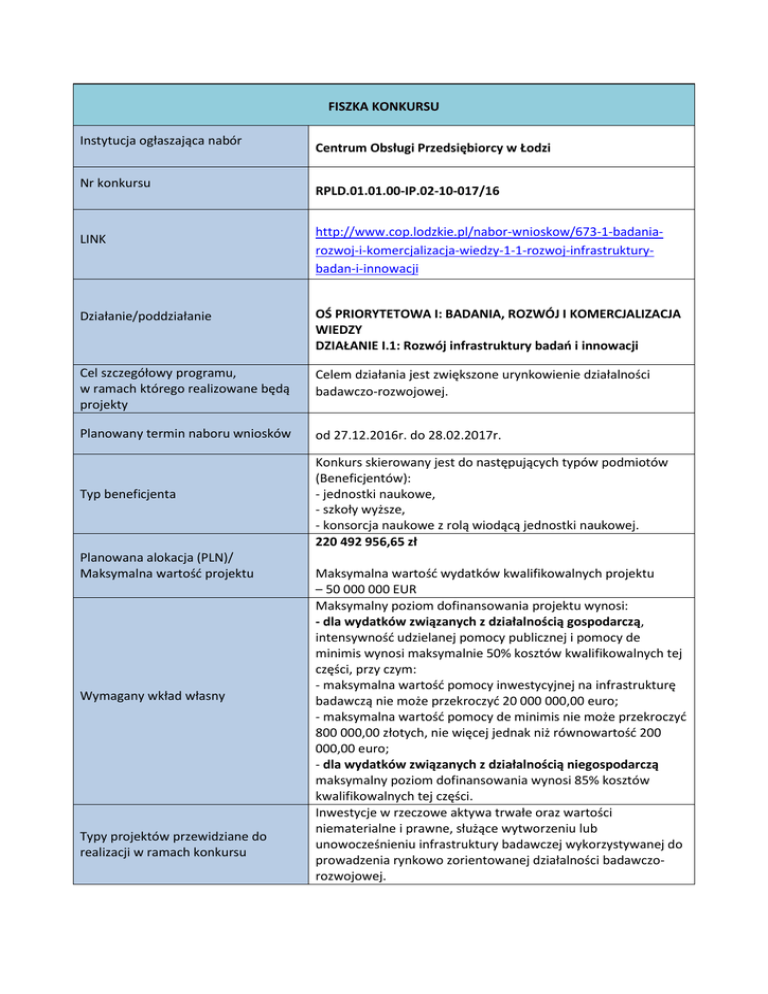 FISZKA KONKURSU Instytucja ogłaszająca nabór Nr konkursu LINK Centrum Obsługi Przedsiębiorcy w Łodzi RPLD.01.01.00-IP.02-10-017/16 http://www.cop.lodzkie.pl/nabor-wnioskow/673-1-badaniarozwoj-i-komercjalizacja-wiedzy-1-1-rozwoj-infrastrukturybadan-i-innowacji Działanie/poddziałanie OŚ PRIORYTETOWA I: BADANIA, ROZWÓJ I KOMERCJALIZACJA WIEDZY DZIAŁANIE I.1: Rozwój infrastruktury badań i innowacji Cel szczegółowy programu, w ramach którego realizowane będą projekty Celem działania jest zwiększone urynkowienie działalności badawczo-rozwojowej. Planowany termin naboru wniosków od 27.12.2016r. do 28.02.2017r. Typ beneficjenta Planowana alokacja (PLN)/ Maksymalna wartość projektu Wymagany wkład własny Typy projektów przewidziane do realizacji w ramach konkursu Konkurs skierowany jest do następujących typów podmiotów (Beneficjentów): - jednostki naukowe, - szkoły wyższe, - konsorcja naukowe z rolą wiodącą jednostki naukowej. 220 492 956,65 zł Maksymalna wartość wydatków kwalifikowalnych projektu – 50 000 000 EUR Maksymalny poziom dofinansowania projektu wynosi: - dla wydatków związanych z działalnością gospodarczą, intensywność udzielanej pomocy publicznej i pomocy de minimis wynosi maksymalnie 50% kosztów kwalifikowalnych tej części, przy czym: - maksymalna wartość pomocy inwestycyjnej na infrastrukturę badawczą nie może przekroczyć 20 000 000,00 euro; - maksymalna wartość pomocy de minimis nie może przekroczyć 800 000,00 złotych, nie więcej jednak niż równowartość 200 000,00 euro; - dla wydatków związanych z działalnością niegospodarczą maksymalny poziom dofinansowania wynosi 85% kosztów kwalifikowalnych tej części. Inwestycje w rzeczowe aktywa trwałe oraz wartości niematerialne i prawne, służące wytworzeniu lub unowocześnieniu infrastruktury badawczej wykorzystywanej do prowadzenia rynkowo zorientowanej działalności badawczorozwojowej. ZAKŁADANE EFEKTY KONKURSU WYRAŻONE WSKAŹNIKAMI OBLIGATORYJNE WSKAŹNIKI Z uwagi na cel Działania I.1 oraz przewidziany do wsparcia typ projektu, Wnioskodawca obligatoryjnie wybiera do realizacji (wskazuje w formularzu wniosku wartość docelową większą od zera) następujące wskaźniki: a) Wzrost przychodów ze źródeł prywatnych b) Liczba naukowców pracujących w ulepszonych obiektach infrastruktury badawczej (CO25) SZCZEGÓŁOWE KRYTERIA WYBORU PROJEKTÓW Wsparciem zostaną objęte przedsięwzięcia, w których wartość wydatków kwalifikowalnych w odniesieniu do części projektu przeznaczonej do wykorzystania gospodarczego i tym samym objęta pomocą publiczną, stanowi co najmniej 30 % wartości całkowitych wartości wydatków kwalifikowalnych w projekcie. Odziaływanie projektu na OSI: Ocenie podlega, czy projekt realizowany jest na terenie Obszarów Strategicznej Interwencji (OSI) oraz czy projekt wpisuje się w strategiczne kierunki działań wskazane w Strategii Rozwoju Województwa Łódzkiego 2020. 2 pkt – projekt realizowany jest na terenie OSI i wpisuje się w strategiczne kierunki działań dla danego OSI , 1 pkt – projekt realizowany jest na terenie OSI , 0 pkt – projekt nie jest realizowany na terenie OSI . KRYTERIA DOSTĘPU Rodzaj badań, którym ma służyć infrastruktura badawcza: 2 pkt – infrastruktura badawcza ma służyć prowadzeniu eksperymentalnych prac rozwojowych, 2 pkt – infrastruktura badawcza ma służyć prowadzeniu badań przemysłowych, 0 pkt – infrastruktura badawcza ma służyć prowadzeniu badań podstawowych. W ramach kryterium punkty podlegają sumowaniu. Wnioskodawca może zdobyć maksymalnie 4 punkty. Udział przedsiębiorców w finansowaniu projektu: 3 pkt – wielkość wkładu przedsiębiorcy wynosi co najmniej 10% kosztów kwalifikowalnych projektu, 0 pkt – wielkość wkładu przedsiębiorcy jest mniejsza niż 10% kosztów kwalifikowalnych projektu. Współpraca w ramach konsorcjów: 4 pkt – udokumentowana współpraca w okresie min. 6 miesięcy licząc wstecz od dnia poprzedzającego ogłoszenie konkursu 2 pkt – planowana współpraca W ramach kryterium punkty podlegają sumowaniu. Wnioskodawca może zdobyć maksymalnie 6 punktów. Wpisywanie się w obszary gospodarcze w ramach nisz specjalizacyjnych: 3 pkt – projekt wpisuje się w co najmniej jeden obszar gospodarczy w ramach niszy specjalizacyjnej, 0 pkt – projekt nie wpisuje się w żaden z obszarów gospodarczych w ramach nisz specjalizacyjnych. Komercyjne wykorzystanie istniejącej infrastruktury B+R: 1 pkt – wnioskodawca podejmował dotychczas działania w zakresie komercyjnego wykorzystania infrastruktury sfinansowanej ze środków publicznych, 0 pkt – wnioskodawca nie podejmował dotychczas działań w zakresie komercyjnego wykorzystania infrastruktury sfinansowanej ze środków publicznych. Ocenie w ramach kryterium podlega, czy: - projekt jest ujęty w Kontrakcie Terytorialnym dla Województwa Łódzkiego oraz został uzgodniony z ministrem właściwym ds. nauki i szkolnictwa wyższego, - spełniony jest warunek, zgodnie z którym wartość pomocy inwestycyjnej na infrastrukturę badawczą nie przekracza 20 mln EUR, tj. progu pomocy powodującego obowiązek zgłoszenia, zgodnie z art. 4 pkt 1 lit. j) Rozporządzenia Komisji (UE) nr 651/2014 z dn. 17 czerwca 2014 r., - wartość wydatków kwalifikowalnych w odniesieniu do części projektu przeznaczonej do wykorzystania gospodarczego i tym samym objęta pomocą publiczną stanowi co najmniej 30% wartości całkowitych wydatków kwalifikowalnych w projekcie, - udział wkładu własnego wnioskodawcy (pochodzącego z własnej działalności gospodarczej wnioskodawcy lub środków prywatnych pochodzących w szczególności z kredytów komercyjnych lub od przedsiębiorstw) w części gospodarczej projektu wynosi minimum 50% wartości całkowitych wydatków kwalifikowalnych w ramach tej części projektu, - udział wkładu własnego wnioskodawcy w części niegospodarczej projektu wynosi c