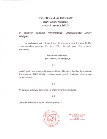u C H WA l A Nr VIII/49/07 Rady Gminy Niebylec z dnia 5 czerwca 2007r. w sprawie Niebylec. nadania Na podstawie o samorzadzie Honorowego Obywatelstwa Gminy art. 18 ust. 2 pkt. 14 ustawy z dnia 8 marca 1990r. gminnym (Dz. U. z 2001 r. Nr 142, poz. 1591 z pózno zmianami), Rada Gminy Niebylec postanawia, § Nadac tytul Honorowego Stanislawowi 1 Obywatela STECHLEMU, co nastepuje: Gminy Niebylec proboszczowi parafii Ksiedzu Niebylec, Kanonikowi dziekanowi czudeckiemu. §2 Wykonanie uchwaly powierza sie Wójtowi Gminy Niebylec. §3 Uchwala wchodzi w zycie z dniem podjecia. PRZEWODNICZACA mJu~ mgrRAlr;~ G~INY LeCZrulr UZASADNIENIE Ksiadz Dziekan Stanislaw Stechly urodzil sie 31 stycznia 1942r. w Ujeznej k. Przeworska. Po ukonczeniu szkoly sredniej wstapil do Wyzszego Seminarium Duchownego w Przemyslu, którego ukonczenie zwienczyl przyjeciem swiecen kaplanskich w dniu 4 czerwca 1967r. z rak KSiedza Biskupa Ordynariusza Ignacego Tokarczuka. jako mlody kaplan zostal poslany w charakterze wikariusza kolejno do Przysietnicy, Zolyni, jasla, Nowej Sarzyny, Kraczkowej i Rudnika n/Sanem. Byl organizatorem parafii Zarnowa i budowniczym tamtejszego kosciola, przebudowal dotychczasowa kaplice na dom katechetyczny i plebanie. Poniósl równiez nieocenione zaslugi w budowie kosciola w Gliniku Zaborowskim. Za ofiarna prace w parafii Zarnowa oraz za prowadzone prace budowlane, w dniu 17 stycznia 1985 roku Biskup Przemyski odznaczyl Dostojnego jubilata przywilejem uzywania ROKIETY i MANTOLETU, na wzór kanoników kapituly katedralnej, wczesniej przyznajac Mu odznaczenie EC. Dnia 18 kwietnia 1988r. Ksiadz Kanonik uhonorowany Kosciola z medalem Zaborowskim. zostal natomiast za wybudowanie Dyplomem kosciolów w Budowniczego Zarnowej i Gliniku W dniu 20 sierpnia 1986r. Ksiadz Stanislaw Stechly zostal mianowany proboszczem parafii p.w. Znalezienia Krzyza swietego w Niebylcu, a kanoniczne objecie parafii nastapilo dnia 14 wrzesnia tegoz roku. juz od pierwszych chwil dal sie poznac jako dobry gospodarz, organizator a w szczególnosci jako wspanialy duszpasterz. Bezposrednio po przybyciu przystapil do odnawiania niebyleckiej swiatyni oraz pozostalych zabudowan parafialnych. Dzieki jego staraniom i zabiegom ukonczono budowe plebani, przeprowadzono zmiane polichromii w kosciele, przebudowano prezbiterium, wykonano witraze oraz zmieniono wnetrze swiatyni, poprzez wykonanie boazerii, nowych lawek, konfesjonalów, stacji drogi krzyzowej oraz przez odnowienie wszystkich trzech oltarzy i zbudowanie kaplicy Matki Bozej. Bardzo powaznym przedsiewzieciem byla zmiana pokrycia dachowego z czesciowa wymiane konstrukcji dachu oraz wykonanie elewacji zewnetrznej kosciola i zbudowanie nowej dzwonnicy. Przeprowadzono równiez zasadnicza zmiane obejscia kosciola, cmentarzy i plebani. Swoja praca, gorliwoscia i oddaniem dla bliznich zyskal wielki autorytet i zyczliwosc wsród parafian oraz szacunek i uznanie u przelozonych. Dnia 7 maja 1991 r. Ksiadz Stanislaw Stechly zostal mianowany wicedziekanem, a od sierpnia 2002r. pelni funkcje dziekana dekanatu czudeckiego. Zasluga Ksiedza Stanislawa jest nie tylko stala troska o dzien dzisiejszy parafii, ale równiez o zachowanie w pamieci jej historii i tradycji. To z jego inspiracji wydana zostala drukiem historia parafii konieczkowsko - niebyleckiej, zywa jest pamiec o Jego poprzednikach, a w miejscu dawnego kosciola w Konieczkowej wybudowano kaplice Milosierdzia Bozego, która poswiecona zostala w dniu 14 listopada 2000r. Trosce o dobytek materialny Kosciola, towarzyszy intensywna i gorliwa praca Ksiedza Dziekana nad stanem duchowym i wlasciwa postawa etyczno moralna parafian. Systematycznie powieksza sie wiec liczba grup parafialnych, rosnie poboznosc parafian, wyrazajaca sie w uczestnictwie w obrzedach religijnych oraz liczbie powolan kaplanskich i zakonnych. Za swoja Kazimierz prace, gorliwosc Górny 24 marca 2007r. i oddanie, mianowal Biskup Rzeszowski Ksiadz Ksiedza Dziekana kanonikiem gremialnym nowo utworzonej Kapituly Kolegiackiej w Strzyzowie. Przypadajaca w biezacym roku 40 rocznica swiecen kaplanskich 21 rocznica oraz pobytu w Niebylcu jest szczególna okazja do zlozenia Ksiedzu Dziekanowi szczególnych wyrazów uznania dla Jego dotychczasowej praC) duszpasterskiej, a nadanie Honorowego Obywatelstwa Gminy Niebylec stanow materialny wyraz tego uznania. PRZEWODNICZACA mgrRApY ~~, GMINY Lecznar