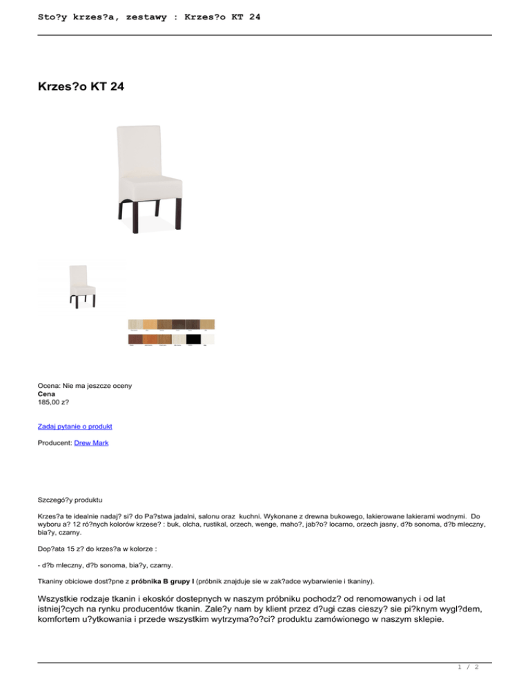 Sto?y krzes?a, zestawy : Krzes?o KT 24 Krzes?o KT 24 Ocena: Nie ma jeszcze oceny Cena 185,00 z? Zadaj pytanie o produkt Producent: Drew Mark Szczegó?y produktu Krzes?a te idealnie nadaj? si? do Pa?stwa jadalni, salonu oraz kuchni. Wykonane z drewna bukowego, lakierowane lakierami wodnymi. Do wyboru a? 12 ró?nych kolorów krzese? : buk, olcha, rustikal, orzech, wenge, maho?, jab?o? locarno, orzech jasny, d?b sonoma, d?b mleczny, bia?y, czarny. Dop?ata 15 z? do krzes?a w kolorze : - d?b mleczny, d?b sonoma, bia?y, czarny. Tkaniny obiciowe dost?pne z próbnika B grupy I (próbnik znajduje sie w zak?adce wybarwienie i tkaniny). Wszystkie rodzaje tkanin i ekoskór dostepnych w naszym próbniku pochodz? od renomowanych i od lat istniej?cych na rynku producentów tkanin. Zale?y nam by klient przez d?ugi czas cieszy? sie pi?knym wygl?dem, komfortem u?ytkowania i przede wszystkim wytrzyma?o?ci? produktu zamówionego w naszym sklepie. 1 / 2 Sto?y krzes?a, zestawy : Krzes?o KT 24 Po wrzuceniu produktu w koszyk w wolnym polu notatki i sugestie prosz? wpisac nazw? wybranej tkaniny. Wysoko??: 95cm Wysoko?? sied: 47cm WYMIARY Szeroko??: 45cm G??boko??: 45cm Pod?okietnik Opinie Nikt jeszcze nie ocenia? tego produktu. 2 / 2 Powered by TCPDF (www.tcpdf.org)