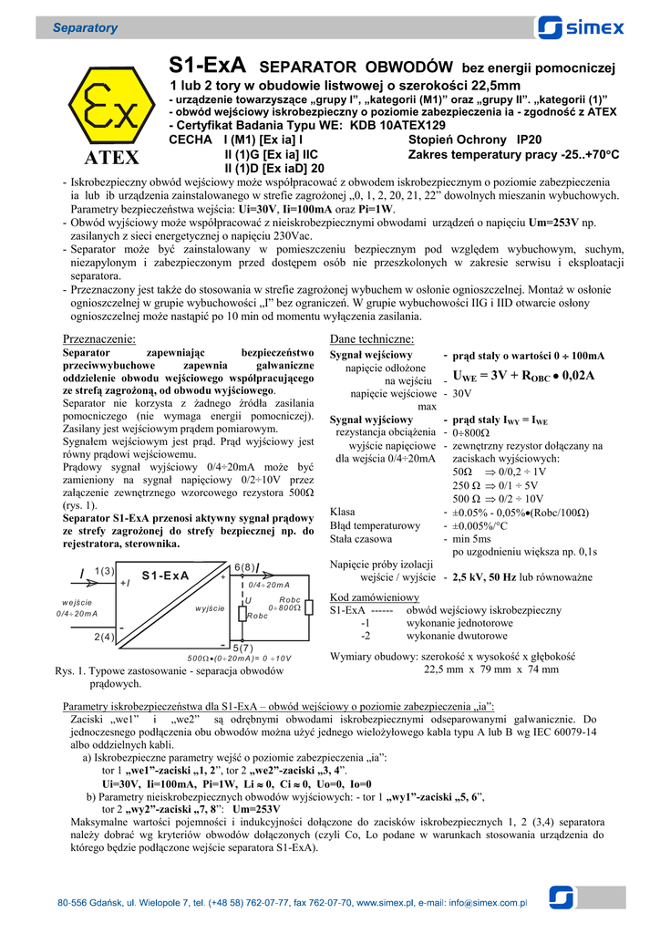 S1-ExA SEPARATOR OBWODÓW bez energii pomocniczej 1 lub 2 tory w obudowie listwowej o szerokości 22,5mm - urządzenie towarzyszące „grupy I”, „kategorii (M1)” oraz „grupy II”. „kategorii (1)” - obwód wejściowy iskrobezpieczny o poziomie zabezpieczenia ia - zgodność z ATEX - Certyfikat Badania Typu WE: KDB 10ATEX129 CECHA I (M1) [Ex ia] I Stopień Ochrony IP20 II (1)G [Ex ia] IIC Zakres temperatury pracy -25..+70C II (1)D [Ex iaD] 20 Iskrobezpieczny obwód wejściowy może współpracować z obwodem iskrobezpiecznym o poziomie zabezpieczenia ia lub ib urządzenia zainstalowanego w strefie zagrożonej „0, 1, 2, 20, 21, 22” dowolnych mieszanin wybuchowych. Parametry bezpieczeństwa wejścia: Ui=30V, Ii=100mA oraz Pi=1W. Obwód wyjściowy może współpracować z nieiskrobezpiecznymi obwodami urządzeń o napięciu Um=253V np. zasilanych z sieci energetycznej o napięciu 230Vac. Separator może być zainstalowany w pomieszczeniu bezpiecznym pod względem wybuchowym, suchym, niezapylonym i zabezpieczonym przed dostępem osób nie przeszkolonych w zakresie serwisu i eksploatacji separatora. Przeznaczony jest także do stosowania w strefie zagrożonej wybuchem w osłonie ognioszczelnej. Montaż w osłonie ognioszczelnej w grupie wybuchowości „I” bez ograniczeń. W grupie wybuchowości IIG i IID otwarcie osłony ognioszczelnej może nastąpić po 10 min od momentu wyłączenia zasilania. ATEX - - - Przeznaczenie: Dane techniczne: Separator zapewniając bezpieczeństwo przeciwwybuchowe zapewnia galwaniczne oddzielenie obwodu wejściowego współpracującego ze strefą zagrożoną, od obwodu wyjściowego. Separator nie korzysta z żadnego źródła zasilania pomocniczego (nie wymaga energii pomocniczej). Zasilany jest wejściowym prądem pomiarowym. Sygnałem wejściowym jest prąd. Prąd wyjściowy jest równy prądowi wejściowemu. Prądowy sygnał wyjściowy 0/4÷20mA może być zamieniony na sygnał napięciowy 0/2÷10V przez załączenie zewnętrznego wzorcowego rezystora 500Ω (rys. 1). Separator S1-ExA przenosi aktywny sygnał prądowy ze strefy zagrożonej do strefy bezpiecznej np. do rejestratora, sterownika. Sygnał wejściowy napięcie odłożone na wejściu napięcie wejściowe max Sygnał wyjściowy rezystancja obciążenia wyjście napięciowe dla wejścia 0/4÷20mA 1(3) +I w e jś cie 0 /4 20 m A 2(4) S 1 -E x A 6(8) + w y jś c ie 0 /4 20 m A U R o bc 0 80 0 R o bc - 5(7) 5 00 (0 20 m A )= 0 10 V Rys. 1. Typowe zastosowanie - separacja obwodów prądowych. Klasa Błąd temperaturowy Stała czasowa - prąd stały o wartości 0 100mA - UWE - 30V = 3V + ROBC 0,02A - prąd stały IWY = IWE - 0800 - zewnętrzny rezystor dołączany na zaciskach wyjściowych: 50Ω 0/0,2 ÷ 1V 250 Ω 0/1 ÷ 5V 500 Ω 0/2 ÷ 10V - ±0.05% - 0,05%(Robc/100Ω) - ±0.005%/C - min 5ms po uzgodnieniu większa np. 0,1s Napięcie próby izolacji wejście / wyjście - 2,5 kV, 50 Hz lub równoważne Kod zamówieniowy S1-ExA ------ obwód wejściowy iskrobezpieczny -1 wykonanie jednotorowe -2 wykonanie dwutorowe Wymiary obudowy: szerokość x wysokość x głębokość 22,5 mm x 79 mm x 74 mm Parametry iskrobezpieczeństwa dla S1-ExA – obwód wejściowy o poziomie zabezpieczenia „ia”: Zaciski „we1” i „we2” są odrębnymi obwodami iskrobezpiecznymi odseparowanymi galwanicznie. Do jednoczesnego podłączenia obu obwodów można użyć jednego wielożyłowego kabla typu A lub B wg IEC 60079-14 albo oddzielnych kabli. a) Iskrobezpieczne parametry wejść o poziomie zabezpieczenia „ia”: tor 1 „we1”-zaciski „1, 2”, tor 2 „we2”-zaciski „3, 4”. Ui=30V, Ii=100mA, Pi=1W, Li 0, Ci 0, Uo=0, Io=0 b) Parametry nieiskrobezpiecznych obwodów wyjściowych: - tor 1 „wy1”-zaciski „5, 6”, tor 2 „wy2”-zaciski „7, 8”: Um=253V Maksymalne wartości pojemności i indukcyjności dołączone do zacisków iskrobezpiecznych 1, 2 (3,4) separatora należy dobrać wg kryteriów obwodów dołączonych (czyli Co, Lo podane w warunkach stosowania urządzenia do którego będzie podłączone wejście separatora S1-ExA). Warunki stosowania: Iskrobezpieczny wejściowy obwód pomiarowy (zaciski „1-2” lub „3-4”) separatora typu S1-ExA o poziomie zabezpieczenia „ia” może współpracować z obwodami o poziomie ochrony „ia” lub ib" urządzeń zainstalowanych w strefie 0, 1, 2 mieszanin wybuchowych z powietrzem, zaliczanych do grupy wybuchowości IIA, IIB, IIC oraz w strefie 20, 21 i 22 zagrożenia wybuchem pyłu. Parametry bezpieczeństwa Uo, Io, Po urządzeń podłączanych powinny być mniejsze od Ui, Ii, Pi wejścia separatora. Przeznaczony jest do stosowania poza strefą zagrożoną wybuchem lub w strefie zagrożonej wybuchem w osłonie ognioszczelnej. Montaż w osłonie ognioszczelnej w grupie wybuchowości „I” bez ograniczeń. W grupie wybuchowości IIG i IID otwarcie osłony ognioszczelnej może nastąpić po 10 min od momentu wyłączenia zasilania. Zaciski wyjściowe „5-6” lub „7-8” mogą współpracować z obwodami nieiskrobezpiecznymi urządzeń o napięciu Um=253V np. zasilanych z sieci energetycznej o napięciu 230Vac. Separator umieszczony jest w obudowie z tworzywa samogasnącego (poliamid PA 6.6) przeznaczonej do montażu na listwę TS35. Stopień ochrony obudowy i zacisków wynosi IP20. Przyłącza zewnętrzne należy prowadzić przewodami o przekroju żył 0,5 ÷ 2.5 mm2. Zgodność z ATEX - dyrektywa 94/9/WE: PN-EN 60079-0:2009, PN-EN 60079-11:2010, PN-EN 61241-0:2007, PN-EN 61241-11:2007. Zgodność z dyrektywą EMC 2004/108/WE: PN-EN 61000-6-4, PN-EN 61000-6-2 Warunki pracy : Temperatura otoczenia - magazynowania Temperatura otoczenia - pracy Wilgotność względna Atmosfera otoczenia Położenie pracy - -30 +70C -25 +70oC max 90% brak pyłów i gazów agresywnych dowolne S 1 -E x A 1 + We 1 2 - + 6 7 8 Wy 1 Wy 2 - + Wy 1 - 5 6 - + 5 3 + We 2 4 - + 99 SEPARATOR 8 [Ex ia] Wy 2 - S1-ExA We 2 7 4 3 114,5 Rys.2. Opis zacisków podł