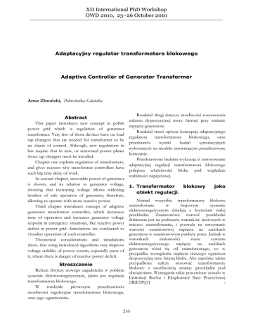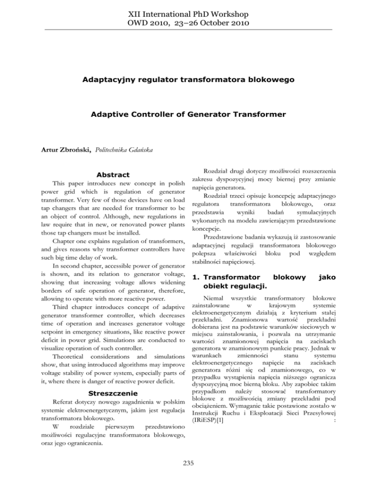XII International PhD Workshop OWD 2010, 23–26 October 2010 Adaptacyjny regulator transformatora blokowego Adaptive Controller of Generator Transformer Artur Zbroński, Politechnika Gdańska Abstract This paper introduces new concept in polish power grid which is regulation of generator transformer. Very few of those devices have on load tap changers that are needed for transformer to be an object of control. Although, new regulations in law require that in new, or renovated power plants those tap changers must be installed. Chapter one explains regulation of transformers, and gives reasons why transformer controllers have such big time delay of work. In second chapter, accessible power of generator is shown, and its relation to generator voltage, showing that increasing voltage allows widening borders of safe operation of generator, therefore, allowing to operate with more reactive power. Third chapter introduces concept of adaptive generator transformer controller, which decreases time of operation and increases generator voltage setpoint in emergency situations, like reactive power deficit in power grid. Simulations are conducted to visualize operation of such controller. Theoretical considerations and simulations show, that using introduced algorithms may improve voltage stability of power system, especially parts of it, where there is danger of reactive power deficit. Streszczenie Referat dotyczy nowego zagadnienia w polskim systemie elektroenergetycznym, jakim jest regulacja transformatora blokowego. W rozdziale pierwszym przedstawiono możliwości regulacyjne transformatora blokowego, oraz jego ograniczenia. Rozdział drugi dotyczy możliwości rozszerzenia zakresu dyspozycyjnej mocy biernej przy zmianie napięcia generatora. Rozdział trzeci opisuje koncepcję adaptacyjnego regulatora transformatora blokowego, oraz przedstawia wyniki badań symulacyjnych wykonanych na modelu zawierającym przedstawione koncepcje. Przedstawione badania wykazują iż zastosowanie adaptacyjnej regulacji transformatora blokowego polepsza właściwości bloku pod względem stabilności napięciowej. 1. Transformator blokowy obiekt regulacji. jako Niemal wszystkie transformatory blokowe zainstalowane w krajowym systemie elektroenergetycznym działają z kryterium stałej przekładni. Znamionowa wartość przekładni dobierana jest na podstawie warunków sieciowych w miejscu zainstalowania, i pozwala na utrzymanie wartości znamionowej napięcia na zaciskach generatora w znamionowym punkcie pracy. Jednak w warunkach zmienności stanu systemu elektroenergetycznego napięcie na zaciskach generatora różni się od znamionowego, co w przypadku wystąpienia napięcia niższego ogranicza dyspozycyjną moc bierną bloku. Aby zapobiec takim przypadkom należy stosować transformatory blokowe z możliwością zmiany przekładni pod obciążeniem. Wymaganie takie postawione zostało w Instrukcji Ruchu i Eksploatacji Sieci Przesyłowej (IRiESP)[1] : 235 II.B.3.3.1.1. Jednostki wytwórcze nowe lub po najbliższej modernizacji urządzeń, o mocy osiągalnej równej 50 MW lub wyższej powinny być wyposażone w: (…) d) transformatory blokowe z możliwością zmiany przekładni pod obciążeniem (…) Propozycję koordynacji algorytmów działania transformatora blokowego z algorytmami regulacji generatora synchronicznego przedstawiono w [2], oraz poparto zaproponowany sposób badaniami symulacyjnymi. Ograniczenia regulatora transformatora blokowego. Aby umożliwić regulację zaczepu transformatora pod obciążeniem należy zastosować przełącznik zaczepów. Jest to najczęściej mechaniczny element zmieniający zaczep po otrzymaniu sygnału z regulatora. Przełącznik taki ma określoną żywotność mechaniczną, określającą ilość możliwych przełączeń do wystąpienia potrzeby wymiany przełącznika. Maksymalna liczba przełączeń zależy od prądu obciążenia strony transformatora, po której znajduje się przełącznik i liczy się w setkach tysięcy. Jest to jednak pozornie duża wartość, gdyż aby przeglądy przełącznika nie były częstsze niż przeglądy transformatora należy przyjąć ograniczenie liczby przełączeń do 50-60 na dobę, co wziąwszy pod uwagę szybkość zmian obciążenia w SEE nie jest dużą wartością. Z tego powodu w regulatorach transformatorów nastawia się duże opóźnienia zadziałania. Przykładową charakterystykę przedstawiającą zależność wytrzymałości mechanicznej od prądu obciążenia dla przełącznika typu UZ firmy ABB przedstawiono na rysunku 1. Rys.1. Charakterystyka żywotności mechanicznej przełącznika zaczepów ABB typu UZ w zależności od prądu obciążenia.[3] Fig.1. Predicted contact life, depending on rated current of ABB on-load tap changer type UZ [3] 1.1 Duże opóźnienia zadziałania regulatora transformatora nie przeszkadza podczas normalnej pracy bloku generator – transformator blokowy. Jednak aby wykorzystać w pełni korzyści płynące z możliwości regulacji transformatora blokowego podczas stanów awaryjnych należy się zastanowić nad usprawnieniem działania regulatora tego transformatora. 2. Generator synchroniczny obiekt regulacji. jako Zakres zmienności wielkości regulowanych generatora zależy od parametrów turbozespołu. Wartości graniczne określane są przez szereg ograniczeń eksploatacyjnych oraz konstrukcyjnych. Zakres zmienności napięcia określany jest przez rodzaj pracy generatora oraz sytuację napięciową węzła w którym zainstalowany został generator i może wynosić lub w stosunku do napięcia znamionowego generatora. Moc bierna może się zmieniać w granicach określonych przez warunki wynikające z ograniczeń konstrukcyjnych oraz zachowania stabilności współpracy generatora z systemem elektroenergetycznym.. Ograniczenie kąta mocy, maksymalnego prądu stojana oraz dopuszczalnego prądu wirnika, zależą od napięcia na zaciskach generatora. Na rysunku 2 przedstawiono zmiany obs