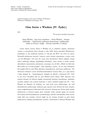 Edition · Ludwig · Gumplowicz http://agso.uni-graz.at/gumplowicz Ośm listów z Wiednia [IV. Żydzi.] (1867B) Archiv für die Geschichte der Soziologie in Österreich Ludwik Gumplowicz, Ośm Listów z Wiednia. W Krakowie, Wytłoczono u Władysława Jaworskiego. 1867. Ośm listów z Wiednia [IV. Żydzi.] [23] W rocznicę rewolucji marcowej. (Stary Wiedeń – jego życie umysłowe. – Nowy Wiedeń. – Inwazje żydowskie. – Opanowanie położenia finansowego i publicystyki. – Żydzi we Francji i Anglji. – Kwestja żydowska w Galicji). Często słyszeć można dzisiaj w Wiedniu żal za niedawno dopiero minionym czasem, za przeszłością, która skonała w roku 1848. Starzy prawdziwi Wiedeńczycy wzdychając za nią, dodawają smutnie, że “das gute alte Wien” nie wróci się więcej. Dzienniki poświęcone teatrowi i muzyce, często rzewnie wspominają o owym czasie „vor den Märztagen". Od czasu do czasu, przy sposobności śmierci jakiegoś starego radzcy sądowego, jakiegoś zgrzybiałego biórokraty, czytać można w tychże samych dziennikach, wspomnienie pośmiertne, zaczynające się od słów: „Wieder ein Stück altes Wien haben wir zu Grabe getragen”, dalej zdumiony czytasz, „że ten stary biórokrata był niegdyś [24] im alten Wien głównym dziennikarzem, pierwszym publicystą”. Nie dowierzasz własnym oczom: biórokrata-dziennikarz? Czytasz dalej: „że o jego fawory i łaskę ubiegali się – komediopisarze, ubiegały się aktorki i śpiewaczki itd.” Otóż to jest rzecz! Szczęśliwy był ten stary Wiedeń przed rokiem 1848. Opasany temi samymi murami, do których niegdyś szturmowali niewierni muzułmanie, zamknięty szczelnie między temi samemi bramami, w które wjeżdżał niegdyś Jan III – stary Wiedeń nie kłopotał się polityką, nie znał trosk życia politycznego, nie znał dziennikarstwa politycznego. Jedynem jego zajęciem urny słowem był teatr, muzyka, opera; najgłośniejszymi bohaterami byli autorowie dramatyczni, którzy pisali trajedje fatalistyczne, w których piątym akcie wszystkie osoby musiały zginąć od trucizny lub sztyletu; byli komedjopisarze, przedstawiający obrazki czarodziejskie, które zawsze miały jakiś sens moralny, chociaż nigdy się nie ważymy wystąpić na pole aluzyj politycznych. Jedynym przedmiotem rozmów i konwersacji w dawnym Wiedniu byli -1- Edition · Ludwig · Gumplowicz http://agso.uni-graz.at/gumplowicz Ośm listów z Wiednia [IV. Żydzi.] (1867B) Archiv für die Geschichte der Soziologie in Österreich aktorowie i aktorki, śpiewy i śpiewaczki, tancerki i kompozytorowie. Najwyższym zaś w rzeczach tych sędzią, absolutnym kierownikiem „opinji publicznej", był pan Hofrath albo też pan Landesgerichtsrath, który w wolnych od zatrudnień biórowych godzinach – horribile dictu – redagował dziennik...... ale dziennik poświęcony Melpomenie i Terpsychorze. Błogi to był czas! Wiedeńczyk wracając wieczorem do domu z teatru lub opery spokojnie spał – bo [25] wiedział, że ks. Metternich, na którego zdał sprawy polityczne, dobrze je prowadzi, a dyrektor policji Sedlnitzky czuwa nad miastem i sprawami miejskiemi, i bez „Geleitszetlu" żadnemu żydowi nie pozwala przebywać ani 24 godzin w murach miasta. Błogi to był czas! „Majątek miasta, gmachy publiczne, ulice, spacery, place publiczne, były własnością katolicką!” Słowem – Wiedeń zachowywał charakter katolicki więc „i polski!” dodałby może poseł z Wadowic. Wtem nadszedł rok 1848; z nim wybiła godzina zgonu starego Wiednia. Nie wiem, czy ich kto o to prosił, czy też nieproszeni, ale faktem jest, że żydzi czescy, morawscy i węgierscy przygotowywali, zaczęli i przeprowadzili rewolucję roku 1848 w Wiedniu. Wychodzące przed tym rokiem w Lipsku pismo perjodyczne „Grenzbote”, bijąc armatniemi kulami w starą twierdzę systemu Metternichowskiego, wstrzęsło nią i mury jej porysowało – pismo to redagował żyd czeski Kuranda, dziś redaktor dziennika Ost - Deutsche Post i członek Rady Państwa. Dnia 13 marca 1848 roku kto prowadził studentów wiedeńskich do sali zgromadzonych stanów niższo-austrjackich? Dr. Fiszhof, żyd węgierski – a był to pierwszy krok rewolucji, uroczyste jej zagajenie. Tego samego dnia, od pierwszych kul karabinowych wystrzelonych na lud, legł student, imieniem Spitzer — żyd morawski. W kilka dni potem, przy uroczystym pogrzebie wszystkich poległych dnia 13go marca, na cmentarzu katolickim, kaznodzieja żydowski Maunheimer, w świetnej mowie pogrzebowej podnosząc [26] zasługę poległych w sprawie wolności, rozpoczętemu dziełu rewolucji dał błogosławieństwo kapłańskie. Rewolucja zwyciężyła, a mimo krótkiej recydywy absoluty stycznej od roku 1851 do 1866, Wiedeń i monarchja zawdzięczają jej wolny rozwój instytucyj politycznych, zawdzięczają ten postęp na drodze wolności, samorządu i rozwoju, jaki nastąpił od roku 1849 aż do dziś dnia. Nie dziw więc, że żydzi, którzy w rewolucji wiedeńskiej roku 1848 tak przeważny mieli udział, bodaj nie główną inicjatywę, starali się jak najwięcej z nowej, przyjaznej im korzystać konstelacji. -2- Edition · Ludwig · Gumplowicz http://agso.uni-graz.at/gumplowicz Ośm listów z Wiednia [IV. Żydzi.] (1867B) Archiv für die Geschichte der Soziologie in Österreich To też od roku 1848 powódź żydowska z Czech, Węgier, Morawji, a nawet Galicji zalała Wiedeń. Od tej to inwazji żydowskiej datuje się nowy „nowy Wiedeń”. Jak starego Wiednia charakterystycznym rysem był katolicyzm, tak dzisiejszego Wiednia charakterystyczną cechą jest żydowstwo. W dzisiejszym Wiedniu jest ono obok Słowiańszczyzny żywiołem najwybitniejszym, jest czynnikiem, z którym pod każdym względem liczyć się trzeba. W żadnem innem mieście europejskiem żydowstwo nie rozwielmoźniło się tak, jak w Wiedniu. Opanowawszy równocześnie dziennikarstwo i giełdę, opinię publiczną i położe