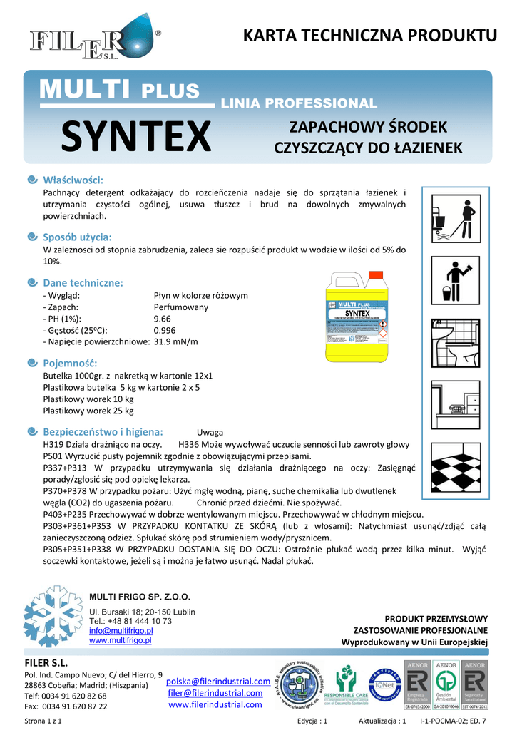 KARTA TECHNICZNA PRODUKTU MULTI PLUS LINIA PROFESSIONAL SYNTEX ZAPACHOWY ŚRODEK CZYSZCZĄCY DO ŁAZIENEK Właściwości: Pachnący detergent odkażający do rozcieñczenia nadaje się do sprzątania łazienek i utrzymania czystości ogólnej, usuwa tłuszcz i brud na dowolnych zmywalnych powierzchniach. Sposób użycia: W zależnosci od stopnia zabrudzenia, zaleca sie rozpuścić produkt w wodzie w ilości od 5% do 10%. Dane techniczne: - Wygląd: - Zapach: - PH (1%): - Gęstość (25⁰C): - Napięcie powierzchniowe: Płyn w kolorze rȯżowym Perfumowany 9.66 0.996 31.9 mN/m Pojemność: Butelka 1000gr. z nakretką w kartonie 12x1 Plastikowa butelka 5 kg w kartonie 2 x 5 Plastikowy worek 10 kg Plastikowy worek 25 kg Bezpieczeństwo i higiena: Uwaga H319 Działa drażniąco na oczy. H336 Może wywoływać uczucie senności lub zawroty głowy P501 Wyrzucić pusty pojemnik zgodnie z obowiązującymi przepisami. P337+P313 W przypadku utrzymywania się działania drażniącego na oczy: Zasięgnąć porady/zgłosić się pod opiekę lekarza. P370+P378 W przypadku pożaru: Użyć mgłę wodną, pianę, suche chemikalia lub dwutlenek węgla (CO2) do ugaszenia pożaru. Chronić przed dziećmi. Nie spożywać. P403+P235 Przechowywać w dobrze wentylowanym miejscu. Przechowywać w chłodnym miejscu. P303+P361+P353 W PRZYPADKU KONTATKU ZE SKÓRĄ (lub z włosami): Natychmiast usunąć/zdjąć całą zanieczyszczoną odzież. Spłukać skórę pod strumieniem wody/prysznicem. P305+P351+P338 W PRZYPADKU DOSTANIA SIĘ DO OCZU: Ostrożnie płukać wodą przez kilka minut. Wyjąć soczewki kontaktowe, jeżeli są i można je łatwo usunąć. Nadal płukać. MULTI FRIGO SP. Z.O.O. Ul. Bursaki 18; 20-150 Lublin Tel.: +48 81 444 10 73 [email protected] www.multifrigo.pl PRODUKT PRZEMYSŁOWY ZASTOSOWANIE PROFESJONALNE Wyprodukowany w Unii Europejskiej FILER S.L. Pol. Ind. Campo Nuevo; C/ del Hierro, 9 [email protected] 28863 Cobeña; Madrid; (Hiszpania) [email protected] Telf: 0034 91 620 82 68 www.filerindustrial.com Fax: 0034 91 620 87 22 Strona 1 z 1 Edycja : 1 Aktualizacja : 1 I-1-POCMA-02; ED. 7