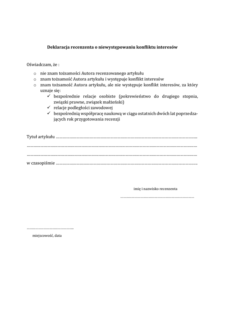 Deklaracja recenzenta o niewystępowaniu konfliktu interesów