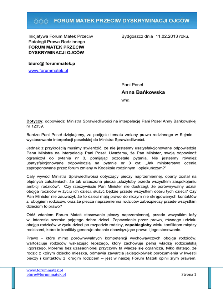 Inicjatywa Forum Matek Przeciw Patologii Prawa Rodzinnego FORUM MATEK PRZECIW DYSKRYMINACJI OJCÓW Bydgoszcz dnia 11.02.2013 roku. biuro@ forummatek.p www.forummatek.pl Pani Poseł Anna Bańkowska w/m Dotyczy: odpowiedzi Ministra Sprawiedliwości na interpelację Pani Poseł Anny Bańkowskiej nr 12359. Bardzo Pani Poseł dziękujemy, za podjęcie tematu zmiany prawa rodzinnego w Sejmie – wystosowanie interpelacji poselskiej do Ministra Sprawiedliwości. Jednak z przykrością musimy stwierdzić, Ŝe nie jesteśmy usatysfakcjonowane odpowiedzią Pana Ministra na interpelację Pani Poseł. UwaŜamy, Ŝe Pan Minister, swoją odpowiedź ograniczył do pytania nr 3, pomijając pozostałe pytania. Nie jesteśmy równieŜ usatysfakcjonowane odpowiedzią na pytanie nr 3 cyt: „Jak ministerstwo ocenia zaproponowane przez forum zmiany w Kodeksie rodzinnym i opiekuńczym?” Cały wywód Ministra Sprawiedliwości dotyczący pieczy naprzemiennej, oparty został na błędnych załoŜeniach, Ŝe tak orzeczona piecza „słuŜyłoby przede wszystkim zaspokojeniu ambicji rodziców”. Czy rzeczywiście Pan Minister nie dostrzegł, Ŝe porównywalny udział obojga rodziców w Ŝyciu ich dzieci, słuŜyć będzie przede wszystkim dobru tych dzieci? Czy Pan Minister nie zauwaŜył, Ŝe to dzieci mają prawo do niczym nie skrępowanych kontaktów z obojgiem rodziców, oraz Ŝe piecza naprzemienna rodziców zabezpieczy przede wszystkim dzieciom to prawo? OtóŜ zdaniem Forum Matek stosowanie pieczy naprzemiennej, przede wszystkim leŜy w interesie szeroko pojętego dobra dzieci. Zapewnienie przez prawo, równego udziału obojga rodziców w Ŝyciu dzieci po rozpadzie rodziny, zapobiegłoby wielu konfliktom między rodzicami, które to konflikty generuje obecnie obowiązujące prawo i jego stosowanie. Prawo - które mimo porównywalnych kompetencji wychowawczych obojga rodziców, wartościuje rodziców wskazując lepszego, który zachowuje pełną władzę rodzicielską i gorszego, któremu bez uzasadnionej przyczyny tą władzę się ogranicza, tylko dlatego, Ŝe rodzic z którym dziecko mieszka, odmawia zawarcia jakiegokolwiek porozumienia w kwestii pieczy i kontaktów z drugim rodzicem – jest w naszej Forum Matek opinii złym prawem, www.forummatek.pl [email protected] Strona 1 krzywdzącym równieŜ dzieci. Jest to stygmatyzowanie rodzica w oczach dzieci i budzenie przekonania u nich o „niepełnowartościowości” rodzica, które moŜe utrzymywać się w psychice dziecka i moŜe mieć długotrwałe konsekwencje w przyszłości. Wielokrotnie wskazywałyśmy zalety, jakie widzimy w stosowaniu pieczy naprzemiennej, oraz jakie problemy (które generuje obecny system) ona likwiduje, ale chętnie powtórzymy jeszcze raz: • Oboje rodzice w porównywalnym stopniu będą mieli wpływ na wychowanie dzieci, • Skuteczniej będzie chronione prawo dzieci do Ŝycia w bezpieczeństwie materialnym, psychicznym i emocjonalnym, • Dziecko będzie w równym stopniu miało z rodzeństwem przyrodnim i to obojga stron, • Dziecko będzie miało jednakową moŜliwość nieograniczonego i nieskrępowanego kontaktowania się z rodzinami ojca i matki, • Rodzice chętniej będą ze sobą współpracować, mając poczucie, równego udziału w Ŝyciu dziecka. • Nie będzie konieczne obowiązkowe ustalanie alimentów, w wyjątkowych sytuacjach ustalane byłyby alimenty wyrównawcze, • Zlikwiduje problem sądowego ustalanie kontaktów dziecka z dziadkami, • Zlikwiduje problem bezpodstawnego i upokarzającego ograniczania władzy rodzicielskiej jednemu rodzicowi, oraz wszystkich konsekwencji z tym związanych, • Zlikwiduje problem ustalania sposobu spędzania przez dziecko wakacji i świąt, urodzin, uroczystości rodzinnych z kaŜdym z rodziców itp. • Ograniczy, bądź zlikwiduje problem wywoŜenia dziecka przez jednego rodzica (przeprowadzania się) do odległej miejscowości. moŜliwość utrzymania kontaktu Babcie i dziadkowie ojczyści skupieni w Forum Matek, nie są prawnikami/karnistami, Forum Matek liczyło na to, Ŝe Ministerstwo Sprawiedliwości posiada odpowiednich fachowców, którzy potrafią „poprawić” niefortunne sformułowania, a nie tylko wytknąć błędy. Pan Minister dowodząc, Ŝe zaproponowana przez Forum Matek nowelizacja prawa jest nie do przyjęcia, nie zaproponował niczego w zamian. Mimo Ŝe Pan Minister podziela stanowisko Forum Matek stwierdzając: ”Krytyka obowiązującego stanu prawnego przedstawionego przez Forum Matek uzasadnia rozwaŜenie zmiany przepisów o władzy rodzicielskiej i wypracowanie nowych rozwiązań”, nie przedstawił propozycji, czy choćby pomysłu na zmianę tego stanu rzeczy. W dalszym ciągu oczekujemy na rzetelną odpowiedź Pana Ministra na pozostałe pytania zawarte w Interpelacji Pani Poseł: www.forummatek.pl [email protected] Strona 2 1. Jakie działania zamierza podjąć resort wobec problemów, które zostały Panu Ministrowi przedstawione przez Forum Matek Przeciw Dyskryminacji Ojców? 2. Czy Pan Minister widzi moŜliwość wyeliminowania lub złagodzenia tych problemów? 3. Czy ministerstwo ma własne propozycje zmian ustawowych w tej sprawie i kiedy zostaną one skierowane do prac parlamentarnych? Powtarzamy za Panią Poseł : Zmiana tej sytuacji jest potrzebna równieŜ, aby umocnić więzi rodzinne niezbędne dla prawidłowego rozwoju dzieci. Z wyrazami szacunku W imieniu całego Forum Matek Przeciw Dyskryminacji Ojców bydgoskie babcie ojczyste Jadwiga Skurzyńska, Anna Gołąbek, Maria Baranowska. adres do korespondencji: Anna Gołąbek ul. Duracza 3/10 85-791 Bydgoszcz tel. 510 260 912 email: [email protected] Do wiadomości: Podsekretarz Stanu Michał Królikowski Ministerstwo Sprawiedliwości [email protected] www.forummatek.pl [email protected] Strona 3