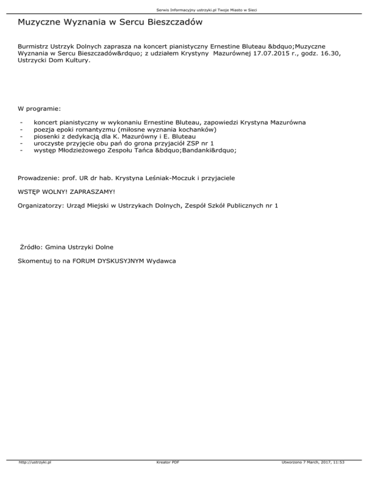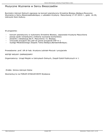 Serwis Informacyjny ustrzyki.pl Twoje Miasto w Sieci Muzyczne Wyznania w Sercu Bieszczadów Burmistrz Ustrzyk Dolnych zaprasza na koncert pianistyczny Ernestine Bluteau „Muzyczne Wyznania w Sercu Bieszczadów” z udziałem Krystyny Mazurównej 17.07.2015 r., godz. 16.30, Ustrzycki Dom Kultury. W programie: - koncert pianistyczny w wykonaniu Ernestine Bluteau, zapowiedzi Krystyna Mazurówna poezja epoki romantyzmu (miłosne wyznania kochanków) piosenki z dedykacją dla K. Mazurówny i E. Bluteau uroczyste przyjęcie obu pań do grona przyjaciół ZSP nr 1 występ Młodzieżowego Zespołu Tańca „Bandanki” Prowadzenie: prof. UR dr hab. Krystyna Leśniak-Moczuk i przyjaciele WSTĘP WOLNY! ZAPRASZAMY! Organizatorzy: Urząd Miejski w Ustrzykach Dolnych, Zespół Szkół Publicznych nr 1 Żródło: Gmina Ustrzyki Dolne Skomentuj to na FORUM DYSKUSYJNYM Wydawca http://ustrzyki.pl Kreator PDF Utworzono 7 March, 2017, 11:53 Serwis Informacyjny ustrzyki.pl Twoje Miasto w Sieci http://ustrzyki.pl Kreator PDF Utworzono 7 March, 2017, 11:53 Serwis Informacyjny ustrzyki.pl Twoje Miasto w Sieci portalu ustrzyki.pl nie http://ustrzyki.pl Kreator PDF Utworzono 7 March, 2017, 11:53 Serwis Informacyjny ustrzyki.pl Twoje Miasto w Sieci ponosi odpowiedzialności za treść http://ustrzyki.pl Kreator PDF Utworzono 7 March, 2017, 11:53 Serwis Informacyjny ustrzyki.pl Twoje Miasto w Sieci komentarzy http://ustrzyki.pl Kreator PDF Utworzono 7 March, 2017, 11:53 Serwis Informacyjny ustrzyki.pl Twoje Miasto w Sieci zamieszczanych przez użytkowników. http://ustrzyki.pl Kreator PDF Osoby Utworzono 7 March, 2017, 11:53 Serwis Informacyjny ustrzyki.pl Twoje Miasto w Sieci zamieszczające http://ustrzyki.pl Kreator PDF Utworzono 7 March, 2017, 11:53 Serwis Informacyjny ustrzyki.pl Twoje Miasto w Sieci wypowiedzi naruszające prawo http://ustrzyki.pl Kreator PDF Utworzono 7 March, 2017, 11:53 Serwis Informacyjny ustrzyki.pl Twoje Miasto w Sieci lub prawem http://ustrzyki.pl Kreator PDF Utworzono 7 March, 2017, 11:53 Serwis Informacyjny ustrzyki.pl Twoje Miasto w Sieci chronione dobra osób trzecich mogą http://ustrzyki.pl Kreator PDF Utworzono 7 March, 2017, 11:53 Serwis Informacyjny ustrzyki.pl Twoje Miasto w Sieci ponieść z tego http://ustrzyki.pl Kreator PDF Utworzono 7 March, 2017, 11:53 Serwis Informacyjny ustrzyki.pl Twoje Miasto w Sieci tytułu odpowiedzialność http://ustrzyki.pl Kreator PDF Utworzono 7 March, 2017, 11:53 Serwis Informacyjny ustrzyki.pl Twoje Miasto w Sieci karną lub cywilną. http://ustrzyki.pl Kreator PDF Utworzono 7 March, 2017, 11:53