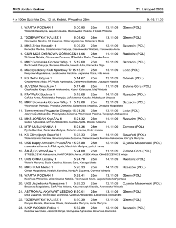 MKS Jordan Krakow 21. Listopad 2009 4 x 100m Sztafeta Zm., 12 lat, Kobiet, P³ywalnia 25m 1. WARTA POZNAÑ 1 5:00.95 9.-16.11.09 25m 13.11.09 Œrem (POL) Walczak Katarzyna, Wójcik Claudia, Mendowska Paulina, Filipiak Wiktoria 2. "DZIEWI¥TKA" KALISZ 1 5:05.62 25m 13.11.09 Œrem (POL) 12.11.09 Szczecin (POL) Ciszewska Sandra, Kit Zuzanna, Kliber Agnieszka, Sztandera Daria 3. MKS Znicz Koszalin 1 5:09.23 25m Konopka Monika, Dziadkowiak Patrycja, Osenkowska Wiktoria, Piotrowska Anna 4. CSiR MOS D¥BROWA GÓRNICZA 5:11.06 1 25m 14.11.09 Racibórz (POL) WoŸniak Natalia, Olszewska Zuzanna, Œliwiñska Marta, Teresko Anna 5. MKP Slowianka Gorzow Wlkp. 1 5:12.60 25m 12.11.09 Szczecin (POL) 13.11.09 Lodz (POL) Bartkowiak Patrycja, Szczuka Klaudia, Nowak Julia, Klamecka Olga 6. Miedzyszkolny Klub Sportowy Tr 15:13.21 25m Rozycka Magadalena, Laczkowska Karolina, Jagielska Roza, Nita Anna 7. KS Delfin Gdynia 1 5:14.67 25m 13.11.09 Gdansk (POL) Grudnowska Alicja, PÄ™kala Agnieszka, Dalkowska Barbara, Juszczyk Natalia 8. JUVENIA WrocÅ‚aw 1 5:17.48 25m 11.11.09 Zielona Góra (POL) CiepÅ‚ucha Kinga, Kaniak Aleksandra, Kusch Katarzyna, Maj Wiktoria 9. PÅ•YWAK Bochnia 1 5:18.08 25m 14.11.09 Rzeszów (POL) CaÅ‚ka Anna, Åšwiderska Patrycja, JaÅ›kiewicz Klaudia, Michalczyk Urszula 10. MKP Slowianka Gorzow Wlkp. 1 5:19.06 25m 12.11.09 Szczecin (POL) Wachowiak Patrycja, Piwecka Dominika, Sobotnicka Angelika, Onoszko Magdalena 11. Towarzystwo Plywackie Olimpijc 15:21.25 25m 13.11.09 Lodz (POL) Jerzynska Aleksandra, Porczynska Zuzanna, Wozniczak Paulina, Turajczyk Aleksandra 12. MKS JORDAN Kraków 6 5:21.32 25m 14.11.09 Rzeszów (POL) Sudek Agnieszka, Mróz Aleksandra, Kuzera Agata, Moskal Karolina 13. MTP LUBLINIANKA 1 5:21.36 25m 14.11.09 Zamosc (POL) 14.11.09 Suwa³aki (POL) Dyrda Karolina, Sadurska Martyna, Zaburko Joanna, Kruk Urszula 14. KS Olimpijczyk Suwa³ki 1 5:23.33 25m Walendzewicz Monika, Smereczyñska Zuzanna, Walendzewicz Monika Aleksandra, Okr¹g³a Martyna 15. UKS Kapry-Armexim Pruszków 1 5:23.89 25m 12.11.09 O¿arów Mazowiecki (POL) 11.11.09 Zielona Góra (POL) rzewuska adrianna, królak agata, Marciniak Martyna, parkot hanna 16. ÅšLÄ„SK WrocÅ‚aw 1 5:24.08 25m STRZELCZYK Aleksandra, KANTORSKA Anna, JASEK Alicja, CHASZCZEWICZ Alicja 17. UKS ORKA Lêdziny 1 5:24.78 25m 14.11.09 Racibórz (POL) 14.11.09 Rzeszów (POL) Wato³a Martyna, Buda Karolina, Marzec Sara, Kieraga Marta 18. MKS IKAR Mielec 1 5:28.33 25m Chlost Magdalena, KozioÅ‚ Karolina, KordyÅ› Zuzanna, Osmola Wiktoria 19. WARTA POZNAÑ 1 5:28.41 25m 13.11.09 Œrem (POL) Kupiñska Weronika, Wiœniewska Natalia, Piechowiak Aisza, Jagodziñska Ma³gorzata 20. UKS Jagiellonka Warszawa 1 5:29.23 25m 12.11.09 O¿arów Mazowiecki (POL) Bodalska Magdalena, ZarÄ™ba Aldona, Kaczmarczyk Klaudia, Aronowska Wiktoria 21. ASTROMAL AKWAWIT LESZNO 15:30.01 25m 13.11.09 Œrem (POL) Mika Zuzanna, WoŸniczak Weronika, Czarnul Aleksandra, Laskowska Aleksandra 22. "DZIEWI¥TKA" KALISZ 1 5:30.39 25m 13.11.09 Œrem (POL) Pacyna Kamila, Marciniak Oliwia, Grabowska Martyna, Janik Martyna 23. IUKP WODNIK Police 1 5:32.89 25m 12.11.09 Kosicka Weronika, Jasiczak Kinga, Skrzypska Agnieszka, Kotonska Dominika Szczecin (POL) 4 x 100m Sztafeta Zm., 12 lat, Kobiet, P³ywalnia 25m 24. MKP BOBRY Dêbica 1 5:33.90 Strona 2 25m 14.11.09 Rzeszów (POL) Godzisz Magdalena, Ciszek Weronika, Czerniak Magdalena, Å»ak Aleksandra 25. UKS Dwójka Morena GdaÅ„sk 1 5:34.51 25m 13.11.09 Gdansk (POL) KÄ™dziora Magdalena, Kolas Natalia, Lonski von Karolina, KoÅ‚odziejska Weronika 26. KP SOKÓL Rzeszów 1 5:35.50 25m 14.11.09 Rzeszów (POL) CieÅ›la Adrianna, Åšwieca Kamila, Kulaga Dominika, Szczepanik Gabriela 27. MKS HURAGAN Miedzyrzec Podlask 5:36.02 1 25m 14.11.09 Zamosc (POL) Celinska Kornelia, Biernacka Anna, Suchota Magdalena, Mikolajczuk Marta 28. KS 1 Ożarów Mazowiecki 1 5:36.30 25m 12.11.09 O¿arów Mazowiecki (POL) Federowicz Julia, Zwierzchowska Zofia, WaÅ›niewska Wiktoria, PawÅ‚owska Å»aneta 29. UKS Vega Dobrodzieñ 1 5:36.34 25m 14.11.09 Racibórz (POL) 14.11.09 Rzeszów (POL) Gambuœ Martyna, D¹bek Sara, Strzoda Weronika, Brzezina Oliwia 30. MUKP FALA Ropczyce 1 5:37.88 25m Pasierb Gabriela, Pasierb Patrycja, Niemiec Aleksandra, Golenia Karolina 31. KS PIATKA CHORZÓW 1 5:38.87 25m 14.11.09 Racibórz (POL) Rus Magdalena, Œwierczek Monika, Kwiecieñ Paulina, Bartosz Dominika 32. MKS JUVENIA Bia³ystok 1 5:39.12 25m 14.11.09 Suwa³aki (POL) Bondar Dominika, Sienkiewicz Klaudia, Mieleszko Paulina, Pietrzykowska Paulina 33. MKS Polonia Warszawa 1 5:40.06 25m 12.11.09 O¿arów Mazowiecki (POL) Kuszewska Alicja, Kwiatkowska Aleksandra, Orczyk Marta, Woźny MaÅ‚gorzata 34. ASP KS GÓRNIK Radlin 1 5:42.14 25m 14.11.09 Racibórz (POL) 11.11.09 Zielona Góra (POL) Wróblewska Patrycja, Rolnik Kinga, Skiba Martyna, Majer Natalia 35. JUVENIA WrocÅ‚aw 2 5:42.74 25m WesoÅ‚owska Weronika, Stecyk Klaudia, Wróbel Angelika, Bogucka Dagmara 36. MKS SMS Victoria Racibórz 1 5:44.29 25m 14.11.09 Racibórz (POL) Leksza Roksana, Osiñska Aleksandra, Gad¿a³a Agnieszka, Hawryszczuk Sarah 37. Uks Å»oliborz Warszawa 1 5:46.51 25m 12.11.09 O¿arów Mazowiecki (POL) Strzechowska Hanna, SiemiÅ„ska Maria, WaÅ‚ajtys Wiktoria, Stasiak Katarzyna 38. SALOS CORTILE Kielce 1 5:49.15 25m 14.11.09 Rzeszów (POL) 12.11.09 O¿arów Mazowiecki (POL) Marzec Paulina, Gawlik Mariola, PepaÅ› Milena, SobaÅ„ska Anna 39. UKS Wilanowia 1 5:52.73 25m Dominiak Gosia, Helbing Justyna, Borowska Beata, GÅ‚adkowska Julia 40. WODNIK ŒREM 1 5:54.37 25m 13.11.09 Œrem (POL) Skrzypczak Zuzanna, Majsner Katarzyna, Berger Weronika, Wojciechowska Izabela 41. MOSM Tychy 1 5:56.48 25m 14.11.09 Racibórz (POL) Grabowska Nina, Rolnik Ma³gorzata, Jab³oñska Natalia, Songin Ma³gorzata 42. ASTROMAL AKWAWIT LESZNO 16:20.02 25m 13.11.09 Œrem (POL) Majewska Marianna, W³odarczak Joanna, Skóra Zuzanna, Magnus Natalia 43. Miêdzyszkolny Klub Sporto