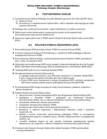 REGULAMIN KRAJOWEJ KOMISJI SĘDZIOWSKIEJ Polskiego Związku Bilardowego §I POSTANOWIENIA OGÓLNE 1. Licencjonowanym Sędzią Polskiego Związku Bilardowego może być obywatel RP, który: a) ukończył 18 lat b) uczestniczył w szkoleniu/kursie sędziowskim i zdał w aktualnie obowiązującym trybie egzamin sędziowski 2. Sędziego musi cechować bezstronność i odpowiedzialność za wydane orzeczenia. 3. Sędzia musi swoim zachowaniem i postawą przyczyniać się do popularyzacji oraz podnoszenia rangi sportów bilardowych. 4. Najwyższy organ sędziowski w PZBil stanowi Krajowa Komisja Sędziowska (zwana dalej KKS). § II KRAJOWA KOMISJA SĘDZIOWSKA (KKS) 1. Przewodniczącego KKS powołuje Zarząd PZBil na wniosek Prezesa PZBil. 2. Z chwilą rozpoczęcia kadencji Przewodniczący i członkowie KKS podlegają wyłącznie urzędującemu Prezesowi PZBil. 3. Przewodniczący KKS powołuje, z grona licencjonowanych Sędziów PZBil, pozostałych (min. 2/max. 4) członków KKS. 4. Odwołanie przewodniczącego KKS może nastąpić wyłącznie jednogłośną decyzją Zarządu PZBil. Odwołanie Przewodniczącego KKS jest jednoznaczne z odwołaniem składu KKS. 5. Kadencja KKS pokrywa się z kadencją Zarządu PZBil. 6. Zarządzenia Krajowej Komisji Sędziowskiej: a/ zapadają większością głosów, przy obecności minimum 2/3 członków składu KKS, b/ przy równej liczbie głosów decyduje głos Przewodniczącego, c/ Prezes PZBil może wnioskować o zmianę Zarządzenia KKS; uchylenie zarządzenia KKS może nastąpić jedynie poprzez jednogłośną decyzję Zarządu PZBil. 7. W posiedzeniach KKS mogą uczestniczyć osoby trzecie/eksperci, jednakże wyłącznie z głosem doradczym 8. Zadania Krajowej Komisji Sędziowskiej: • opracowywanie i korekty Regulaminu KKS oraz Regulaminu Sędziowskiego KKS, • współpraca z Zarządem PZBil i podległymi mu strukturami (Komisje, Stowarzyszenia, Kluby, itp.) w zakresie działalności merytorycznej (sędziowskiej), • zarzadzanie strukturami szkoleń sędziowskich, • zarządzanie istniejącą bazą Sędziów PZBil, • koordynowanie obsad sędziowskich dla potrzeb turniejów, • doradztwo w zakresie organizacji i dokumentacji turniejów, zasad i systemów rozgrywek, itp., • dbałość o rozwój środowiska sędziowskiego podległego PZBil, ze szczególnym uwzględnieniem poprawy warunków pracy, szkoleń, funkcjonowania i wynagradzania sędziów, itp., • wszelkie działania mające na celu szeroko rozumianą popularyzację sportów bilardowych, ale wyłącznie w zakresie działalności merytorycznej (sędziowskiej) 9. Z końcem roku Krajowa Komisja Sędziowska składa Zarządowi PZBil sprawozdanie z rocznej działalności. § III PRAWA I OBOWIĄZKI 1. Prawa sędziego. Sędziowie PZBil mają prawo do: a) ochrony ze strony organizatora/gospodarza turnieju, od momentu rozpoczęcia pełnienia funkcji sędziowskich do zakończenia turnieju lub, w szczególnych przypadkach, do momentu rozpoczęcia podróży powrotnej do miejsca zamieszkania, b) pomocy ze strony organizatora/gospodarza we wszelkich sprawach organizacyjnych związanych z turniejem, zwłaszcza w zakresie utrzymania porządku na „Sali Gier”, zapewnienia niezbędnych akcesoriów oraz ewentualnych prac fizycznych (organizacja „Sali Gier”, przenoszenie ciężkich przedmiotów, itp), c) wyżywienia i napojów na okres trwania Turnieju (chyba, że odrębne ustalenia będą stanowiły inaczej), d) zwrotu kosztów podróży (w uzasadnionych przypadkach); ustalenia dotyczące podróży powinny priorytetowo uwzględniać zasadę umożliwienia najkrótszego (najszybszego) dojazdu na turniej i powrotu do miejsca zamieszkania, e) potwierdzenia przez organizatora/gospodarza faktu obsługi turnieju wraz z oceną wykonanej pracy (na żądanie), f) wynagrodzenia za wykonywaną pracę wg bieżących „zasad rynkowych” (chyba, że indywidualne ustalenia będą stanowiły inaczej). 2. Obowiązki sędziego. Obowiązkiem Sędziego PZBil jest: a) przestrzeganie obowiązujących Przepisów i Regulacji PZBil. b) podporządkowanie się aktualnie obowiązującym Regulaminom PZBil oraz Zarządzeniom KKS; zwłaszcza bieżące śledzenie pojawiających się w nich (ogólnie dostępnych) zmian, c) utrzymywanie stanu wiedzy sędziowskiej na poziomie odpowiednim do posiadanej klasy, d) dążenie do uaktualniania wiedzy oraz ciągłe podnoszenie swoich kwalifikacji, e) w przypadku oficjalnej obsługi turnieju nie posiadającego sankcji PZBil - uprzednie, każdorazowe uzyskanie pisemnej zgody Komisji Sportowej PZBil, f) udział w obowiązkowych szkoleniach organizowanych przez KKS, g) w czasie pełnienia obowiązków występować w obowiązującym stroju sędziowskim, h) coroczne uiszczanie opłaty licencyjnej w wysokości i zgodnie z trybem ustalonym przez Zarząd PZBIL. § IV KLASY SĘDZIOWSKIE 1. Klasyfikacja klas sędziowskich. Określa się następujące klasy sędziowskie PZBil: a) Klasa D - sędzia klubowy, b) Klasa C - sędzia okręgowy, c) Klasa B - sędzia krajowy, d) Klasa A - sędzia klasy międzynarodowej. 2. Nadawanie, warunki podwyższania oraz weryfikacja klas sędziowskich. • uprawnienia sędziowskie nadaje każdorazowo Zarząd PZBil tylko na wniosek KKS, • uprawnienia Sędziego klasy D nadawane są zgodnie z § I pkt 1, • podwyższanie lub weryfikacja klas sędziowskich następuje zgodnie z powyższym trybem; dodatkowo KKS w każdej kadencji określa w odpowiednim zarządzeniu wymogi uzupełniające, • uzyskanie uprawnień Sędziego klasy B może nastąpić wyłącznie po pozytywnym zaliczeniu egzaminu sędziowskiego złożonego przed KKS (w składzie minimum dwuosobowym), • uprawnienia Sędziego klasy A uzyskuje się zgodnie z trybem wyznaczonym przez EPBF; kandydaci do uzyskania tych uprawnień muszą: a/ uzyskać rekomendację KKS do Zarządu PZBil i, c/ posiadać dobrą, komunikatywną znajomość języka angielskiego. Licencjonowani sędziowie klas D, C i B podlegają coroczni