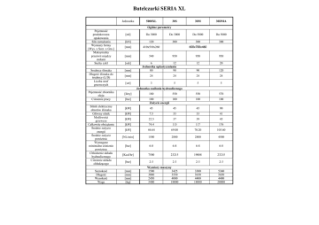 Butelczarki SERIA XL Jednostka 5000XL 30S 30M 30DMA Do 3000 Do 3000 Do 5000 Do 5000 300 300 300 Ogólne parametry Pojemność produkowana opakowania Siła zamykania Wymiary formy [Wys. x Szer. x Gru.] Maksymalny prześwit między stołami Suchy cykl Średnica ślimaka Długość ślimaka do średnicy (L/D) Liczba stref grzewczych [ml] [kN] 120 [mm] 410x510x260 [mm] 540 [sek] [mm] 600x700x460 950 950 950 6 12 Jednostka uplastyczniania 80 90 12 20 90 120 [mm] 24 24 24 24 [szt] 3 5 5 5 Jednostka zasilania hydraulicznego Pojemność zbiornika oleju Ciśnienie pracy Silnik elektryczny obrotów ślimaka Główny silnik Możliwości grzewcze Całkowite obciążenie Średnie zużycie energii Średnie zużycie powietrza Wymagane minimalne ciśnienie powietrza Chłodzenie układu hydraulicznego Ciśnienie układu chłodzącego Szerokość Długość Wysokość Waga [litry] 180 550 550 570 [bar] 100 Zużycie energii 100 100 100 [kW] 45 45 45 90 [kW] 7.5 33 33 41 [kW] 22.5 37 39 45 [kW] 74.4 115 117 176 [kW] 44.64 69.00 70.20 105.60 [NL/min] 1500 2800 2800 4500 [bar] 6-8 6-8 6-8 6-8 [Kcal/hr] 7500 23215 19088 23215 [bar] 2-3 2-3 2-3 2-3 3300 5650 4400 18000 5360 5650 4400 20000 [mm] [mm] [mm] [kg] Wymiary maszyny 1580 3425 3080 5550 2450 4000 5400 18000