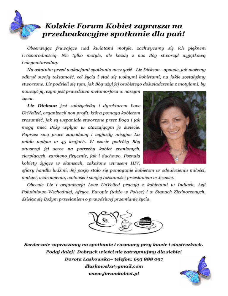 Kolskie Forum Kobiet zaprasza na przedwakacyjne spotkanie dla pań! Obserwując fruwające nad kwiatami motyle, zachwycamy się ich pięknem i różnorodnością. Nie tylko motyle, ale każdą z nas Bóg stworzył wyjątkową i niepowtarzalną. Na ostatnim przed wakacjami spotkaniu nasz gość - Liz Dickson - opowie, jak możemy odkryć swoją tożsamość, cel życia i stać się wolnymi kobietami, na jakie zostałyśmy stworzone. Liz podzieli się tym, jak Bóg użył jej osobistego doświadczenia z motylami, by nauczyć ją, czym jest prawdziwa metamorfoza w naszym życiu. Liz Dickson jest założycielką i dyrektorem Love UnVeiled, organizacji non profit, która pomaga kobietom zrozumieć, jak są wspaniale stworzone przez Boga i jak mogą mieć Boży wpływ w otaczającym je świecie. Poprzez swą pracę zawodową i wyjazdy misyjne Liz miała wpływ w 45 krajach. W czasie podróży Bóg otworzył jej serce na potrzeby kobiet zranionych, cierpiących, zarówno fizycznie, jak i duchowo. Poznała kobiety żyjące w slamsach, zakażone wirusem HIV, ofiary handlu ludźmi. Jej pasją stało się pomaganie kobietom w odnalezieniu miłości, nadziei, uzdrowienia, wolności i swojej tożsamości przesłaniem w Jezusie. Obecnie Liz i organizacja Love UnVeiled pracują z kobietami w Indiach, Azji Południowo-Wschodniej, Afryce, Europie (także w Polsce) i w Stanach Zjednoczonych, dzieląc się Bożym przesłaniem o prawdziwej przemianie życia. Serdecznie zapraszamy na spotkanie i rozmowy przy kawie i ciasteczkach. Podaj dalej! Dobrych wieści nie zatrzymujmy dla siebie! Dorota Laskowska– telefon: 693 888 097 [email protected] www.forumkobiet.pl Metamorfoza: rozwiń skrzydła i fruń Liz Dickson Niedziela, 12 czerwca 2016 godz. 16.00–18.00 Sala w Domu Parafialnym (Fara) Koło, ul. Kościelna 10