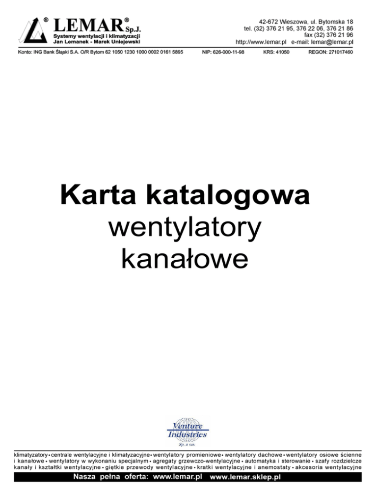 Karta katalogowa wentylatory kanałowe wentylatory kanałowe IBF Zastosowanie Wentylatory IBF znajdują zastosowanie w różnorodnych instalacjach wentylacji mechanicznej, łączą zalety wentylatorów osiowych - kierunek przepływu i promieniowych - stabilny spręż, niski poziom hałasu, wysoka sprawność. Przykładowe zastosowania to wentylacja nawiewna i wywiewna mieszkań, biur, sklepów, barów, kawiarni, restauracji. Konstrukcja Wentylatory kanałowe przeznaczone do montażu w dowolnej pozycji w prostokątnych kanałach wentylacyjnych. Obudowa zgrzewana z ocynkowanej blachy stalowej, z klapą umożliwiająca dostęp do wirnika i silnika bez demontażu instalacji. Od strony wlotowej i wylotowej wyposażona w kołnierze montażowe szerokości 20 mm. Łatwe podłączenie zasilania elektrycznego zapewnia puszka przyłączeniowa. Wirniki z łopatkami pochylonymi do tyłu przystosowane są do transportu maksymalnej ilości powietrza przy wysokim ciśnieniu statycznym przy minimalnym poziomie hałasu. Wirniki, w zależności od wielkości urządzenia, wykonane są z tworzywa sztucznego (180 i 220), z galwanizowanej blachy stalowej (280), z blachy aluminiowej (315, 355, 400, 450, 500, 560). Na zamówienie wentylatory mogą być wykonane w dowolnym kolorze palety RAL. 40oC Silnik elektryczny Silnik elektryczny wykonany zgodnie z obowiązującymi Dyrektywami oraz klasami sprawności, oznaczony znakiem CE. Silnik dostosowany do napięciowej regulacji obrotów, wyposażony w zabezpieczenie termiczne (TP). Klasa izolacji – B. Stopień ochrony - IP44. Zasilanie - trójfazowe 230/400V 50Hz, 400V 50Hz lub jednofazowe 230V 50Hz (w zależności od modelu wentylatora i mocy silnika). Schemat podłączenia elektrycznego: rys. 13a Dane techniczne moc silnika [W] prędkość obrotowa [obr./min] napięcie [V] [A] wydajność max. [m3/h] IBF/2-190 75 2400 230 0,35 600 300 IBF/2-220 85 2790 230 0,43 900 400 IBF/2-280 260 1850 230 1,1 1500 540 76 60 16 41010030 IBF/4-280 90 1400 230 0,4 1000 150 61 55 15,5 41010040 Typ natężenie ciśnienie poziom ciśnienia max. akustycznego [Pa] [dB(A)] temp. pracy max. [0C] masa nr artykułu 64 60 7,5 41010010 71 65 12 41010020 [kg] IBF/4-315S 120 1440 230 0,56 1400 230 66 60 22 41010050 IBF/4-355S 230 1400 230 1,2 2250 270 68 60 33 41010060 IBF/6-315S 37 965 230 0,18 1050 120 51 60 22 41010070 IBF/6-355S 70 875 230 0,33 1700 140 55 60 33 41010080 IBF/4-315T 100 1400 400 0,48 1400 230 66 60 22 41010090 IBF/4-355T 200 1400 400 1,1 2250 270 68 60 33 41010100 IBF/4-400S 370 1415 230 1,64 4050 380 78 70 35 41010110 IBF/4-400T 460 1345 400 0,85 4050 380 78 70 35 41010120 IBF/6-400S 160 880 230 1,6 2750 170 67 70 35 41010130 IBF/6-400T 160 890 400 0,36 2750 170 67 70 35 41010140 IBF/4-450S 740 1280 230 3,2 5500 440 83 70 85 41010150 IBF/4-450T 690 1230 400 1,3 5500 440 83 50 85 41010160 IBF/6-450S 240 840 230 1,05 3800 210 74 70 85 41010170 IBF/6-450T 250 880 400 0,6 3800 210 74 50 85 41010180 IBF/4-500S 1300 1320 230 4,7 7800 600 83 55 122 41010190 IBF/4-500T 1200 1320 400 2,2 7800 600 83 70 117 41010200 IBF/6-500S 380 820 230 1,65 5150 250 73 60 110 41010210 IBF/6-500T 390 850 400 0,81 5150 250 73 60 110 41010220 IBF/4-560T 1800 1230 400 3,41 10200 690 88 50 155 41010250 IBF/6-560S 810 670 230 3 7500 300 78 55 155 41010260 IBF/6-560T 690 850 400 1,5 7500 300 78 70 150 41010270 Akcesoria regulator REB str. 742 regulator RMB, RMT str. 742 nagrzewnice kanałowe RH str. 96 tłumiki kanałowe RCS str. 99 www.venture.pl filtry DFR str. 102 złącza przecidrganiowe IAE str. 103 47 wentylatory kanałowe IBF Wymiary [mm] Typ A 402 C E G 190 H O A B D F B 298 C 148 D 320 E 170 F 340 G 190 OH 9 220 502 398 198 420 220 440 240 9 280 532 498 248 520 270 540 290 9 315 565 500 298 522 320 540 338 9 355 725 600 348 622 370 640 388 9 400 725 600 348 622 370 640 388 9 450 725 700 400 722 422 740 440 9 500 880 800 500 822 522 840 540 9 560 1000 1000 500 1022 522 1040 540 9 Charakterystyki pracy IBF/2-190 [Pa] IBF/2-220 Ciśnienie statyczne Ciśnienie statyczne [Pa] Wydajność Wydajność IBF/2-280 [Pa] [m3/h] IBF/4-280 Ciśnienie statyczne Ciśnienie statyczne [Pa] [m3/h] Wydajność [m3/h] Wydajność [m3/h] 48 Venture Industries Sp. z o.o. ul. Mokra 27, 05-092 Łomianki - Kiełpin tel. +48 22 751 95 50, 751 20 31 fax +48 22 751 22 59, 751 12 02 e-mail: [email protected] wentylatory kanałowe IBF Charakterystyki pracy IBF/4-315 [Pa] IBF/6-315 Ciśnienie statyczne Ciśnienie statyczne [Pa] Wydajność Wydajność IBF/4-355 [Pa] [m3/h] IBF/6-355 Ciśnienie statyczne Ciśnienie statyczne [Pa] [m3/h] Wydajność [Pa] [m3/h] IBF/6-400 Ciśnienie statyczne IBF/4-400 Ciśnienie statyczne [Pa] Wydajność [m3/h] Wydajność www.venture.pl [m3/h] Wydajność [m3/h] 49 wentylatory kanałowe IBF Charakterystyki pracy IBF/4-450 [Pa] IBF/6-450 Ciśnienie statyczne Ciśnienie statyczne [Pa] Wydajność IBF/4-500 [Pa] [m3/h] IBF/6-500 Ciśnienie statyczne Ciśnienie statyczne [Pa] Wydajność [m3/h] Wydajność Wydajność IBF/4-560 [Pa] [m3/h] IBF/6-560 Ciśnienie statyczne Ciśnienie statyczne [Pa] [m3/h] Wydajność [m3/h] Wydajność [m3/h] 50 Venture Industries Sp. z o.o. ul. Mokra 27, 05-092 Łomianki - Kiełpin tel. +48 22 751 95 50, 751 20 31 fax +48 22 751 22 59, 751 12 02 e-mail: [email protected]