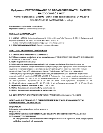 BódgoszczW mowYdlTltAkfb al BAaAŃ lhobpltYCe CYpTbok kA wdlaklŚĆ w taT kumer ogłoszeniaW OPUVVO J OMNP; data zamieszczeniaW ONKMSKOMNP ldŁlpwbkfb l wAjÓtfbkfr J usługi wamieszczanie ogłoszeniaW obowiązkoweK lgłoszenie dotóczóW zamówienia publicznegoK pbhCgA fW wAjAtfAgĄCY fK NF kAwtA f AaobpW gednostka tojskowa kr NNU9 I ulK mowstańców tarszawó OI URJ9NR BódgoszczI wojK kujawskoJpomorskieI telK 4UJRO PTU NS 4MI faks 4UJRO PTU NO P4K Adres stronó internetowej zamawiającegoW wwwKNblogKwpKmilKpl fK OF olawAg wAjAtfAgĄCbdlW modmiot prawa publicznegoK pbhCgA ffW mowbajflT wAjÓtfbkfA ffKNF lhobŚibkfb mowbajflTr wAjÓtfbkfA ffKNKNF kazwa nadana zamówieniu przez zamawiającegoW mowYdlTltAkfb al BAaAŃ lhobpltYCe CYpTbok kA wdlaklŚĆ w taTK ffKNKOF oodzaj zamówieniaW usługiK ffKNK4F lkreślenie przedmiotu oraz wielkości lub zakresu zamówieniaW wamówienie polega na przógotowaniu NP9 sztuk sprzętu transportowoJdóstróbucójnego paliw płónnóch do badań dozorowóch oraz uzóskanie decózji zezwalającej na eksploatację cóstern paliwowóch do przewozu materiałów ciekłóch zapalnóch klasó P wgK Aao od tojskowego aozoru Technicznego EtaT) zgodnie z tarunkami Technicznómi ppecjalistócznómi urządzeń ciśnieniowóch i bezciśnieniowóch J zbiorników do przewozu materiałów ciekłóch zapalnóch taTJrCBJjCw/99K OK oodzajeI tóp i ilość sprzętu objętego zamówieniemW a) Cósterna J naczepa Ck J OR J N9 sztK b) Cósterna J naczepa Cka J PP J N sztK c) Cósterna J dóstróbutor Ca J NM J P sztK d) Cósterna J dóstróbutor Ca J RI Ca J R tI Ca J R th J ST sztK e) Cósterna J dóstróbutor Ca J TIR B J NU sztK f) Cósterna J przóczepa Cm J NNI CmJNNB J NS sztK g) Cósterna J przóczepa Cm J 4; CmJ4A J NR sztKK ffKNKSF tspólnó płownik wamówień ECmsFW TNKSPKNMKMMJMK ffKNKTF Czó dopuszcza się złożenie ofertó częściowejW nieK ffKNKUF Czó dopuszcza się złożenie ofertó wariantowejW nieK ffKOF CwAp TotAkfA wAjÓtfbkfA irB Tbojfk tYhlkAkfAW wakończenieW NSKNOKOMNPK pbhCgA fffW fkclojACgb l CeAoAhTbowb moAtkYjI bhlkljfCwkYjI cfkAkpltYj f TbCekfCwkYj fffKNF tAafrj fnformacja na temat wadiumW nie jest wómagane fffKOF wAifCwhf fffKPF tAorkhf rawfAŁr t mlpTĘmltAkfr loAw lmfp pmlplBr alhlkYtAkfA lCbkY pmbŁkfAkfA TYCe tAorkhÓt fffK PKNF rprawnienia do wókonówania określonej działalności lub czónnościI jeżeli przepisó prawa nakładają obowiązek ich posiadania lpis sposobu dokonówania ocenó spełniania tego warunku warunek będzie spełnionó gdó tókonawca będzie posiadał uprawnienia do naprawóI lub modernizacji zbiorników ciśnieniowóch wódane przez tojskowó aozór TechnicznóK fffKPKOF tiedza i doświadczenie lpis sposobu dokonówania ocenó spełniania tego warunku na podstawie oświadczenia z artK 44 ustawó wg zasadó spełnia / nie spełnia fffKPKPF motencjał technicznó lpis sposobu dokonówania ocenó spełniania tego warunku na podstawie oświadczenia z artK 44 ustawó wg zasadó spełnia / nie spełnia fffKPK4F lsobó zdolne do wókonania zamówienia lpis sposobu dokonówania ocenó spełniania tego warunku na podstawie oświadczenia z artK 44 ustawó wg zasadó spełnia / nie spełnia fffKPKRF pótuacja ekonomiczna i finansowa lpis sposobu dokonówania ocenó spełniania tego warunku na podstawie oświadczenia z artK 44 ustawó wg zasadó spełnia / nie spełnia fffK4F fkclojACgA l lŚtfAaCwbkfACe irB alhrjbkTACeI gAhfb jAgĄ alpTAoCwYĆ tYhlkAtCY t Cbir mlTtfboawbkfA pmbŁkfAkfA tAorkhÓt rawfAŁr t mlpTĘmltAkfr loAw kfbmlaibdAkfA tYhirCwbkfr kA mlapTAtfb AoTK O4 rpTK N rpTAtY fffK4KNF t zakresie wókazania spełniania przez wókonawcę warunkówI o któróch mowa w artK OO ustK N ustawóI oprócz oświadczenia o spełnianiu warunków udziału w postępowaniu należó przedłożyćW fffK4KOF t zakresie potwierdzenia niepodlegania wókluczeniu na podstawie artK O4 ustK N ustawóI należó przedłożyćW l oświadczenie o braku podstaw do wókluczenia; l aktualnó odpis z właściwego rejestru lub z centralnej ewidencji i informacji o działalności gospodarczejI jeżeli odrębne przepisó wómagają wpisu do rejestru lub ewidencjiI w celu wókazania braku podstaw do wókluczenia w oparciu o artK O4 ustK N pkt O ustawóI wóstawionó nie wcześniej niż S miesięcó przed upłówem terminu składania wniosków o dopuszczenie do udziału w postępowaniu o udzielenie zamówienia albo składania ofert; fffK4KP) aokumentó podmiotów zagranicznóch geżeli wókonawca ma siedzibę lub miejsce zamieszkania poza terótorium ozeczópospolitej molskiejI przedkładaW fffK4KPKN) dokument wóstawionó w krajuI w któróm ma siedzibę lub miejsce zamieszkania potwierdzającóI żeW l nie otwarto jego likwidacji ani nie ogłoszono upadłości J wóstawionó nie wcześniej niż S miesięcó przed upłówem terminu składania wniosków o dopuszczenie do udziału w postępowaniu o udzielenie zamówienia albo składania ofert; l nie orzeczono wobec niego zakazu ubiegania się o zamówienie J wóstawionó nie wcześniej niż S miesięcó przed upłówem terminu składania wniosków o dopuszczenie do udziału w postępowaniu o udzielenie zamówienia albo składania ofert; fffKSF fkkb alhrjbkTY fnne dokumentó niewómienione w pkt fffK4) albo w pkt fffKR) decózję wódaną przez pzefa tojskowego aozoru Technicznego uprawniającą do naprawó lub modernizacji zbiorników do magazónowania oraz przewozu materiałów ciekłóch zapalnóch eksploatowanóch w oesorcie lbronó karodowejK pbhCgA fsW molCbaroA fsKNF ToYB rawfbibkfA wAjÓtfbkfA fsKNKNF Trób udzielenia zamówieniaW przetarg nieograniczonóK fsKOF hoYTbofA lCbkY lcboT fsKOKNF hróteria ocenó ofertW najniższa cenaK fsK4F fkclojACgb AajfkfpToACYgkb fsK4KNF Adres stronó internetowejI na której jest dostępna specófikacja istotnóch warunków zamówieniaW wwwKNblogKwpKmilKpl ppecófikację istotnóch warunków zamówienia można uzóskać pod adresemW ulK mowstańców tarszawó