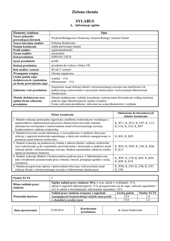 Zielona chemia SYLABUS A. Informacje ogólne Elementy sylabusu Opis Nazwa jednostki prowadzącej kierunek Nazwa kierunku studiów Poziom kształcenia Profil studiów Forma studiów Kod przedmiotu Język przedmiotu Wydział Biologiczno-Chemiczny, Instytut Biologii, Instytut Chemii Rodzaj przedmiotu Rok studiów /semestr Wymagania wstępne Liczba godzin zajęć dydaktycznych z podziałem na formy prowadzenia zajęć przedmiot do wyboru z bloku VII III rok V semestr Chemia organiczna Założenia i cele przedmiotu Metody dydaktyczne oraz ogólna forma zaliczenia przedmiotu Ochrona Środowiska studia pierwszego stopnia ogólnoakademicki stacjonarne 0200-OS1-3ZCH polski wykład – 15 h laboratorium – 15 h Znajomość zasad zielonej chemii i zrównoważonego rozwoju oraz możliwości ich praktycznego zastosowania w przemyśle chemicznym i nowoczesnym laboratorium chemicznym. Metody dydaktyczne: wykład, konsultacje, wykonywanie doświadczeń według instrukcji podczas zajęć laboratoryjnych, analiza wyników Formy zaliczenia przedmiotu: zaliczenie na ocenę laboratoriów i wykładu Odniesienie do kierunkowych efektów kształcenia Efekty kształcenia 1. Student wskazuje potencjalne zagrożenia i problemy środowiskowe wynikające z nieprawidłowo zaplanowanych procesów chemicznych oraz umie wskazać alternatywne rozwiązania z zastosowaniem zasad zrównoważonego rozwoju, bezpieczeństwa i ochrony środowiska. 2. Student krytycznie ocenia informacje, w tym podawane w mediach, dotyczące ochrony i zagrożeń środowiska naturalnego, a także jest osobiście zaangażowany w promocję zasad ochrony środowiska. 3. Student wykazuje się podstawową wiedzą z zakresu chemii i ochrony środowiska oraz wykorzystuje ją do wyjaśniania, przewidywania i stosowania w praktyce zasad zielonej chemii i zrównoważonego rozwoju. Student samodzielnie zdobywa wiedzę opartą na literaturze fachowej. 4. Student wykazuje dbałość o bezpieczeństwo podczas pracy w laboratorium oraz mieć świadomość poszanowania pracy własnej i innych, postępuje zgodnie z etyką zawodową. 5. Student przygotowuje raporty i sprawozdania dotyczące wykorzystania zasad zielonej chemii i zrównoważonego rozwoju w laboratorium chemicznym. Punkty ECTS Bilans nakładu pracy studenta Wskaźniki ilościowe Data opracowania: K_W11, K_W12, K_U07, K_U15, K_U16, K_U22, K_K07 K_K01, K_K05, K_W01, K_W02, K_U06, K_K06, K_K12 K_W07, K_U20, K_K03, K_K04, K_K09, K_K10 K_W06, K_U03, K_U06, K_U07, K_U08 2 Ogólny nakład pracy studenta: 50 h, w tym: udział w wykładach: 15 h; udział w zajęciach laboratoryjnych: 15 h; przygotowanie się do zajęć, zaliczeń, egzaminów: 16,3 h; udział w konsultacjach, zaliczeniach, egzaminie: 3,8 h. Nakład pracy studenta związany z zajęciami: Liczba godzin Punkty ECTS 33,8 1,4 wymagającymi bezpośredniego udziału nauczyciela 35,0 1,4 o charakterze praktycznym 23.09.2014 Koordynator przedmiotu: dr Aneta Nodzewska SYLABUS B. Informacje szczegółowe Elementy składowe sylabusu Nazwa przedmiotu Kod przedmiotu Nazwa kierunku Nazwa jednostki prowadzącej kierunek Język przedmiotu Rok studiów/ semestr Liczba godzin zajęć dydaktycznych oraz forma prowadzenia zajęć Prowadzący Treści merytoryczne przedmiotu: Efekty kształcenia wraz ze sposobem ich weryfikacji Forma i warunki zaliczenia przedmiotu Wykaz literatury podstawowej i uzupełniającej Opis Zielona chemia 0200-OS1-3ZCH Ochrona Środowiska Wydział Biologiczno-Chemiczny, Instytut Biologii, Instytut Chemii polski III rok V semestr 15 h, wykład dr Aneta Nodzewska 1. Koncepcja zrównoważonego rozwoju i zielonej chemii. 2. Kataliza, oszczędność atomowa a projektowanie syntez organicznych. 3. Zastosowanie surowców odnawialnych 4. Zielone” media reakcyjne (woda, ciecze jonowe, płyny w stanie nadkrytycznym) 5. Polimery w zielonej chemii 6. Nowe rozwiązania w przemyśle chemicznym 7. Zielona chemia analityczna Efekty kształcenia: 1. Student wskazuje potencjalne zagrożenia i problemy środowiskowe wynikające z nieprawidłowo zaplanowanych procesów chemicznych oraz wskazuje alternatywne rozwiązania z zastosowaniem zasad zrównoważonego rozwoju, bezpieczeństwa i ochrony środowiska. 2. Student krytycznie ocenia informacje, w tym podawane w mediach, dotyczące ochrony i zagrożeń środowiska naturalnego, a także jest osobiście zaangażowany w promocję zasad ochrony środowiska. 3. Student wykazuje się podstawową wiedzą (z zakresu chemii organicznej, nieorganicznej, fizycznej i analitycznej) oraz wykorzystuje ją do wyjaśniania, przewidywania i stosowania w praktyce zasad zielonej chemii i zrównoważonego rozwoju. Sposoby weryfikacji: 1. Test pisemny podsumowujący przedmiot (pytania otwarte opisowe) 1. Obecność na zajęciach (dopuszcza się możliwość opuszczenia dwóch wykładów). 2. Pozytywna ocena zaliczenia laboratoriów. 3. Pozytywna ocena z testu końcowego. Literatura podstawowa: 1. B. Burczyk, Zielona Chemia, Oficyna Wydawnicza Politechniki Wrocławskiej, Wrocław 2006. 2. T. Paryjczak, A. Lewicki, M. Zaborski, Zielona chemia, PAN, Łódź, 2005. 3. Wybrane artykuły z czasopism „Przemysł Chemiczny”, „Wiadomości chemiczne” Literatura uzupełniająca: 1. P.T. Anastas, Ed., Handbook of Green Chemistry – Green Catalysis, Wiley 2009 ………………………………. podpis osoby składającej sylabus SYLABUS C. Informacje szczegółowe Elementy składowe sylabusu Nazwa przedmiotu Kod przedmiotu Nazwa kierunku Nazwa jednostki prowadzącej kierunek Język przedmiotu Rok studiów/ semestr Liczba godzin zajęć dydaktycznych oraz forma prowadzenia zajęć Prowadzący Treści merytoryczne przedmiotu: Efekty kształcenia wraz ze sposobem ich weryfikacji Forma i warunki zaliczenia przedmiotu Wykaz literatury podstawowej i uzupełniającej Opis Zielona chemia 0200-OS1-3ZCH Ochrona Środowiska Wydział Biologiczno-Chemiczny, Instytut Biologii, Instytut Chemii polski III rok V semestr 15 h, laboratorium dr Anet