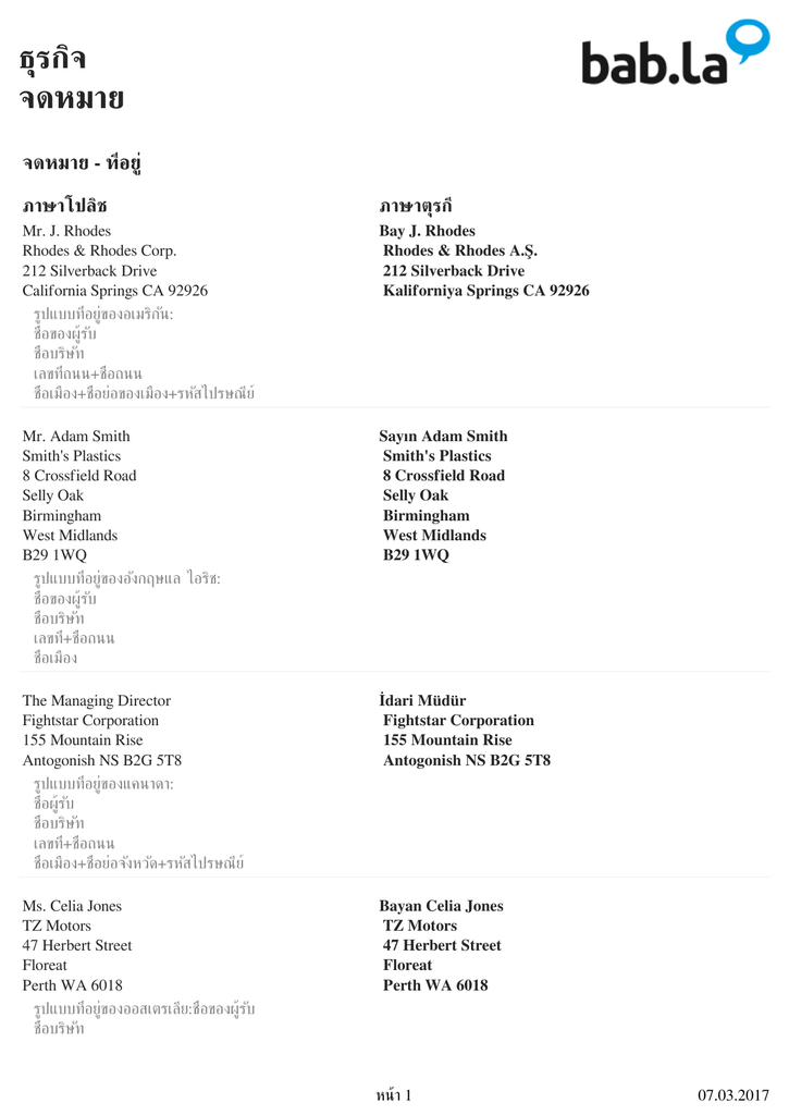 ธุรกิจ จดหมาย จดหมาย - ที่อยู่ ภาษาโปลิช ภาษาตุรกี Mr. J. Rhodes Rhodes & Rhodes Corp. 212 Silverback Drive California Springs CA 92926 รูปแบบที่อยู่ของอเมริกัน: ชื่อของผู้รับ ชื่อบริษัท เลขที่ถนน+ชื่อถนน ชื่อเมือง+ชื่อย่อของเมือง+รหัสไปรษณีย์ Bay J. Rhodes Rhodes & Rhodes A.Ş. 212 Silverback Drive Kaliforniya Springs CA 92926 Mr. Adam Smith Smith's Plastics 8 Crossfield Road Selly Oak Birmingham West Midlands B29 1WQ รูปแบบที่อยู่ของอังกฤษและไอริช: ชื่อของผู้รับ ชื่อบริษัท เลขที่+ชื่อถนน ชื่อเมือง Sayın Adam Smith Smith's Plastics 8 Crossfield Road Selly Oak Birmingham West Midlands B29 1WQ The Managing Director Fightstar Corporation 155 Mountain Rise Antogonish NS B2G 5T8 รูปแบบที่อยู่ของแคนาดา: ชื่อผู้รับ ชื่อบริษัท เลขที่+ชื่อถนน ชื่อเมือง+ชื่อย่อจังหวัด+รหัสไปรษณีย์ İdari Müdür Fightstar Corporation 155 Mountain Rise Antogonish NS B2G 5T8 Ms. Celia Jones TZ Motors 47 Herbert Street Floreat Perth WA 6018 รูปแบบที่อยู่ของออสเตรเลีย:ชื่อของผู้รับ ชื่อบริษัท Bayan Celia Jones TZ Motors 47 Herbert Street Floreat Perth WA 6018 หน้า 1 07.03.2017 ธุรกิจ จดหมาย เลขที่ถนน+ชื่อถนน ชื่อจังหวัด ชื่อเมือง+รหัสไปรษณีย์ Miss L. Marshall Aquatechnics Ltd. 745 King Street West End Wellington 0680 รูปแบบที่อยู่ของนิวซีแลนด์:ชื่อผู้รับ ชื่อบริษัท เลขที่+ชื่อถนน บ้านเลขที่ เมือง+รหัสไปรษณีย์ Bayan L. Marshall Aquatechnics Ltd. 745 King Street West End Wellington 0680 Mirosław Zdaniuk Sayın Ahmet Koril, Kalapak A.Ş. Okonel Sp. z.o.o. Kadife sokak no:17 ul. Złota 3 34705, Bostancı, Kadıköy, İstanbul 00-115 Warszawa ีรูปแบบที่อยู่ของอังกฤษ:ชื่อผู้รับ, ชื่อบริษัท, เลขที่ถนน + ชื่อถนน,ชื่อเมือง + จังหวัด + รหัสไปรษณีย์ จดหมาย - การเปิด ภาษาโปลิช ภาษาตุรกี Szanowny Panie Prezydencie, Sayın Başkan, ทางการเป็นอย่างมาก ผู้รับมีชื่อพิเศษที่ต้องใช้เรียกชื่อแทนตัวเอง Szanowny Panie, ทางการ ผู้รับเพศชาย ไม่รู้จักชื่อ Sayın yetkili, Szanowna Pani, ทางการ, ผู้รับผู้หญิง, ไม่รู้จักชื่อ Sayın yetkili, Szanowni Państwo, ทางการ ชื่อผู้รับและไม่ทราบเพศ Sayın yetkili, Szanowni Państwo, ทางการ เวลาจะจ่าหน้าถึงคนที่ไม่รู้จักหรือทั้งแผนก Sayın yetkililer, หน้า 2 07.03.2017 ธุรกิจ จดหมาย Szanowni Państwo, ทางการ ชื่อผู้รับและในกรณีที่ไม่รู้เพศ İlgili şahsa / makama, Szanowny Panie, ทางการ ผู้รับผู้ชายและในกรณีที่ทราบชื่อ Sayın Ahmet Bey, Szanowna Pani, ทางการ ผู้รับผู้หญิง แต่งงานแล้ว ทราบชื่อ Sayın Nihal Hanım, Szanowna Pani, ทางการ ผู้รับผู้หญิง โสด ทราบชื่อ Sayın Ayşe Hanım, Szanowna Pani, ทางการ ผู้รับเป็นผู้หญิง รู้จักชื่อ ไม่ทราบสถานะแต่งงาน Sayın Melek Hanım, Szanowny Panie, ทางการน้อยลง เคยร่วมทำธุรกิจกับผู้รับมาก่อน Sayın Ahmet Turgan, Drogi Tomaszu, ไม่ทางการ เป็นเพื่อนกับผู้รับ ไม่ค่อยสนิทสนมกัน Sevgili Ali, Piszemy do Państwa w sprawie... ทางการ อนุญาตเปิดในฐานะของบริษัททั้งหมด ... konusuyla ilgili olarak size yazıyoruz. Piszemy do Państwa w związku z... ทางการ อนุญาตเปิดในฐานะของบริษัททั้งหมด ... konusuyla bağlantılı olarak size yazıyoruz. W nawiązaniu do... ...'e istinaden ทางการ เปิดเนื่องจากสิ่งที่คุณเคยเห็นจากบริษัทที่คุณเคยติดต่อเข้ามา Nawiązując do... ...'e atfen ทางการ เพื่อเปิดเนื่องจากสิ่งที่คุณเคยเห็นจากบริษัทที่คุณเคยติดต่อเข้ามา Piszę do Państwa z zapytaniem o... ... hakkında bilgi edinmek için yazıyorum. ทางการน้อยลง เพื่อเปิดเนื่องมาจากตัวคุณเองเ