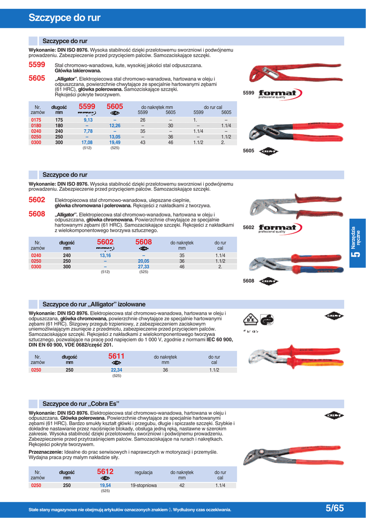 Szczypce do rur Szczypce do rur Wykonanie: DIN ISO 8976. Wysoka stabilnoÊç dzi´ki przelotowemu sworzniowi i podwójnemu prowadzeniu. Zabezpieczenie przed przyci´ciem palców. Samozaciskajàce szcz´ki. 5599 Stal chromowo-wanadowa, kute, wysokiej jakoÊci stal odpuszczana. G∏ówka lakierowana. 5605 „Alligator”. Elektropiecowa stal chromowo-wanadowa, hartowana w oleju i odpuszczana, powierzchnie chwytajàce ze specjalnie hartowanymi z´bami (61 HRC), g∏ówka polerowana. Samozciskajàce szcz´ki. R´kojeÊci pokryte tworzywem. Nr. zamów 0175 0180 0240 0250 0300 d∏ugoÊç mm 5599 5605 175 180 240 250 300 9,13 – 7,78 – 17,08 – 12,26 – 13,05 19,49 (512) (525) do nakr´tek mm 5599 5605 26 – 35 – 43 – 30 – 36 46 5599 5599 do rur cal 5605 1. – 1.1/4 – 1.1/2 – 1.1/4 – 1.1/2 2. 5605 Szczypce do rur Wykonanie: DIN ISO 8976. Wysoka stabilnoÊç dzi´ki przelotowemu sworzniowi i podwójnemu prowadzeniu. Zabezpieczenie przed przyci´ciem palców. Samozaciskajàce szcz´ki. 5608 „Alligator”. Elektropiecowa stal chromowo-wanadowa, hartowana w oleju i odpuszczana, g∏ówka chromowana. Powierzchnie chwytajàce ze specjalnie hartowanymi z´bami (61 HRC). Samozaciskajàce szcz´ki. R´kojeÊci z nak∏adkami z wielokomponentowego tworzywa sztucznego. Nr. zamów 0240 0250 0300 d∏ugoÊç mm 5602 5608 do nakr´tek mm do rur cal 240 250 300 13,16 – – – 20,05 27,33 35 36 46 1.1/4 1.1/2 2. (512) (525) 5602 Narz´dzia r´czne Elektropiecowa stal chromowo-wanadowa, ulepszane cieplnie, g∏ówka chromowana i polerowana. R´kojeÊci z nak∏adkami z tworzywa. 5 5602 5608 Szczypce do rur „Alligator” izolowane Wykonanie: DIN ISO 8976. Elektropiecowa stal chromowo-wanadowa, hartowana w oleju i odpuszczana, g∏ówka chromowana, powierzchnie chwytajàce ze specjalnie hartowanymi z´bami (61 HRC). Âlizgowy przegub trzpieniowy, z zabezpieczeniem zaciskowym uniemo˝liwiajàcym zsuni´cie z przedmiotu, zabezpieczenie przed przyci´ciem palców. Samozaciskajàce szcz´ki. R´kojeÊci z nak∏adkami z wielokomponentowego tworzywa sztucznego, pozwalajàce na prac´ pod napi´ciem do 1 000 V, zgodnie z normami IEC 60 900, DIN EN 60 900, VDE 0682/cz´Êç 201. Nr. zamów 0250 d∏ugoÊç mm 5611 do nakr´tek mm do rur cal 250 22,34 36 1.1/2 (525) Szczypce do rur „Cobra Es” Wykonanie: DIN ISO 8976. Elektropiecowa stal chromowo-wanadowa, hartowana w oleju i odpuszczana. G∏ówka polerowana. Powierzchnie chwytajàce ze specjalnie hartowanymi z´bami (61 HRC). Bardzo smuk∏y kszta∏t g∏ówki i przegubu, d∏ugie i spiczaste szcz´ki. Szybkie i dok∏adne nastawianie przez naciÊni´cie blokady, obs∏uga jednà r´kà, nastawne w szerokim zakresie. Wysoka stabilnoÊç dzi´ki przelotowemu sworzniowi i podwójnemu prowadzeniu. Zabezpieczenie przed przytrzaÊni´ciem palców. Samozaciskajàce na rurach i nakr´tkach. R´kojeÊci pokryte tworzywem. Przeznaczenie: Idealne do prac serwisowych i naprawczych w motoryzacji i przemyÊle. Wydajna praca przy malym nak∏adzie si∏y. Nr. zamów 0250 d∏ugoÊç mm 5612 regulacja do nakr´tek mm do rur cal 250 19,54 19-stopniowa 42 1.1/4 (525) Sta∏e stany magazynowe nie obejmujà artyku∏ów oznaczonych znakiem ◊. Wyd∏u˝ony czas oczekiwania. 5/65 Szczypce do rur Szczypce do rur „Cobra” Wykonanie: Wg normy DIN ISO 8976. Elektropiecowa stal chromowo-wanadowa, hartowana w oleju i odpuszczana. Powierzchnie chwytajàce ze specjalnie hartowanymi z´bami (61 HRC). Szybka i precyzyjna regulacja jednà r´kà za pomocà trzpienia spr´˝ynujàcego. Wysoka stabilnoÊç dzi´ki przelotowemu sworzniowi i podwójnemu prowadzeniu. Zabezpieczanie przeciw przykleszczaniu palców. Szcz´ki samozaciskowe. R´kojeÊci pokryte tworzywem. 5593 5607 Nr. zamów 0150 0180 0250 0300 G∏ówka polerowana. G∏ówka chromowana. 5593 d∏ugoÊç mm 5593 5607 regulacja do nakr´tek mm do rur cal 150 180 250 300 15,68 16,46 17,53 24,08 – 22,06 22,96 29,68 11-stopniowa 11-stopniowa 11-stopniow 14-stopniow 30 30 36 46 1.1/4 1.1/4 1.1/2 2. (525) (525) 5607 Szczypce do rur „Cobra” Wykonanie: DIN ISO 8976. Elektropiecowa stal chromowo-wanadowa, hartowana w oleju i odpuszczana. G∏ówka chromowana. Powierzchnie chwytajàce ze specjalnie hartowanymi z´bami (61 HRC). Szybka i precyzyjna regulacja jednà r´kà za pomocà trzpienia spr´˝ynujàcego. Wysoka stabilnoÊç dzi´ki przelotowemu sworzniowi i podwójnemu prowadzeniu. Zabezpieczanie przeciw przykleszczaniu palców. Szcz´ki samozaciskowe. R´kojeÊci z nak∏adkami z wielokomponentowego tworzywa. Nr. zamów 0250 0300 d∏ugoÊç mm 5609 regulacja do nakr´tek mm do rur cal 250 300 25,20 32,37 11-stopniowa 14-stopniowa 36 46 1.1/2 2. 5 Narz´dzia r´czne (525) Klucz- szczypce do rur „Cobra XL/XXL” Wykonanie: DIN ISO 8976, elektropiecowa stal chromowo-wanadowa, hartowana w oleju. G∏ówka polerowana. Powierzchnie chwytajàce ze specjalnie hartowanymi z´bami (61 HRC). Szybka i precyzyjna regulacja jednà r´kà za pomocà trzpienia spr´˝ynujàcego. Szcz´ki samozaciskowe. Wysoka stabilnoÊç dzi´ki przelotowemu sworzniowi i podwójnemu prowadzeniu. Mogà byç stosowane jako szczypce do rur i pomp. Szczypce o d∏ugoÊci 400 mm sà l˝ejsze o 20 % w porównaniu ze standartowymi szczypcami o tej samej d∏ugoÊci, a szczypce 560 mm- o 40 % w porównaniu do konwencjonalnych szczypiec tej samej wielkoÊci. R´kojeÊci z nak∏adkami z tworzywa sztucznego. Nr. zamów d∏ugoÊç mm 5593 regulacja do nakr´tek mm do rur cal 400 560 41,89 68,77 27-stopniowa 20-stopniowa 95 120 3.1/2 4.1/2 0400 0560 (525) Szczypce do rur „Smart-Grip” Wykonanie: DIN ISO 8976. Elektropiecowa stal chromowo-wanadowa, hartowana w oleju i odpuszczana. G∏ówka polerowana. Powierzchnie chwytajàce ze specjalnie hartowanymi z´bami (61 HRC). Automatyczne zaciskanie na przedmiocie poprzez proste Êciskanie r´kojeÊci, optymalne do cz´stego chwytania ró˝norodnych przedmiotów. Szybka i dok∏adna regulacja pop
