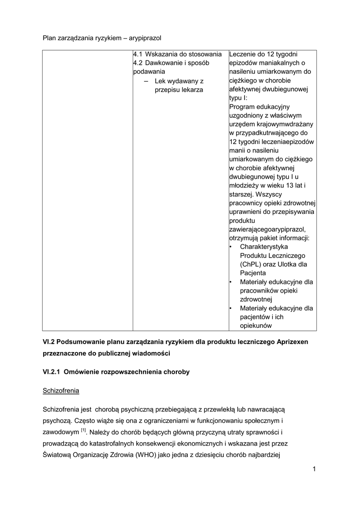Plan zarządzania ryzykiem – arypiprazol 4.1 Wskazania do stosowania 4.2 Dawkowanie i sposób podawania – Lek wydawany z przepisu lekarza Leczenie do 12 tygodni epizodów maniakalnych o nasileniu umiarkowanym do ciężkiego w chorobie afektywnej dwubiegunowej typu I: Program edukacyjny uzgodniony z właściwym urzędem krajowymwdrażany w przypadkutrwającego do 12 tygodni leczeniaepizodów manii o nasileniu umiarkowanym do ciężkiego w chorobie afektywnej dwubiegunowej typu I u młodzieży w wieku 13 lat i starszej. Wszyscy pracownicy opieki zdrowotnej uprawnieni do przepisywania produktu zawierającegoarypiprazol, otrzymują pakiet informacji: • Charakterystyka Produktu Leczniczego (ChPL) oraz Ulotka dla Pacjenta • Materiały edukacyjne dla pracowników opieki zdrowotnej • Materiały edukacyjne dla pacjentów i ich opiekunów VI.2 Podsumowanie planu zarządzania ryzykiem dla produktu leczniczego Aprizexen przeznaczone do publicznej wiadomości VI.2.1 Omówienie rozpowszechnienia choroby Schizofrenia Schizofrenia jest chorobą psychiczną przebiegającą z przewlekłą lub nawracającą psychozą. Często wiąże się ona z ograniczeniami w funkcjonowaniu społecznym i zawodowym [1]. Należy do chorób będących główną przyczyną utraty sprawności i prowadzącą do katastrofalnych konsekwencji ekonomicznych i wskazana jest przez Światową Organizację Zdrowia (WHO) jako jedna z dziesięciu chorób najbardziej 1 Plan zarządzania ryzykiem – arypiprazol przyczyniających się do globalnego obciążenia chorobami(Global Disease Burden)[2]. Schizofrenia występuje na całym świecie. W ujęciu ogólnoświatowym wskaźnik chorobowości schizofrenii (tj. liczba przypadków występujących w populacji w danym momencie) wynosi około 1 procent. Wskaźnik zachorowalności (liczba nowych przypadków rocznie) wynosi około 1,5 na 10 tys. osób [3]. Schizofrenia rozpoznawana jest nieco częściej u mężczyzn niż u kobiet (w stosunku 1,4:1) [4], u kobiet rozpoznanie jest zwykle stawiane w późniejszym okresie życia. Istnieją też przesłanki wskazujące na to, że u mężczyzn rokowania są gorsze [5,6]. Znanych jest wiele czynników ryzyka schizofrenii , między innymi życie na obszarach miejskich [7,8], imigracja [9,10], powikłania położnicze [11] oraz data urodzenia przypadająca na późną zimę/wczesną wiosnę (być może jako efekt kontaktu z wirusem grypy w okresie rozwoju neuronalnego). Badania epidemiologiczne [12] wykazały związek pomiędzy zaawansowanym wiekiem ojca przy poczęciu a zwiększeniem ryzyka zachorowania na schizofrenię, który może być związany ze zwiększonym ryzykiem wystąpienia mutacji de novo[13]. Do charakterystycznych objawów schizofrenii należą objawy pozytywne, takie jak omamy i urojenia, rozkojarzona mowa; objawy negatywne, np. spłycenie afektywne i zubożenie mowy, oraz deficyty poznawcze dotyczące uwagi, pamięci i funkcji wykonawczych. Leki przeciwpsychotyczne stanowią pierwszą linię leczenia schizofrenii. Sprawdzone interwencje psychospołeczne w połączeniu z farmakoterapią mogą pomóc pacjentom wrócić do zdrowia. Choroba afektywna dwubiegunowa typu I Choroba afektywna dwubiegunowa to zaburzenie czynności mózgu, które powoduje nietypowe zmiany nastroju, poziomu energii, aktywności oraz zdolności do wykonywania codziennych zadań [14]. Cechą charakterystyczną tego zaburzenia jest podwyższenie nastroju (mania lub hipomania) [15]. U pacjentów z chorobą afektywną dwubiegunową typu I występują zarówno epizody manii i prawie zawsze epizody depresyjne. U pacjentów cierpiących na chorobę afektywną dwubiegunową typu II występują zarówno epizody hipomanii, jak i epizody depresyjne. W badaniu [16] przeprowadzonym w roku 2007 Merikangas i wsp. wykazali, że zaburzenia afektywne dwubiegunowe występują częściej, niż wcześniej sądzono. Wskaźnik częstości występowania w ciągu całego życia dla choroby afektywnej dwubiegunowej typu I i II wynosił odpowiednio 1,0% oraz 1,1%. Po uwzględnieniu choroby dwubiegunowej z objawami 2 Plan zarządzania ryzykiem – arypiprazol podprogowymi (choroba dwubiegunowa nieokreślona inaczej (NOS)), całkowity wskaźnik częstości występowania w ciągu całego życia dla wszystkich zaburzeń dwubiegunowych wynosił 4,5%. W placówkach opieki zdrowotnej do 20% pacjentów z depresją, którzy zgłaszają się do lekarza pierwszego kontaktu, oraz 40–60% pacjentów z depresją zgłaszających się do psychiatry cierpi na jakąś postać zaburzeń afektywnych dwubiegunowych. Choroba afektywna dwubiegunowa najczęściej pojawia się u osób w wieku 17–21 lat. Badanie przeprowadzone przez Światową Organizację Zdrowia (WHO) wskazało chorobę afektywną dwubiegunową jako szóstą spośród głównych przyczyn niepełnosprawności na świecie w grupie wiekowej 15–44 lat. Zapadalność na tę chorobę jest podobna wśród mężczyzn i kobiet [17], jak również w różnych kulturach i grupach etnicznych. Z badania przeprowadzonego przez WHO wynika, że chorobowość i zachorowalność dla choroby afektywnej dwubiegunowej są bardzo podobne na całym świecie. Standaryzowany względem wieku wskaźnik chorobowości na 100 tys. mieszkańców wahał się od 421,0 w Azji Południowej do 481,7 w Afryce i Europie dla mężczyzn oraz od 450,3 w Afryce i Europie do 491,6 w Oceanii dla kobiet [18]. Stopień nasilenia choroby może się jednak znacznie różnić w poszczególnych częściach świata. Na przykład wskaźnik utraty lat życia skorygowanych niepełnosprawnością jest wyższy w krajach rozwijających się, z powodu słabiej rozwiniętej opieki medycznej i gorszej dostępności leków. Koniec wieku dorastania i wczesny wiek dorosły to lata, w których najczęściej obserwuje się pierwsze wystąpienie choroby afektywnej dwubiegunowej [19,20]. W jednym z badań wykazano również, że w 10% przypadków zaburzeń dwubiegunowych pierwsze wystąpienie manii mi