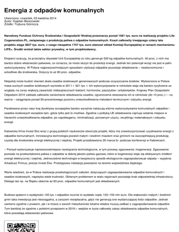 Energia z odpadów komunalnych Utworzono: czwartek, 03 kwietnia 2014 Autor: Kajetan Berezowski Źródło: Trybuna Górnicza Narodowy Fundusz Ochrony Środowiska i Gospodarki Wodnej przeznaczy ponad 1581 tys. euro na realizację projektu Life Cogeneration.PL, związanego z produkcją paliwa z odpadów komunalnych. Koszt całkowity trwającego cztery lata projektu sięga 3827 tys. euro, z czego niespełna 1757 tys. euro stanowi wkład Komisji Europejskiej w ramach mechanizmu LIFE+. Środki wniósł także sektor prywatny, w tym projektodawcy. Eksperci szacują, że przeciętny obywatel Unii Europejskiej co roku generuje 520 kg odpadów komunalnych. 40 proc. z nich ma bardzo dobre właściwości paliwowe, co oznacza, że może służyć do produkcji energii. Jednak ten potencjał wciąż nie jest w pełni wykorzystywany. W Polsce najpowszechniejszym sposobem utylizacji odpadów pozostaje składowanie – nieekonomiczne i szkodliwe dla środowiska. Dotyczy to aż 80 proc. odpadów. Niepokój może budzić również skala osadów ściekowych generowanych podczas oczyszczania ścieków. Wytworzona w Polsce masa suchych osadów ściekowych wyniosła w 2011 r. 621 tys. t. Ich wykorzystywanie w rolnictwie staje się bardzo ryzykowne ze względu na coraz większą zawartość niebezpiecznych bakterii, hormonów, pasożytów i antybiotyków. Krajowy Plan Gospodarki Odpadami 2010 zakłada całkowite zaniechanie składowania osadów, ograniczenie stosowania ich w rolnictwie (do 10 proc.) i – co ważne – osiągnięcie ponad 50-procentowego poziomu unieszkodliwiania metodami termicznymi i odzysku energii. Parafowane przez nasz kraj dyrektywy europejskie bardzo wyraźnie nakazują wtórne wykorzystywanie komunalnych odpadów i osadów ściekowych wszędzie tam, gdzie tylko jest to możliwe. Zgodnie z polityką UE składowanie zajmuje ostatnie miejsce w hierarchii unieszkodliwiania odpadów, po zapobieganiu, minimalizacji, ponownym użyciu, recyklingu materiałowym i odzysku energii. Katowicka firma Invest Eko wraz z grupą polskich naukowców stworzyła projekt, który ma zrewolucjonizować uzyskiwanie energii z odpadów komunalnych. Innowacyjna technologia pozwoli małym i średnim miastom oraz gminom na oszczędniejszą produkcję czystej dla środowiska energii elektrycznej i cieplnej. Projekt przedstawiono 20 marca br. podczas konferencji w Katowicach. – Pomysł wykorzystuje najnowocześniejsze rozwiązania technologiczne, w tym procesy zgazowania i kogeneracji. Zgazowanie pozwala na przekształcenie paliwa z odpadów w dobrej jakości paliwo gazowe, które w kogeneracji staje się efektywnym źródłem energii elektrycznej i cieplnej. Jednocześnie technologia w bezpieczny sposób ekologicznie zagospodarowuje odpady – wyjaśnia Arkadiusz Primus, prezes Invest Eko. Prototypowa instalacja powstanie na terenie województwa śląskiego. Warto wiedzieć, że w Polsce realizacja proekologicznych założeń, dotyczących zagospodarowania odpadów komunalnych i osadów ściekowych, napotyka wiele trudności. Głównym problemem w wielu regionach pozostaje brak odpowiedniej infrastruktury. Dlatego też np. na Śląsku obecnie aż 83 proc. odpadów komunalnych jest składowanych. Budowa spalarni o wydajności 100 tys. t odpadów rocznie to wydatek rzędu 100–150 mln euro. Dla większości małych i średnich gmin taka inwestycja jest nieosiągalna, a zarazem nieopłacalna, gdyż nie generują one wystarczającej ilości odpadów. Jednak zarówno zgodnie z prawem, jak i w trosce o swoich mieszkańców lokalne władze muszą zadbać o zagospodarowanie odpadów. Tym bardziej że zgodnie z polskimi przepisami w 2016 r. wejdzie w życie całkowity zakaz składowania odpadów komunalnych, które posiadają właściwości paliwowe.