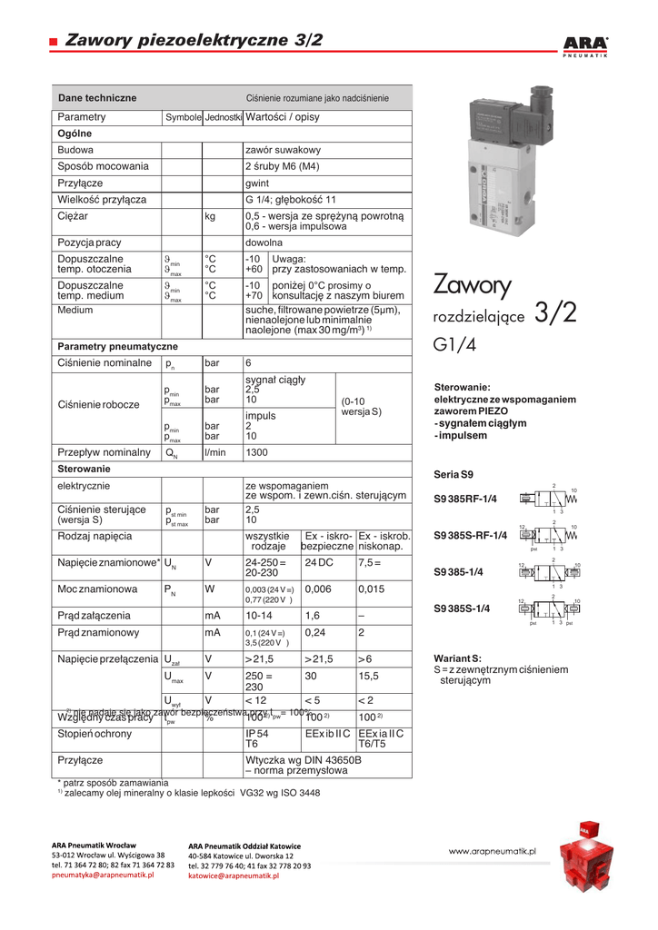 Zawory piezoelektryczne 3/2 Dane techniczne Parametry CiÊnienie rozumiane jako nadciÊnienie Symbole Jednostki WartoÊci / opisy Ogólne Budowa zawór suwakowy Sposób mocowania 2 Êruby M6 (M4) Przy∏àcze gwint WielkoÊç przy∏àcza G 1/4; g∏´bokoÊç 11 Ci´˝ar kg Pozycja pracy 0,5 - wersja ze spr´˝ynà powrotnà 0,6 - wersja impulsowa dowolna Dopuszczalne temp. otoczenia ϑmin ϑmax °C °C -10 Uwaga: +60 przy zastosowaniach w temp. Dopuszczalne temp. medium Medium ϑmin ϑmax °C °C -10 poni˝ej 0°C prosimy o +70 konsultacj´ z naszym biurem suche, filtrowane powietrze (5µm), nienaolejone lub minimalnie naolejone (max 30 mg/m3) 1) CiÊnienie robocze Przep∏yw nominalny pn bar 6 pmin pmax bar bar sygna∏ ciàg∏y 2,5 10 pmin pmax bar bar impuls 2 10 QN l/min 1300 bar bar ze wspomaganiem ze wspom. i zewn.ciÊn. sterujàcym 2,5 10 (0-10 wersja S) Sterowanie pst min pst max Sterowanie: elektryczne ze wspomaganiem zaworem PIEZO - sygna∏em ciàg∏ym - impulsem wszystkie rodzaje Ex - iskro- Ex - iskrob. bezpieczne niskonap. Napi´cie znamionowe* UN V 24-250 = 20-230 24 DC 7,5 = Moc znamionowa W 0,003 (24 V =) 0,77 (220 V ) 0,006 0,015 PN 10 1 3 2 10 S9 385S-RF-1/4 pst 1 3 2 12 10 S9 385-1/4 1 3 2 12 Pràd za∏àczenia mA 10-14 1,6 – Pràd znamionowy mA 0,1 (24 V =) 3,5 (220 V ) 0,24 2 Napi´cie prze∏àczenia Uza∏ V > 21,5 > 21,5 >6 250 = 30 230 Uwy∏ V < 12 <5 2) nie nadaje si´ jako zawór bezpieczeƒstwa przy2)tpw= 100% 2) Wzgl´dny czas pracy tpw % 100 100 Umax 2 S9 385RF-1/4 12 Rodzaj napi´cia V 15,5 <2 100 2) Stopieƒ ochrony IP 54 T6 Przy∏àcze Wtyczka wg DIN 43650B – norma przemys∏owa EEx ib II C EEx ia II C T6/T5 * patrz sposób zamawiania zalecamy olej mineralny o klasie lepkoÊci VG32 wg ISO 3448 1) 3/2 Seria S9 elektrycznie CiÊnienie sterujàce (wersja S) rozdzielajàce G1/4 Parametry pneumatyczne CiÊnienie nominalne Zawory 10 S9 385S-1/4 pst 1 3 pst Wariant S: S = z zewn´trznym ciÊnieniem sterujàcym Zawory piezoelektryczne 3/2 Wymiary (mm) 32 72 1,6 22 ca.50 40 30 G1/8 12 (10) 52 41 28,5 * 25 5,5 84 3(1) 10 (12) 11 o 7,5 o 4,2 G 1/4 1(3) 44 2 ** 22 47 ca. ok.204 204 pst pst 4,5 6,5 6 * ca.50 ok. 50 tylko dla typów S9 385-1/4 S9 385S-1/4 1,6 40 * r´czne sterowanie (w razie potrzeby) ** ciÊnienie ster. pst tylko dla typu S9 385S 72 Sposób zamawiania Sterowanie Powrót Symbol Sposób zamawiania Nr katalogowy Typ 2 elektryczne sygna∏em ciàg∏ym powrót spr´˝ynà 10 S9 385RF-1/4-. PS 13204-..6A S9 385S-RF-1/4-. PS 13205-..6A S9 385-1/4-. PS 13200-..6A S9 385S-1/4-. PS 13202-..6A 1 3 2 12 10 z zewn.ciÊn.sterujàcym powrót spr´˝ynà pst 1 3 2 elektryczne impulsem 12 elektrycznie impulsem 10 1 3 2 12 z zewn.ciÊn.sterujàcym z zewn. ciÊnieniem sterujàcym Wersja Standardowa Specjalna 10 pst Napi´cie znamion. Klucz 1 3 pst Nr kodu 24-250V = 20-230V A* 13 24V = Ex E 21 7,5V = Ex N 51 24V = D 30 wykonanie zaworu pilotujàcego w wersji NO na zapytanie * Uwaga: ze wzgl´du na niewielkà moc obcià˝enia, pràdy resztkowe i up∏ywu, które sà wi´ksze od pràdu obcià˝enia, mogà doprowadziç do niezamierzonego zadzia∏ania zaworu.
