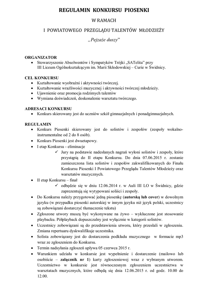 REGULAMIN KONKURSU PIOSENKI W RAMACH I POWIATOWEGO PRZEGLĄDU TALENTÓW MŁODZIEŻY „Pejzaże duszy” ORGANIZATOR Stowarzyszenie Absolwentów i Sympatyków Trójki „SATelita” przy III Liceum Ogólnokształcącym im. Marii Skłodowskiej – Curie w Świdnicy. CEL KONKURSU Kształtowanie wyobraźni i aktywności twórczej. Kształtowanie wrażliwości muzycznej i aktywności twórczej młodzieży. Ujawnienie oraz promocja rodzimych talentów Wymiana doświadczeń, doskonalenie warsztatu twórczego. ADRESACI KONKURSU Konkurs skierowany jest do uczniów szkół gimnazjalnych i ponadgimnazjalnych. REGULAMIN Konkurs Piosenki skierowany jest do solistów i zespołów (zespoły wokalnoinstrumentalne od 2 do 8 osób). Konkurs Piosenki jest dwuetapowy. I etap Konkursu - eliminacje Jury na podstawie nadesłanych nagrań wyłoni solistów i zespoły, które przystąpią do II etapu Konkursu. Do dnia 07.06.2015 r. zostanie zamieszczona lista solistów i zespołów zakwalifikowanych do Finału Konkursu Piosenki I Powiatowego Przeglądu Talentów Młodzieży oraz warsztatów muzycznych. II etap Konkursu – finał odbędzie się w dniu 12.06.2014 r. w Auli III LO w Świdnicy, gdzie zaprezentują się wytypowani soliści i zespoły. Do Konkursu należy przygotować jedną piosenkę (autorską lub cover) w dowolnym języku (w przypadku piosenki autorskiej w innym języku niż język polski, uczestnicy są zobowiązani dostarczyć tłumaczenie tekstu) Zgłoszone utwory muszą być wykonywane na żywo – wykluczone jest stosowanie playbacku. Półplayback dopuszczalny jest wyłącznie w kategorii solistów. Uczestnicy zobowiązani są do przedstawienia utworu, który przesłali w zgłoszeniu. Zmiana repertuaru dyskwalifikuje uczestnika. Solista zobowiązany jest do dostarczenia podkładu muzycznego w formacie mp3 wraz ze zgłoszeniem do Konkursu. Termin nadsyłania zgłoszeń upływa 05 czerwca 2015 r. Warunkiem udziału w konkursie jest wypełnienie i dostarczenie (mailowo lub osobiście – załącznik nr 1) karty zgłoszeniowej wraz z wybranym utworem. Uczestnictwo w konkursie jest równoczesnym zgłoszeniem uczestnictwa w warsztatach muzycznych, które odbędą się dnia 12.06.2015 r. od godz. 10.00 do 12.00. Organizatorzy nie odsyłają materiałów nadesłanych wraz ze zgłoszeniem. Występy będą oceniane w dwóch kategoriach oraz podkategoriach: SOLIŚCI Gimnazjum Szkoły ponadgimnazjalne ZESPOŁY Gimnazjum Szkoły ponadgimnazjalne Przesłuchania konkursowe są otwarte dla publiczności. Laureaci Konkursu są zobowiązani do udziału w Koncercie Laureatów, który odbędzie się 13 czerwca 2015 r., o godz. 12.00. Organizatorzy zapewniają Uczestnikom Konkursu obsługę techniczną, aparaturę nagłaśniającą, pianino cyfrowe. Warunkiem udziału w konkursie jest załączenie do przesłanego zgłoszenia, pisemnego oświadczenia prawnych opiekunów autora o wyrażeniu zgody na przetwarzanie danych osobowych podopiecznego dla potrzeb niezbędnych dla realizacji konkursu, zgodnie z ustawą z dnia 29 sierpnia 1997 roku o ochronie danych osobowych (Dz. U. z 2002r. Nr 101, poz.926, z późn. zm.) (Załącznik nr 2). W przypadku zgłoszenia do konkursu piosenki autorskiej: jest związane z nieodpłatnym przeniesieniem autorskich praw majątkowych do piosenki na rzecz Organizatora, zgodnie z przepisami ustawy z dnia 4 lutego 1994 r. o prawie autorskim i prawach pokrewnych (Dz. U. z 2006 r. Nr 90, poz. 631, z późn. zm.), oraz zgody na udostępnienie nagrania w Internecie na stronach, których administratorem jest Organizator. Warunkiem udziału w konkursie jest załączenie do przesłanego nagrania, pisemnego oświadczenia prawnych opiekunów autora o przeniesieniu praw autorskich na Organizatora konkursu, według załączonego wzoru (Załącznik nr 2). Naruszenie przez uczestnika konkursu któregokolwiek z warunków konkursu oznaczać będzie dyskwalifikację lub utratę prawa do nagrody. Jury powołane przez Organizatora, spośród przekazanych prac wyłoni laureatów konkursu. Rozstrzygnięcie jury jest ostateczne (od werdyktu nie przysługuje odwołanie). Jury ma prawo do przyznania dodatkowych nagród, jak i również prawo do nieprzyznania nagrody. O podziale nagród decyduje jury. Kryteria oceny: walory głosowe, tematyka piosenki dostosowana do wieku uczestnika, interpretacja, wyczucie rytmu, muzykalność, ogólny wyraz artystyczny. Biorąc udział w konkursie, uczestnik akceptuje jego regulamin. W sprawach spornych, nieujętych w regulaminie, decyzję podejmują organizatorzy. Zgłoszenie do konkursu (załącznik nr 1,2) należy przesłać drogą elektroniczną na adres organizatora: [email protected] lub w formie papierowej (decyduje data stempla pocztowego) na adres: Stowarzyszenie Absolwentów i Sympatyków Trójki „SATelita” ul. Kościelna 32, 58-100 Świdnica z dopiskiem KONKURS PIOSENKI do 05 czerwca 2015 roku. Konkurs odbędzie się 12 czerwca 2015 roku w siedzibie III Liceum Ogólnokształcącego w Świdnicy, ul. Kościelna 32, o godz. 12.00. Rejestracja konkursowa i warsztatowa rozpocznie się 12 czerwca 2015 roku, w holu siedziby organizatora, od godziny 9.00. Gala konkursowa i uroczystość wręczenia nagród odbędzie się 13 czerwca 2015 roku o godzinie 12.00 na Pikniku Edukacyjnym III LO „Nastrójka”, edycja II „Pejzaże duszy”. Warunkiem odebrania nagrody jest obecność na uroczystości. Załącznik nr 1 KARTA ZGŁOSZENIOWA UCZESTNIKA KONKURSU PIOSENKI W RAMACH I POWIATOWEGO PRZEGLĄDU TALENTÓW MŁODZIEŻY Stowarzyszenie Absolwentów i Sympatyków Trójki „SATelita” Ul. Kościelna 32 58-100 Świdnica [email protected] 1. 2. 3. 4. Imię i nazwisko uczestnika konkursu: ……………………………………………….. Adres uczestnika konkursu: ………………………………………………………….. Telefon kontaktowy: …………………………………………………………………. Szkoła, klasa do jakiej uczęszcza uczest