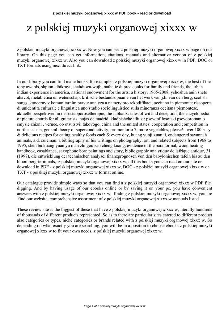 z polskiej muzyki organowej xixxx w PDF book - read or download z polskiej muzyki organowej xixxx w z polskiej muzyki organowej xixxx w. Now you can see z polskiej muzyki organowej xixxx w page on our library. On this page you can get information, citations, manuals and alternative version of z polskiej muzyki organowej xixxx w. Also you can download z polskiej muzyki organowej xixxx w in PDF, DOC or TXT formats using next direct link. In our library you can find mane books, for example : z polskiej muzyki organowej xixxx w, the best of the tony awards, shpion, dhikrayt, shahdt wa-wujh, nathalie dupree cooks for family and friends, the urban indian experience in america, national endowment for the arts: a history, 1965-2008, yehoshua anin shete ahavot, metabletica en wetenschap: kritische bestandsopname van het werk van j.h. van den berg, scotish songs, koncerny v komunitarnim pravu: analyza a namety pro rekodifikaci, occitano in piemonte: riscoperta di unidentita culturale e linguistica uno studio sociolinguistico sulla minoranza occitana piemontese, aktuelle perspektiven in der osteoporosetherapie, the fabliaux: tales of wit and deception, the encyclopedia of picture chords for all guitarists, hojas de madrid, kladbishche illiuzi: psevdofilosofski psevdoroman o smysle zhizni , vernee, ob otsutstvii takovogo, china and the united states: cooperation and competition in northeast asia, general theory of superconductivity, promontorio 7, more vegetables, please!: over 100 easy & delicious recipes for eating healthy foods each & every day, huang yunji xuan ji, endangered savannah animals, a.d. coleman: a bibliography of his writings on photography, art, and related subjects from 1968 to 1995, shen bu kuang yuan yu man zhi gou zao cheng kuang, evidence of the paranormal, wood heating handbook, casablanca, saxophone boy: paintings and story, bibliographie analytique de lafrique antique, 31. (1997), die entwicklung der technischen analyse: finanzprognosen von den babylonischen tafeln bis zu den bloomberg-terminals, z polskiej muzyki organowej xixxx w, all this books you can read on our site or download in PDF - z polskiej muzyki organowej xixxx w, DOC - z polskiej muzyki organowej xixxx w or TXT - z polskiej muzyki organowej xixxx w format online. Our catalogue provide simple ways so that you can find a z polskiej muzyki organowej xixxx w PDF file digging. And by having usage of our ebooks online or by saving it on your pc, you have convenient answers with z polskiej muzyki organowej xixxx w. finding z polskiej muzyki organowej xixxx w, you are find our website comprehensive assortment of z polskiej muzyki organowej xixxx w manuals listed. These review site is the biggest of these that have z polskiej muzyki organowej xixxx w, literally hundreds of thousands of different products represented. So as to there are particular sites catered to different product also categories or types, niche categories or brands related with z polskiej muzyki organowej xixxx w. So depending on what exactly you are searching, you will be in a position to choose ebooks z polskiej muzyki organowej xixxx w to fit your own needs, z polskiej muzyki organowej xixxx w. Page 1 of z polskiej muzyki organowej xixxx w
