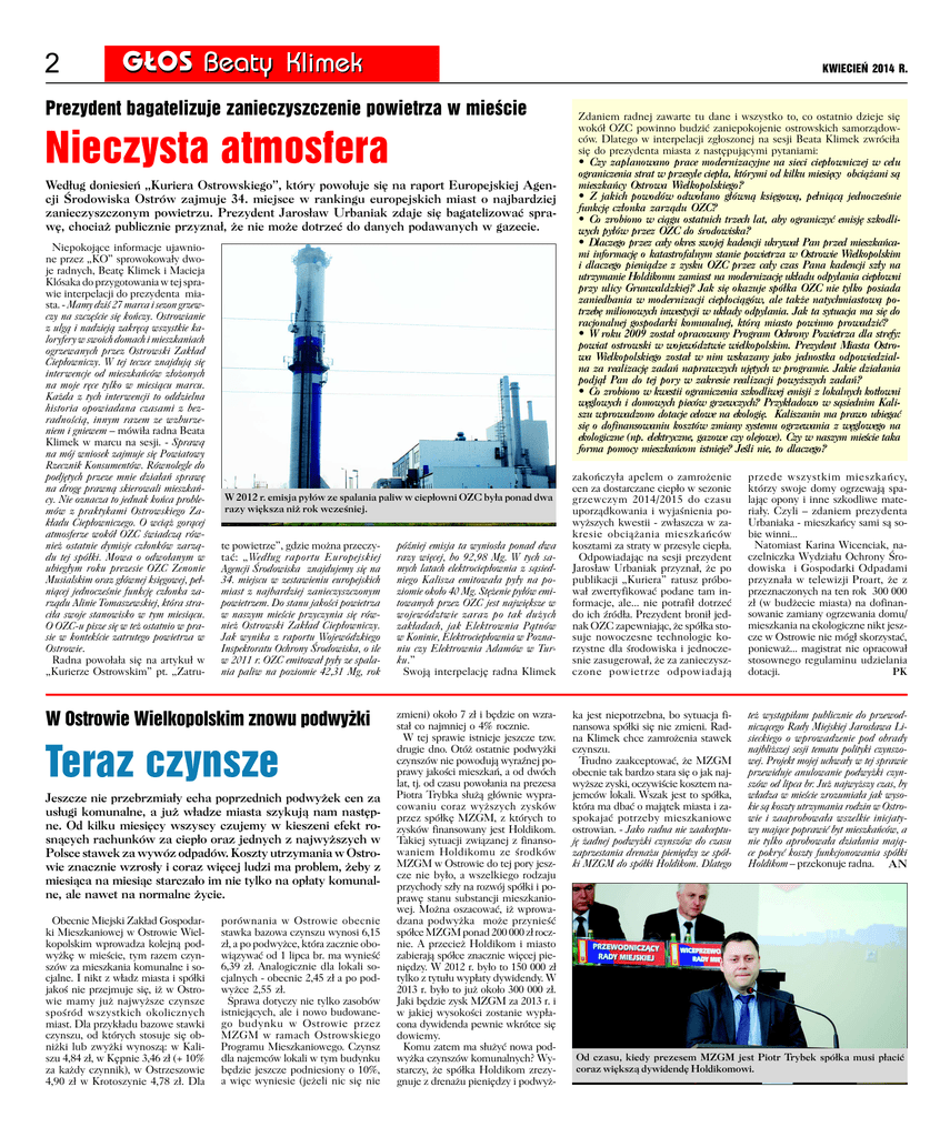 2 G£OS Beaty Klimek KWIECIEÑ 2014 R. Prezydent bagatelizuje zanieczyszczenie powietrza w miecie Nieczysta atmosfera Wed³ug doniesieñ Kuriera Ostrowskiego, który powo³uje siê na raport Europejskiej Agencji rodowiska Ostrów zajmuje 34. miejsce w rankingu europejskich miast o najbardziej zanieczyszczonym powietrzu. Prezydent Jaros³aw Urbaniak zdaje siê bagatelizowaæ sprawê, chocia¿ publicznie przyzna³, ¿e nie mo¿e dotrzeæ do danych podawanych w gazecie. Niepokoj¹ce informacje ujawnione przez KO sprowokowa³y dwoje radnych, Beatê Klimek i Macieja Klósaka do przygotowania w tej sprawie interpelacji do prezydenta miasta. - Mamy dzi 27 marca i sezon grzewczy na szczêcie siê koñczy. Ostrowianie z ulg¹ i nadziej¹ zakrêc¹ wszystkie kaloryfery w swoich domach i mieszkaniach ogrzewanych przez Ostrowski Zak³ad Ciep³owniczy. W tej teczce znajduj¹ siê interwencje od mieszkañców z³o¿onych na moje rêce tylko w miesi¹cu marcu. Ka¿da z tych interwencji to oddzielna historia opowiadana czasami z bezradnoci¹, innym razem ze wzburzeniem i gniewem mówi³a radna Beata Klimek w marcu na sesji. - Spraw¹ na mój wniosek zajmuje siê Powiatowy Rzecznik Konsumentów. Równolegle do podjêtych przeze mnie dzia³añ sprawê na drogê prawn¹ skierowali mieszkañcy. Nie oznacza to jednak koñca problemów z praktykami Ostrowskiego Zak³adu Ciep³owniczego. O wci¹¿ gor¹cej atmosferze wokó³ OZC wiadcz¹ równie¿ ostatnie dymisje cz³onków zarz¹du tej spó³ki. Mowa o odwo³anym w ubieg³ym roku prezesie OZC Zenonie Musialskim oraz g³ównej ksiêgowej, pe³ni¹cej jednoczenie funkcjê cz³onka zarz¹du Alinie Tomaszewskiej, która straci³a swoje stanowisko w tym miesi¹cu. O OZC-u pisze siê w te¿ ostatnio w prasie w kontekcie zatrutego powietrza w Ostrowie. Radna powo³a³a siê na artyku³ w Kurierze Ostrowskim pt. Zatru- W 2012 r. emisja py³ów ze spalania paliw w ciep³owni OZC by³a ponad dwa razy wiêksza ni¿ rok wczeniej. te powietrze, gdzie mo¿na przeczytaæ: Wed³ug raportu Europejskiej Agencji rodowiska znajdujemy siê na 34. miejscu w zestawieniu europejskich miast z najbardziej zanieczyszczonym powietrzem. Do stanu jakoci powietrza w naszym miecie przyczynia siê równie¿ Ostrowski Zak³ad Ciep³owniczy. Jak wynika z raportu Wojewódzkiego Inspektoratu Ochrony rodowiska, o ile w 2011 r. OZC emitowa³ py³y ze spalania paliw na poziomie 42,31 Mg, rok W Ostrowie Wielkopolskim znowu podwy¿ki Teraz czynsze Jeszcze nie przebrzmia³y echa poprzednich podwy¿ek cen za us³ugi komunalne, a ju¿ w³adze miasta szykuj¹ nam nastêpne. Od kilku miesiêcy wszyscy czujemy w kieszeni efekt rosn¹cych rachunków za ciep³o oraz jednych z najwy¿szych w Polsce stawek za wywóz odpadów. Koszty utrzymania w Ostrowie znacznie wzros³y i coraz wiêcej ludzi ma problem, ¿eby z miesi¹ca na miesi¹c starcza³o im nie tylko na op³aty komunalne, ale nawet na normalne ¿ycie. Obecnie Miejski Zak³ad Gospodarki Mieszkaniowej w Ostrowie Wielkopolskim wprowadza kolejn¹ podwy¿kê w miecie, tym razem czynszów za mieszkania komunalne i socjalne. I nikt z w³adz miasta i spó³ki jako nie przejmuje siê, i¿ w Ostrowie mamy ju¿ najwy¿sze czynsze sporód wszystkich okolicznych miast. Dla przyk³adu bazowe stawki czynszu, od których stosuje siê obni¿ki lub zwy¿ki wynosz¹: w Kaliszu 4,84 z³, w Kêpnie 3,46 z³ (+ 10% za ka¿dy czynnik), w Ostrzeszowie 4,90 z³ w Krotoszynie 4,78 z³. Dla porównania w Ostrowie obecnie stawka bazowa czynszu wynosi 6,15 z³, a po podwy¿ce, która zacznie obowi¹zywaæ od 1 lipca br. ma wynieæ 6,39 z³. Analogicznie dla lokali socjalnych - obecnie 2,45 z³ a po podwy¿ce 2,55 z³. Sprawa dotyczy nie tylko zasobów istniej¹cych, ale i nowo budowanego budynku w Ostrowie przez MZGM w ramach Ostrowskiego Programu Mieszkaniowego. Czynsz dla najemców lokali w tym budynku bêdzie jeszcze podniesiony o 10%, a wiêc wyniesie (je¿eli nic siê nie póniej emisja ta wynios³a ponad dwa razy wiêcej, bo 92,98 Mg. W tych samych latach elektrociep³ownia z s¹siedniego Kalisza emitowa³a py³y na poziomie oko³o 40 Mg. Stê¿enie py³ów emitowanych przez OZC jest najwiêksze w województwie zaraz po tak du¿ych zak³adach, jak Elektrownia P¹tnów w Koninie, Elektrociep³ownia w Poznaniu czy Elektrownia Adamów w Turku. Swoj¹ interpelacjê radna Klimek zmieni) oko³o 7 z³ i bêdzie on wzrasta³ co najmniej o 4% rocznie. W tej sprawie istnieje jeszcze tzw. drugie dno. Otó¿ ostatnie podwy¿ki czynszów nie powoduj¹ wyranej poprawy jakoci mieszkañ, a od dwóch lat, tj. od czasu powo³ania na prezesa Piotra Trybka s³u¿¹ g³ównie wypracowaniu coraz wy¿szych zysków przez spó³kê MZGM, z których to zysków finansowany jest Holdikom. Takiej sytuacji zwi¹zanej z finansowaniem Holdikomu ze rodków MZGM w Ostrowie do tej pory jeszcze nie by³o, a wszelkiego rodzaju przychody sz³y na rozwój spó³ki i poprawê stanu substancji mieszkaniowej. Mo¿na oszacowaæ, i¿ wprowadzana podwy¿ka mo¿e przynieæ spó³ce MZGM ponad 200 000 z³ rocznie. A przecie¿ Holdikom i miasto zabieraj¹ spó³ce znacznie wiêcej pieniêdzy. W 2012 r. by³o to 150 000 z³ tylko z tytu³u wyp³aty dywidendy. W 2013 r. by³o to ju¿ oko³o 300 000 z³. Jaki bêdzie zysk MZGM za 2013 r. i w jakiej wysokoci zostanie wyp³acona dywidenda pewnie wkrótce siê dowiemy. Komu zatem ma s³u¿yæ nowa podwy¿ka czynszów komunalnych? Wystarczy, ¿e spó³ka Holdikom zrezygnuje z drena¿u pieniêdzy i podwy¿- Zdaniem radnej zawarte tu dane i wszystko to, co ostatnio dzieje siê wokó³ OZC powinno budziæ zaniepokojenie ostrowskich samorz¹dowców. Dlatego w interpelacji zg³oszonej na sesji Beata Klimek zwróci³a siê do prezydenta miasta z nastêpuj¹cymi pytaniami: Czy zaplanowano prace modernizacyjne na sieci ciep³owniczej w celu ograniczenia strat w przesyle ciep³a, którymi od kilku miesiêcy obci¹¿ani s¹ mieszkañcy Ostrowa Wielkopolskiego? Z jakich powodów odwo³ano