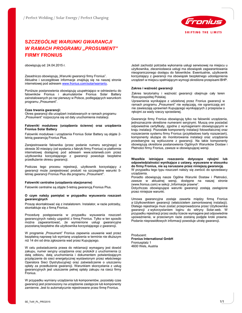 SZCZEGÓLNE WARUNKI GWARANCJI W RAMACH PROGRAMU „PROSUMENT” FIRMY FRONIUS obowiązują od: 24.04.2015 r. Zasadniczo obowiązują „Warunki gwarancji firmy Fronius”. Aktualne i szczegółowe informacje znajdują się na naszej stronie internetowej pod adresem www.fronius.com/solar/warranty. Poniższe postanowienia obowiązują uzupełniająco w odniesieniu do falowników Fronius i akumulatorów Fronius Solar Battery zainstalowanych po raz pierwszy w Polsce, podlegających warunkom programu „Prosument”. Czas trwania gwarancji: Okres gwarancji dla urządzeń instalowanych w ramach programu „Prosument” rozpoczyna się od daty uruchomienia instalacji. Falowniki modułowe (urządzenia ścienne) oraz urządzenia Fronius Solar Battery Falowniki modułowe i urządzenia Fronius Solar Battery są objęte 2letnią gwarancją Fronius Plus. Zarejestrowanie falownika (przez podanie numeru seryjnego) w okresie 30 miesięcy (od wysłania z fabryki firmy Fronius) w platformie internetowej dostępnej pod adresem www.solarweb.com przez użytkownika korzystającego z gwarancji powoduje bezpłatne przedłużenie okresu gwarancji. Podczas tego procesu rejestracji, użytkownik korzystający z gwarancji może zarejestrować produkt na szczególne warunki 5letniej gwarancji Fronius Plus dla programu „Prosument". Falowniki centralne (urządzenia stacjonarne) Falowniki centralne są objęte 5-letnią gwarancją Fronius Plus. O czym należy pamiętać w przypadku wysuwania roszczeń gwarancyjnych Proszę skontaktować się z instalatorem. Instalator, w razie potrzeby, skontaktuje się z firmą Fronius. Procedurę postępowania w przypadku wysuwania roszczeń gwarancyjnych należy uzgodnić z firmą Fronius. Tylko w ten sposób można zagwarantować, że wymienione usługi gwarancyjne pozostaną bezpłatne dla użytkownika korzystającego z gwarancji. W programie „Prosument” Fronius zapewnia usuwanie wad przez bezpłatną naprawę lub wymianę urządzenia w terminie nie dłuższym niż 14 dni od dnia zgłoszenia wad przez Kupującego. W celu poświadczenia prawa do reklamacji wymagany jest dowód zakupu, numer seryjny urządzenia oraz protokół z uruchomienia (z datą odbioru, datą uruchomienia i dokumentem potwierdzającym przyłączenie do sieci energetycznej wystawionym przez właściwego Operatora Sieci Dystrybucyjnej) oraz zaświadczenie o uiszczeniu opłaty za przedłużenie gwarancji. Warunkiem skorzystania z usług gwarancyjnych jest uiszczenie pełnej opłaty zakupu na rzecz firmy Fronius. Jeżeli zachodzi potrzeba wykonania usługi serwisowej na miejscu u użytkownika, zleceniodawca usługi ma obowiązek zagwarantowania nieograniczonego dostępu do falowników. Ewentualnie, użytkownik korzystający z gwarancji ma obowiązek bezpłatnego udostępnienia urządzeń w miejscu spełniającym wymogi określone przepisami BHP. Zakres i ważność gwarancji Zakres terytorialny i ważność gwarancji obejmuje cały teren Rzeczpospolitej Polskiej. Uprawnienia wynikające z udzielonej przez Fronius gwarancji w ramach programu „Prosument” nie wyłączają, nie ograniczają ani nie zawieszają uprawnień Kupującego wynikających z przepisów o rękojmi za wady rzeczy sprzedanej. Gwarancje firmy Fronius obowiązują tylko na falowniki urządzenia, jednoznacznie określone numerami seryjnymi. Muszą one posiadać odpowiednie certyfikaty, zgodne z wymaganiami obowiązującymi w kraju instalacji. Pozostałe komponenty instalacji fotowoltaicznej oraz rozszerzenie systemu firmy Fronius (przykładowo karty rozszerzeń), komponenty służące do monitorowania instalacji oraz urządzenia przedseryjne są wykluczone z gwarancji. Na takie komponenty obowiązują określone postanowienia Ogólnych Warunków Dostaw i Płatności firmy Fronius, zawsze w obowiązującej wersji. Wszelkie istniejące roszczenia dotyczące rękojmi lub odpowiedzialności wynikające z ustawy, wysuwane w stosunku do firmy Fronius, nie są naruszane przez niniejszą gwarancję. W przypadku tego typu roszczeń należy się zwrócić do sprzedawcy urządzenia. Ponadto obowiązują nasze Ogólne Warunki Dostaw i Płatności, zawsze w aktualnej wersji, dostępne na naszej stronie (www.fronius.com) w sekcji „Informacje prawne”. Dotychczas obowiązujące warunki gwarancji zostają zastąpione przez niniejsze warunki. Umowa gwarancyjna zostaje zawarta między firmą Fronius a Użytkownikiem gwarancji (właścicielem zamontowanej instalacji). Dlatego rejestracja musi zostać przeprowadzona przez Użytkownika gwarancji z wykorzystaniem loginu do witryny Solar.web. W przypadku rejestracji przez osoby trzecie wymagane jest odpowiednie upoważnienie, w przeciwnym razie zostaną podjęte kroki prawne. Podanie nieprawidłowych informacji powoduje utratę gwarancji. Producent: Fronius International GmbH Froniusplatz 1 4600 Wels, Austria W przypadku wymiany urządzenia lub komponentów, pozostały czas gwarancji jest przenoszony na urządzenie zastępcze lub komponenty zamienne. Jest to automatycznie rejestrowane przez firmę Fronius. SE_ToW_PL_PRO2015 1/1