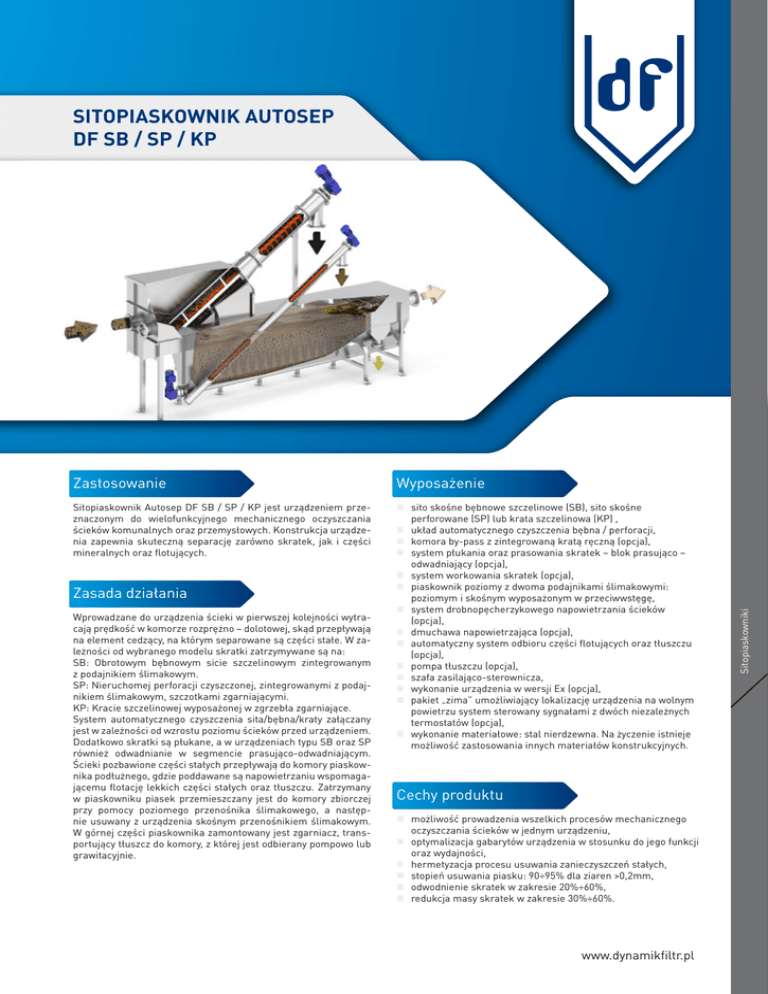 Zastosowanie Wyposażenie Sitopiaskownik Autosep DF SB / SP / KP jest urządzeniem przeznaczonym do wielofunkcyjnego mechanicznego oczyszczania ścieków komunalnych oraz przemysłowych. Konstrukcja urządzenia zapewnia skuteczną separację zarówno skratek, jak i części mineralnych oraz flotujących. sito skośne bębnowe szczelinowe (SB), sito skośne perforowane (SP) lub krata szczelinowa (KP) , układ automatycznego czyszczenia bębna / perforacji, komora by-pass z zintegrowaną kratą ręczną (opcja), system płukania oraz prasowania skratek – blok prasująco – odwadniający (opcja), system workowania skratek (opcja), piaskownik poziomy z dwoma podajnikami ślimakowymi: poziomym i skośnym wyposażonym w przeciwwstęgę, system drobnopęcherzykowego napowietrzania ścieków (opcja), dmuchawa napowietrzająca (opcja), automatyczny system odbioru części flotujących oraz tłuszczu (opcja), pompa tłuszczu (opcja), szafa zasilająco-sterownicza, wykonanie urządzenia w wersji Ex (opcja), pakiet „zima” umożliwiający lokalizację urządzenia na wolnym powietrzu system sterowany sygnałami z dwóch niezależnych termostatów (opcja), wykonanie materiałowe: stal nierdzewna. Na życzenie istnieje możliwość zastosowania innych materiałów konstrukcyjnych. Zasada działania Wprowadzane do urządzenia ścieki w pierwszej kolejności wytracają prędkość w komorze rozprężno – dolotowej, skąd przepływają na element cedzący, na którym separowane są części stałe. W zależności od wybranego modelu skratki zatrzymywane są na: SB: Obrotowym bębnowym sicie szczelinowym zintegrowanym z podajnikiem ślimakowym. SP: Nieruchomej perforacji czyszczonej, zintegrowanymi z podajnikiem ślimakowym, szczotkami zgarniającymi. KP: Kracie szczelinowej wyposażonej w zgrzebła zgarniające. System automatycznego czyszczenia sita/bębna/kraty załączany jest w zależności od wzrostu poziomu ścieków przed urządzeniem. Dodatkowo skratki są płukane, a w urządzeniach typu SB oraz SP również odwadnianie w segmencie prasująco-odwadniającym. Ścieki pozbawione części stałych przepływają do komory piaskownika podłużnego, gdzie poddawane są napowietrzaniu wspomagającemu flotację lekkich części stałych oraz tłuszczu. Zatrzymany w piaskowniku piasek przemieszczany jest do komory zbiorczej przy pomocy poziomego przenośnika ślimakowego, a następnie usuwany z urządzenia skośnym przenośnikiem ślimakowym. W górnej części piaskownika zamontowany jest zgarniacz, transportujący tłuszcz do komory, z której jest odbierany pompowo lub grawitacyjnie. Cechy produktu możliwość prowadzenia wszelkich procesów mechanicznego oczyszczania ścieków w jednym urządzeniu, optymalizacja gabarytów urządzenia w stosunku do jego funkcji oraz wydajności, hermetyzacja procesu usuwania zanieczyszczeń stałych, stopień usuwania piasku: 90÷95% dla ziaren >0,2mm, odwodnienie skratek w zakresie 20%÷60%, redukcja masy skratek w zakresie 30%÷60%. www.dynamikfiltr.pl Sitopiaskowniki SITOPIASKOWNIK AUTOSEP DF SB / SP / KP Rysunek techniczny Specyfikacja Typ Wydajność [dm3/s] DF SB / SP 20 DF SB / SP 40 DF SB / SP 50 DF SB / SP 70 DF SB / SP 100 DF KP 20 DF KP 40 DF KP 50 DF KP 70 DF KP 100 20 40 50 70 100 20 40 50 70 100 S [mm] 850 1200 850 1200 L [mm] H [mm] 5000 6200 7200 9500 13500 4500 5700 6700 9000 13000 3500 4000 4500 4500 5000 3000 3500 4000 4500 4500 Króćce przyłączeniowe Dopływ DN Odpływ DN 150 200 250 350 400 150 200 250 350 400 200 250 300 400 450 200 250 300 400 450 Spust DN 65 80 65 80 Sito [kW] 0,55 0,55 0,75 0,75 1,10 0,55 0,55 0,75 0,75 1,10 Moce napędów Podajnik skośny [kW] 0,55 0,55 0,75 0,75 0,75 0,55 0,55 0,75 0,75 0,75 Podajnik poziomy [kW] 0,37 0,37 0,55 0,55 0,55 0,37 0,37 0,55 0,55 0,55 Podane wydajności dotyczą perforacji/szczeliny 3mm, Istnieje możliwość indywidualnego dostosowania urządzeń do wymagań Inwestora, Na życzenie udostępniane są rysunki gabarytowe urządzeń wykonane w programie AutoCAD. Rysunki szczegółowe Opcje wykonania SP SB KP www.dynamikfiltr.pl