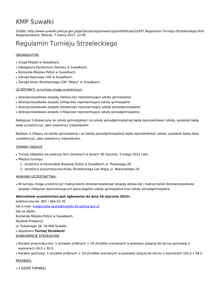 KMP Suwałki Źródło: http://www.suwalki.policja.gov.pl/po3/wydzialy/prewencja/profilaktyka/10297,Regulamin-Turnieju-Strzeleckiego.html Wygenerowano: Wtorek, 7 marca 2017, 12:45 Regulamin Turnieju Strzeleckiego ORGANIZATOR: ● Urząd Miejski w Suwałkach, ● Delegatura Kuratorium Oświaty w Suwałkach, ● Komenda Miejska Policji w Suwałkach, ● Zarząd Rejonowy LOK w Suwałkach, ● Zarząd Klubu Strzeleckiego LOK "Wigry" w Suwałkach. UCZESTNICY- w turnieju mogą uczestniczyć: ● dziesięcioosobowe zespoły (dziewcząt) reprezentujące szkoły gimnazjalne; ● dziesięcioosobowe zespoły (chłopców) reprezentujące szkoły gimnazjalne; ● dziesięcioosobowe zespoły (dziewcząt) reprezentujące szkoły ponadgimnazjalne; ● dziesięcioosobowe zespoły (chłopców) reprezentujące szkoły ponadgimnazjalne; Najlepsze 3 dziewczyny ze szkoły gimnazjalnej i ze szkoły ponadgimnazjalnej będą reprezentować szkoły, pozostali będą dalej uczestniczyć, jako zawodnicy indywidualni. Najlepsi 3 chłopcy ze szkoły gimnazjalnej i ze szkoły ponadgimnazjalnej będą reprezentować szkoły, pozostali będą dalej uczestniczyć, jako zawodnicy indywidualni. TERMIN I MIEJSCE ● Turniej odbędzie się podczas ferii zimowych w dniach 30 stycznia, 3 lutego 2012 roku. ● Miejsce turnieju: 1. strzelnica w Komendzie Miejskiej Policji w Suwałkach ul. Pułaskiego 26 2. strzelnica pneumatyczna Klubu Strzeleckiego Lok Wigry ul. Waryńskiego 24. WARUNKI UCZESTNICTWA: ● W turnieju mogą uczestniczyć maksymalnie dziesięcioosobowe zespoły dziewcząt i maksymalnie dziesięcioosobowe zespoły chłopców reprezentujących poszczególne szkoły gimnazjalne oraz szkoły ponadgimnazjalne Warunkiem uczestnictwa jest zgłoszenie do dnia 26 stycznia 2012r. telefoniczne tel. 087 / 564-15-70 lub e-mail: [email protected] lub na adres: Komenda Miejska Policji w Suwałkach Wydział Prewencji ul. Pułaskiego 26, 16-400 Suwałki z dopiskiem Turniej Strzelecki KONKURENCJE STRZELECKIE: ● Karabin pneumatyczny- 5 strzałów próbnych + 10 strzałów ocenianych w postawie stojącej do tarczy sportowej o wymiarach 45,5 x 30,5. ● Karabin sportowy- 5 strzałów próbnych + 10 strzałów ocenianych w postawie leżącej do tarczy o wymiarach 155,5 x 59,5. PRZEBIEG: ● 1 DZIEŃ TURNIEJU 1. 30.01.2012 (poniedziałek) godz. 9.00-14.30 w strzelnicy KMP w Suwałkach ul. Pułaskiego 26 - nauka strzelania, trening oraz strzelanie szkoły gimnazjalne. ● 2 DZIEŃ TURNIEJU 1. 31.01.2012 (wtorek) godz. 9.00-14.30 w strzelnicy KMP w Suwałkach ul. Pułaskiego 26 - nauka strzelania, trening oraz strzelanie szkoły ponad gimnazjalne. ● 3 DZIEŃ TURNIEJU 1. 01.02.2012 (środa) w strzelnicy pneumatycznej Klubu Strzeleckiego LOK Wigry ul. Waryńskiego 24 w Suwałkach- nauka strzelania, trening, strzelanie, szkoły gimnazjalne. ● 4 DZIEŃ TURNIEJU 1. 02.02.2012 (czwartek) w strzelnicy pneumatycznej Klubu Strzeleckiego LOK Wigry ul. Waryńskiego 24 w Suwałkachnauka strzelania, trening, strzelanie, szkoły ponadgimnazjalne. ● 5 DZIEŃ TURNIEJU 1. 03.02.2012 (piątek) - gala finałowa godz.11.00 - uroczyste ogłoszenie wyników i wręczenie pucharów, dyplomów. Nagrody: ● I. Zespołowo: 1. 1) Zespołowo - dziewczęta z gimnazjum - za I miejsce puchar, dyplom, za miejsce II i III - dyplomy, 2. 2) Zespołowo - chłopcy ze szkoły ponadgimnazjalnej - za I miejsce puchar, dyplom, za miejsce II i III - dyplomy, 3. 3) Zespołowo - chłopcy z gimnazjum - za I miejsce puchar, dyplom, za miejsce II i III - dyplomy, 4. 4) Zespołowo - chłopcy ze szkoły ponadgimnazjalnej - za I miejsce puchar, dyplom, za miejsce II i III - dyplomy. ● II. Indywidualnie: 1. 1) dziewczęta z gimnazjum - za I, II, III miejsce medal i dyplom 2. 2) dziewczęta ze szkoły ponadgimnazjalnej - za I, II, III miejsce medal i dyplom 3. 3) chłopcy z gimnazjum - za I, II, III miejsce medal i dyplom 4. 4) chłopcy ze szkoły ponadgimnazjalnej - za I, II, III miejsce medal i dyplom. ZAŁĄCZNIKI DO STRONY Regulamin konkursu 25.45 KB Ocena: 0/5 (0) Tweetnij