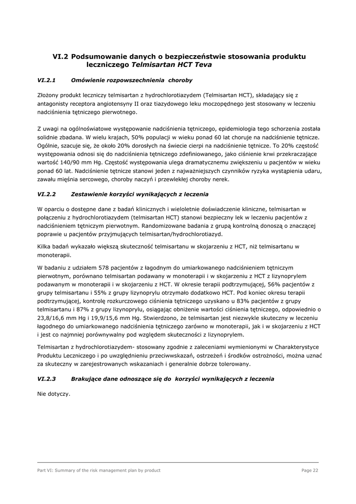 VI.2 Podsumowanie danych o bezpieczeństwie stosowania produktu leczniczego Telmisartan HCT Teva VI.2.1 Omówienie rozpowszechnienia choroby Złożony produkt leczniczy telmisartan z hydrochlorotiazydem (Telmisartan HCT), składający się z antagonisty receptora angiotensyny II oraz tiazydowego leku moczopędnego jest stosowany w leczeniu nadciśnienia tętniczego pierwotnego. Z uwagi na ogólnoświatowe występowanie nadciśnienia tętniczego, epidemiologia tego schorzenia została solidnie zbadana. W wielu krajach, 50% populacji w wieku ponad 60 lat choruje na nadciśnienie tętnicze. Ogólnie, szacuje się, że około 20% dorosłych na świecie cierpi na nadciśnienie tętnicze. To 20% częstość występowania odnosi się do nadciśnienia tętniczego zdefiniowanego, jako ciśnienie krwi przekraczające wartość 140/90 mm Hg. Częstość występowania ulega dramatycznemu zwiększeniu u pacjentów w wieku ponad 60 lat. Nadciśnienie tętnicze stanowi jeden z najważniejszych czynników ryzyka wystąpienia udaru, zawału mięśnia sercowego, choroby naczyń i przewlekłej choroby nerek. VI.2.2 Zestawienie korzyści wynikających z leczenia W oparciu o dostępne dane z badań klinicznych i wieloletnie doświadczenie kliniczne, telmisartan w połączeniu z hydrochlorotiazydem (telmisartan HCT) stanowi bezpieczny lek w leczeniu pacjentów z nadciśnieniem tętniczym pierwotnym. Randomizowane badania z grupą kontrolną donoszą o znaczącej poprawie u pacjentów przyjmujących telmisartan/hydrochlorotiazyd. Kilka badań wykazało większą skuteczność telmisartanu w skojarzeniu z HCT, niż telmisartanu w monoterapii. W badaniu z udziałem 578 pacjentów z łagodnym do umiarkowanego nadciśnieniem tętniczym pierwotnym, porównano telmisartan podawany w monoterapii i w skojarzeniu z HCT z lizynoprylem podawanym w monoterapii i w skojarzeniu z HCT. W okresie terapii podtrzymującej, 56% pacjentów z grupy telmisartanu i 55% z grupy lizynoprylu otrzymało dodatkowo HCT. Pod koniec okresu terapii podtrzymującej, kontrolę rozkurczowego ciśnienia tętniczego uzyskano u 83% pacjentów z grupy telmisartanu i 87% z grupy lizynoprylu, osiągając obniżenie wartości ciśnienia tętniczego, odpowiednio o 23,8/16,6 mm Hg i 19,9/15,6 mm Hg. Stwierdzono, że telmisartan jest niezwykle skuteczny w leczeniu łagodnego do umiarkowanego nadciśnienia tętniczego zarówno w monoterapii, jak i w skojarzeniu z HCT i jest co najmniej porównywalny pod względem skuteczności z lizynoprylem. Telmisartan z hydrochlorotiazydem- stosowany zgodnie z zaleceniami wymienionymi w Charakterystyce Produktu Leczniczego i po uwzględnieniu przeciwwskazań, ostrzeżeń i środków ostrożności, można uznać za skuteczny w zarejestrowanych wskazaniach i generalnie dobrze tolerowany. VI.2.3 Brakujące dane odnoszące się do korzyści wynikających z leczenia Nie dotyczy. Part VI: Summary of the risk management plan by product Page 22 VI.2.4 Podsumowanie zagadnień dotyczących bezpieczeństwa Ważne zidentyfikowane ryzyko Ryzyko Aktualna wiedza Zapobieganie Zakażenie krwi (Posocznica) Posocznica to ciężkie zakażenie Zaleca się monitorowanie wywołujące ogólnoustrojowe reakcje wczesnych objawów zakażenia zapalne, które może prowadzić do zgonu. krwi charakteryzujących się Do zakażenia może dojść przypadkowo ogólnoustrojową reakcją lub zgodnie z mechanizmem, dotychczas zapalną, szybkim obrzękiem niepoznanym. To niepożądane działanie skóry i błon śluzowych (obrzęk występuje rzadko (może wystąpić u 1 na naczynioruchowy). Pacjent 1000 osób) ale jest niezmiernie poważne powinien natychmiast odstawić lek i zgłosić się do lekarza. Zaburzenia czynności Układ renina- -angiotensyna- aldosteron nerek na skutek blokady (RAAS) jest układem hormonalnym, który działających na układ renina- Stosowanie dodatkowych leków układu hormonalnego reguluje ciśnienie tętnicze oraz regulującego ciśnienie gospodarkę wodną. Na skutek hamowania jest zalecane. Jeśli jednoczesne tętnicze krwi i tego układu hormonalnego, stosowanie takich środków jest gospodarkę wodną. zaobserwowano zmiany w czynności uważane za konieczne, zaleca (Zaburzenia czynności nerek u osób podatnych, zwłaszcza w się kontrolę czynności nerek. nerek w wyniku skojarzeniu z innymi lekami, które mogą Leku telmisartan z podwójnej blokady oddziaływać na ten układ. Rzadko (do 1 hydrochlorotiazydem nie wolno układu RAAS) na 1000 osób) dochodzi do ostrej stosować u pacjentów z ciężką niewydolności nerek. chorobą nerek. angiotensyna- aldosteron nie Uszkodzenie płodu Telmisartan może przenikać przez łożysko Stosowanie leku telmisartan z (Fetotoksyczność) i powodować poważne uszkodzenia w hydrochlorotiazydem nie jest rozwijającym się płodzie, takie jak zalecane we wczesnym okresie zaburzenia czynności nerek, niskie ciąży, i przeciwwskazane u ciśnienie tętnicze i zwiększone stężenie kobiet będących w ciąży ponad potasu we krwi, a nawet zgon. 3 miesiące. Ważne potencjalne ryzyka Ryzyko Aktualna wiedza (w tym, dlaczego uważane jest za potencjalne ryzyko) Nieprawidłowa czynność wątroby U pacjentów w Japonii istnieje większe prawdopodobieństwo u japońskich pacjentów wystąpienia nieprawidłowej czynności wątroby. Większość (Zwiększenie liczby zdarzeń przypadków tych działań niepożądanych zgłaszano u Japończyków. niepożądanych ze strony wątroby To działanie niepożądane należy do rzadkich i może wystąpić u 1 na u Japończyków) 1000 osób. Rozpad uszkodzonych mięśni Pacjenci leczeni antagonistami receptora angiotensyny II mogą być prążkowanych (Rabdomioliza) bardziej narażeni na wystąpienie rabdomiolizy. Niewiadomo, czy lek złożony z telmisartanu z hydrochlorotiazydem może wpływać zwiększyć ryzyko rabdomiolizy. Postępujące uszkodzenie tkanki Zgłaszano przypadki śródmiąższowej choroby płuc w związku z Part VI: Summary of the risk