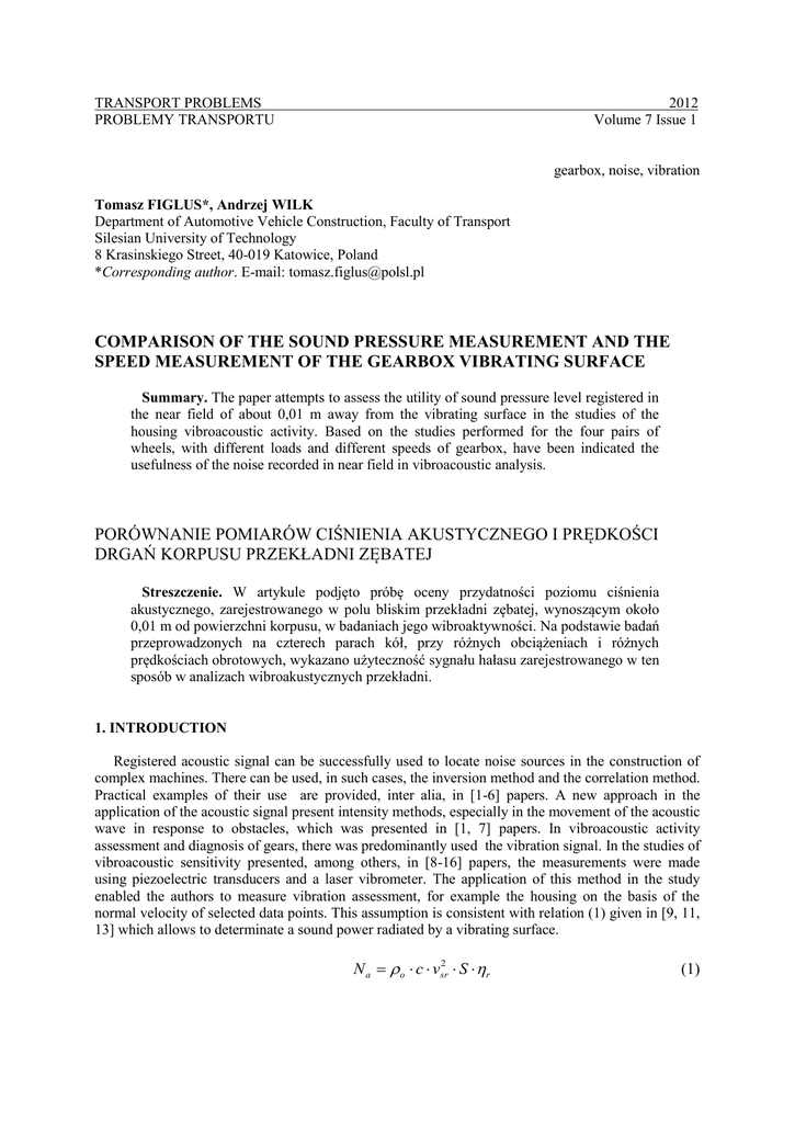 TRANSPORT PROBLEMS PROBLEMY TRANSPORTU 2012 Volume 7 Issue 1 gearbox, noise, vibration Tomasz FIGLUS*, Andrzej WILK Department of Automotive Vehicle Construction, Faculty of Transport Silesian University of Technology 8 Krasinskiego Street, 40-019 Katowice, Poland *Corresponding author. E-mail: [email protected] COMPARISON OF THE SOUND PRESSURE MEASUREMENT AND THE SPEED MEASUREMENT OF THE GEARBOX VIBRATING SURFACE Summary. The paper attempts to assess the utility of sound pressure level registered in the near field of about 0,01 m away from the vibrating surface in the studies of the housing vibroacoustic activity. Based on the studies performed for the four pairs of wheels, with different loads and different speeds of gearbox, have been indicated the usefulness of the noise recorded in near field in vibroacoustic analysis. PORÓWNANIE POMIARÓW CIŚNIENIA AKUSTYCZNEGO I PRĘDKOŚCI DRGAŃ KORPUSU PRZEKŁADNI ZĘBATEJ Streszczenie. W artykule podjęto próbę oceny przydatności poziomu ciśnienia akustycznego, zarejestrowanego w polu bliskim przekładni zębatej, wynoszącym około 0,01 m od powierzchni korpusu, w badaniach jego wibroaktywności. Na podstawie badań przeprowadzonych na czterech parach kół, przy różnych obciążeniach i różnych prędkościach obrotowych, wykazano użyteczność sygnału hałasu zarejestrowanego w ten sposób w analizach wibroakustycznych przekładni. 1. INTRODUCTION Registered acoustic signal can be successfully used to locate noise sources in the construction of complex machines. There can be used, in such cases, the inversion method and the correlation method. Practical examples of their use are provided, inter alia, in [1-6] papers. A new approach in the application of the acoustic signal present intensity methods, especially in the movement of the acoustic wave in response to obstacles, which was presented in [1, 7] papers. In vibroacoustic activity assessment and diagnosis of gears, there was predominantly used the vibration signal. In the studies of vibroacoustic sensitivity presented, among others, in [8-16] papers, the measurements were made using piezoelectric transducers and a laser vibrometer. The application of this method in the study enabled the authors to measure vibration assessment, for example the housing on the basis of the normal velocity of selected data points. This assumption is consistent with relation (1) given in [9, 11, 13] which allows to determinate a sound power radiated by a vibrating surface. N a o c vsr2 S r (1) 38 T. Figlus, A. Wilk Where: o – the density of the surrounding medium, c – the speed of sound in air, v2śr – average value of normal vibration velocity, S – the radiation surface, r – the coefficient of sound radiation The measurement is affected by an error associated with the choice of measurement points and depends, for example, on the ribbing of the measured object. Among more complex objects, it seems to be useful the sound pressure level measurements, which contain the resultant acoustic signal across the vibrating surface. The results of these studies are presented, for example in [9, 13]. Pressure signal is recorded at a distance of about 0,5 or 1 m from the source. The impact of qualitative and quantitative components of the acoustic signal comes from many other sources (causing distortion), difficult to isolate causes that often such a signal can considered only as a reference signal. The paper attempts to assess the utility of sound pressure level registered in the near field of about 0,01 m away from the vibrating surface in the studies of the housing vibroacoustic activity. 2. THE OBJECT AND METHOD OF THE STUDY The tests were performed at the FZG circulating power stand in the laboratory of transmissions systems at the Faculty of Transport at the Silesian University of Technology. The study used a measuring system consisting of a co-directional microphone, a Norsonic signal analyzer, which measured the sound pressure level at a distance of approximately 0,01 m above the central point (K7) of a ribless housing and, additionally, approximately 0,5 m above this point. At the same time, for comparative purposes, the vibration signal of this point (K7) was recorded by the laser vibrometer. According to the study presented in [13] the value of the body point of K7 vibration level may be useful to assess its vibration activity. The recording of signals was performed by using a National Instrument NI 4472 data acquisition card and a computer with the software LabView 8.6. The location of the measurement microphone together with the selected measuring point is given in Figure 1. The comparative studies recorded sound pressure level near the gearbox housing (0,01 m above the surface), in which, there were assembled 4 pairs of gears with helical teeth. The gear wheels characterized with an increasing total contact ratio εC, equal respectively: 2,24; 2,65; 3,0; 4,0 (the detailed parameters of the wheels are given in the paper [13]). The measurements were performed at a constant wheel speed of respectively n1 = 900 rpm or n2 = 1800 rpm and accelerating the gearbox speed from 300 - 3000 rpm. During the tests the applied unit load to the gearbox equaled Q1 = 1 MPa and Q2 = 2.15 MPa. a) b) microphone W1 0,5 microphone K7 0,01 W3 W2 W3 Fig. 1. The location of the microphone (a) and the selected measuring point (b) Rys. 1. Miejsce usytuowania mikrofonu pojemnościowego (a) oraz wybrany punkt pomiarowy (b) Comparison of the sound pressure measurement and the speed… 39 3. EXEMPLARY ANALYSIS RESULTS AND CONCLUSIONS On the basis of the recorded vibration signals of the K7 point was determined vibration measurement depending on: vśr2 1 n n (v i 1 i (t ))2 (2) Where: vi (t) - velocity of vibration at the time t, n - number of analysis time samples. In the case of the sound pressure level signals, there was determined the effective value. The level of vibration and sound pressure in dB was compared, assu